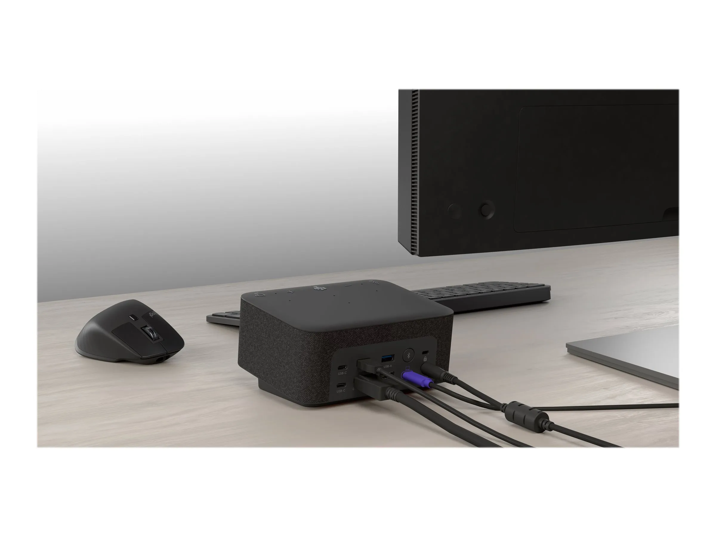 Logi Dock is an all-in-one docking station with one-touch meeting controls and a built-in speakerphone. It simplifies home office setup, reduces desktop clutter, and enhances productivity.