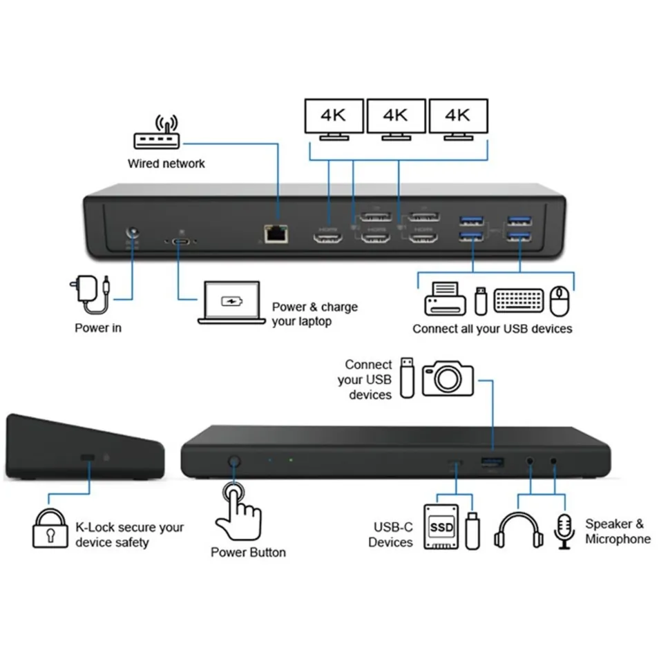 Enhance your workspace with the USB-C Triple 4K Docking Station. This versatile docking solution allows you to connect up to three 4K displays simultaneously via HDMI and DisplayPort, providing an immersive viewing experience for multitasking and productivity.