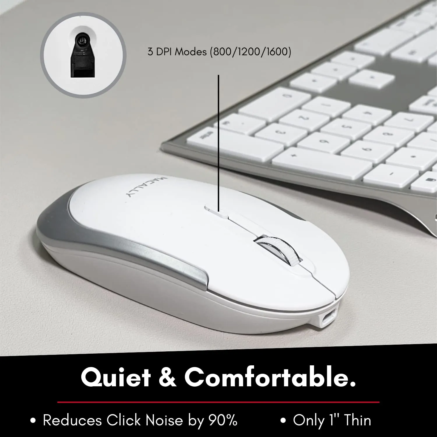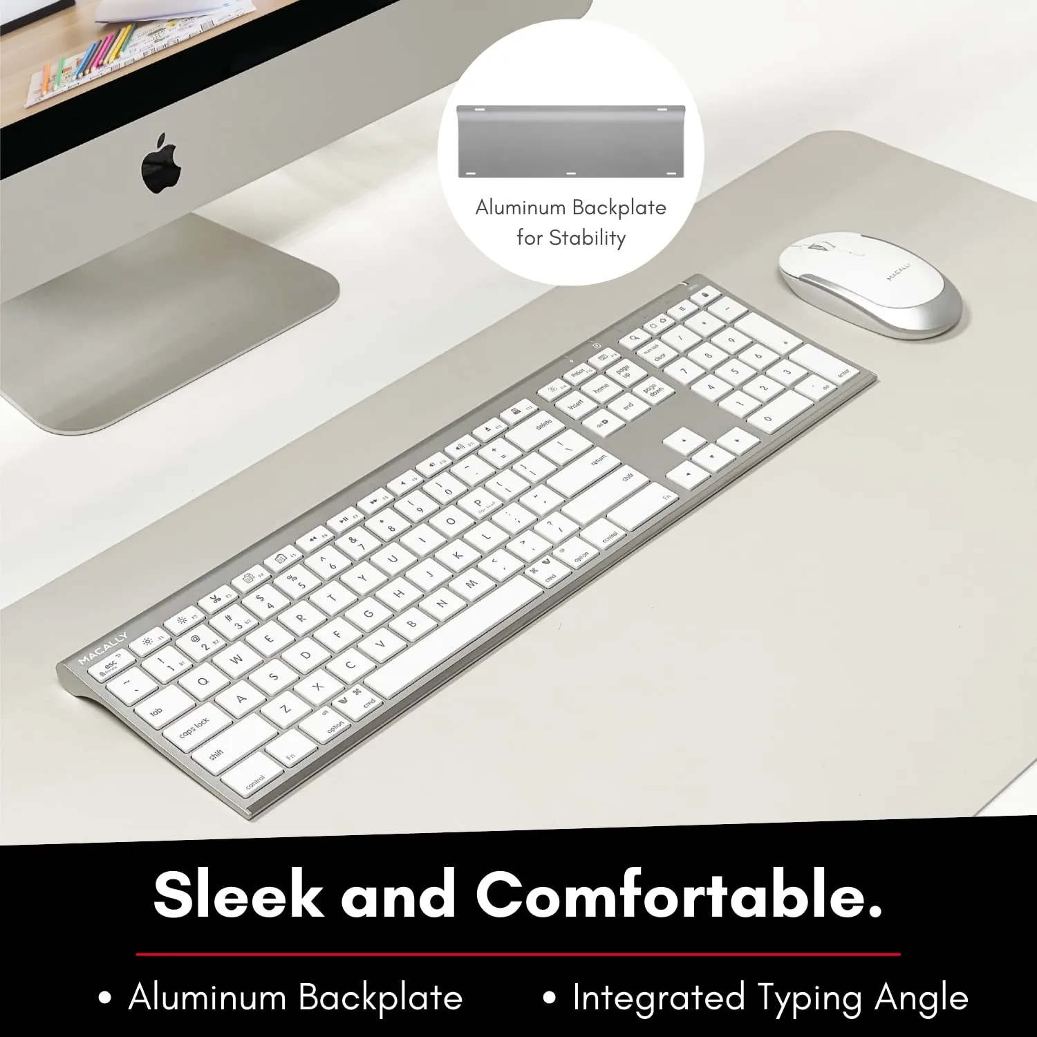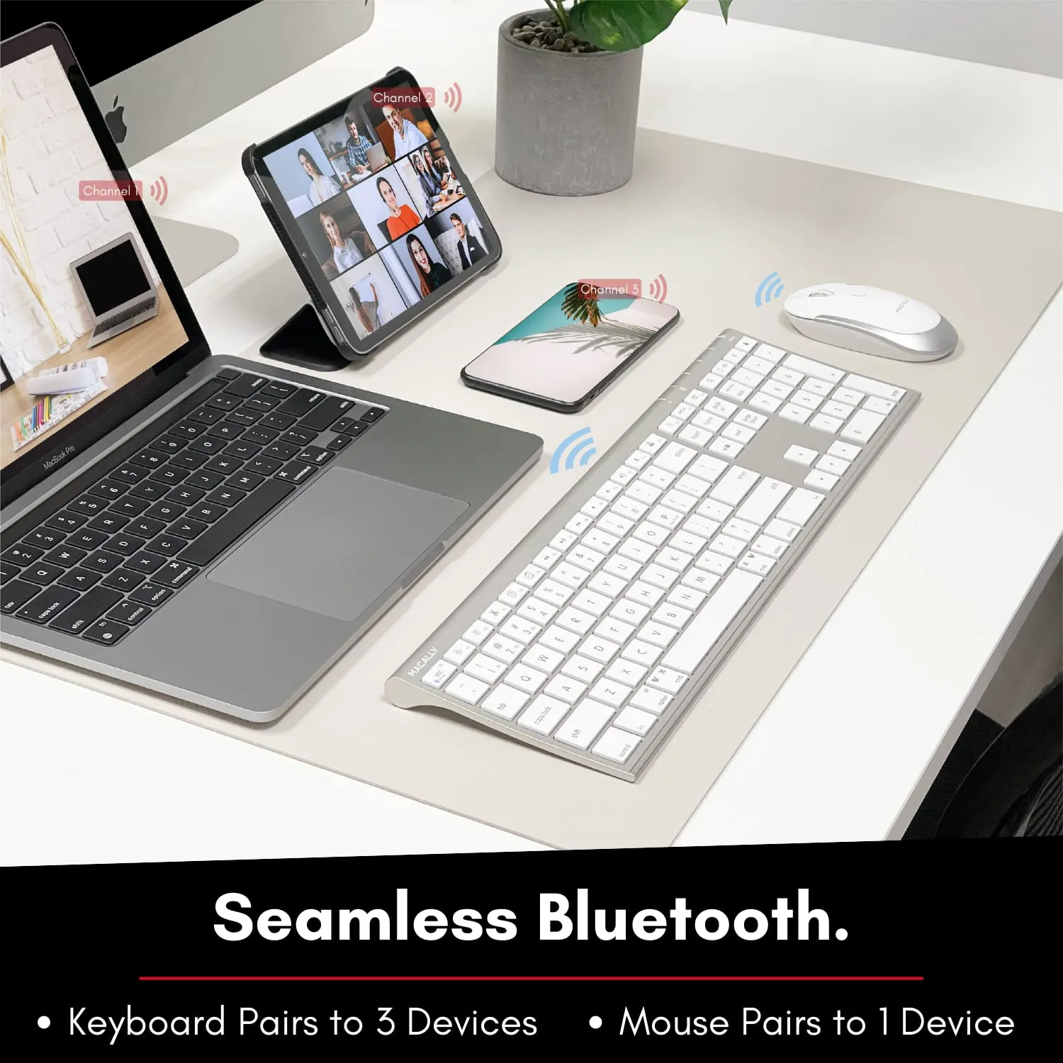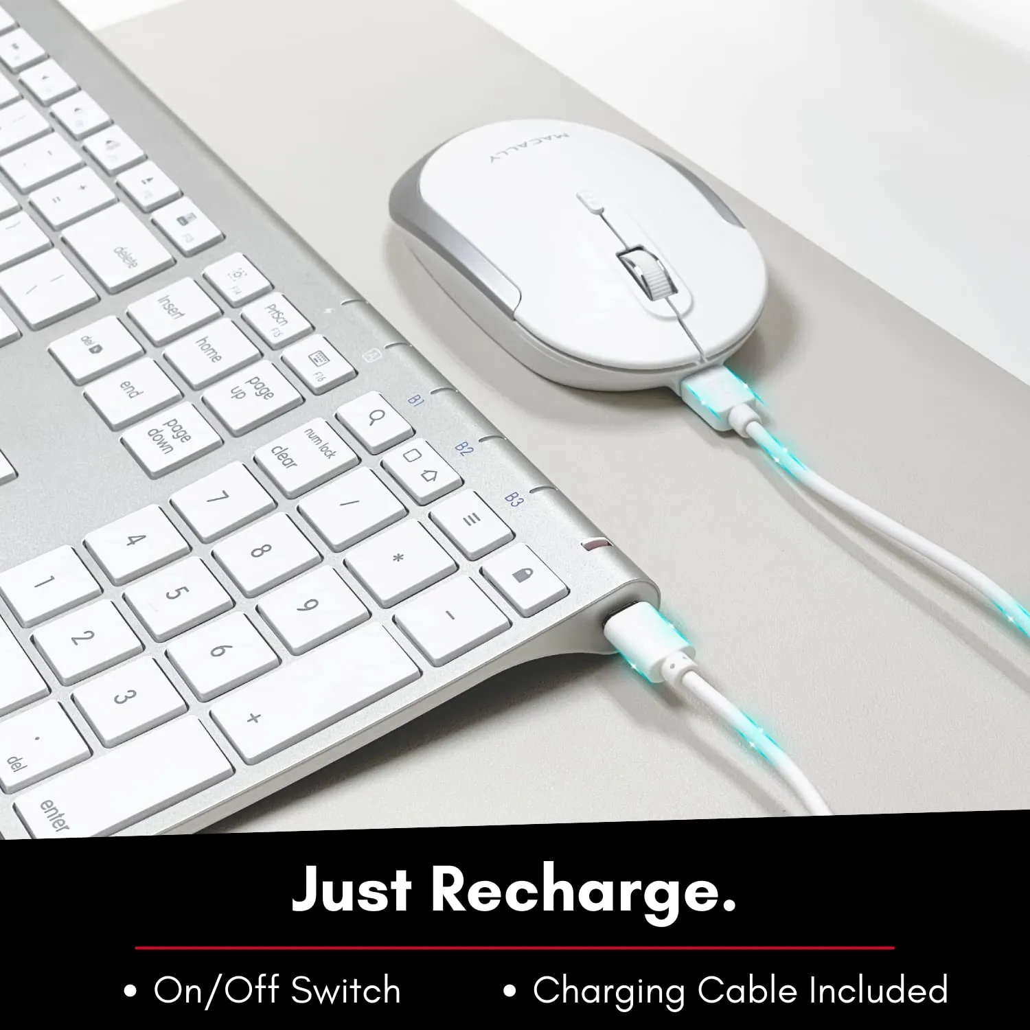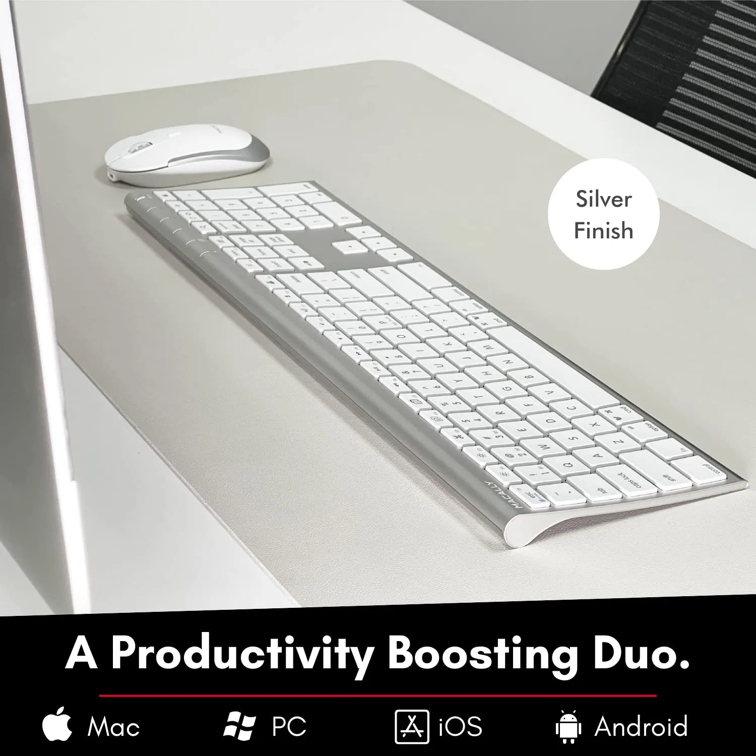 This sleek and stylish rechargeable aluminum Bluetooth keyboard and mouse combo in silver is perfect for any workspace. Offering a seamless wireless connection, it enhances your productivity while adding a modern touch to your setup.