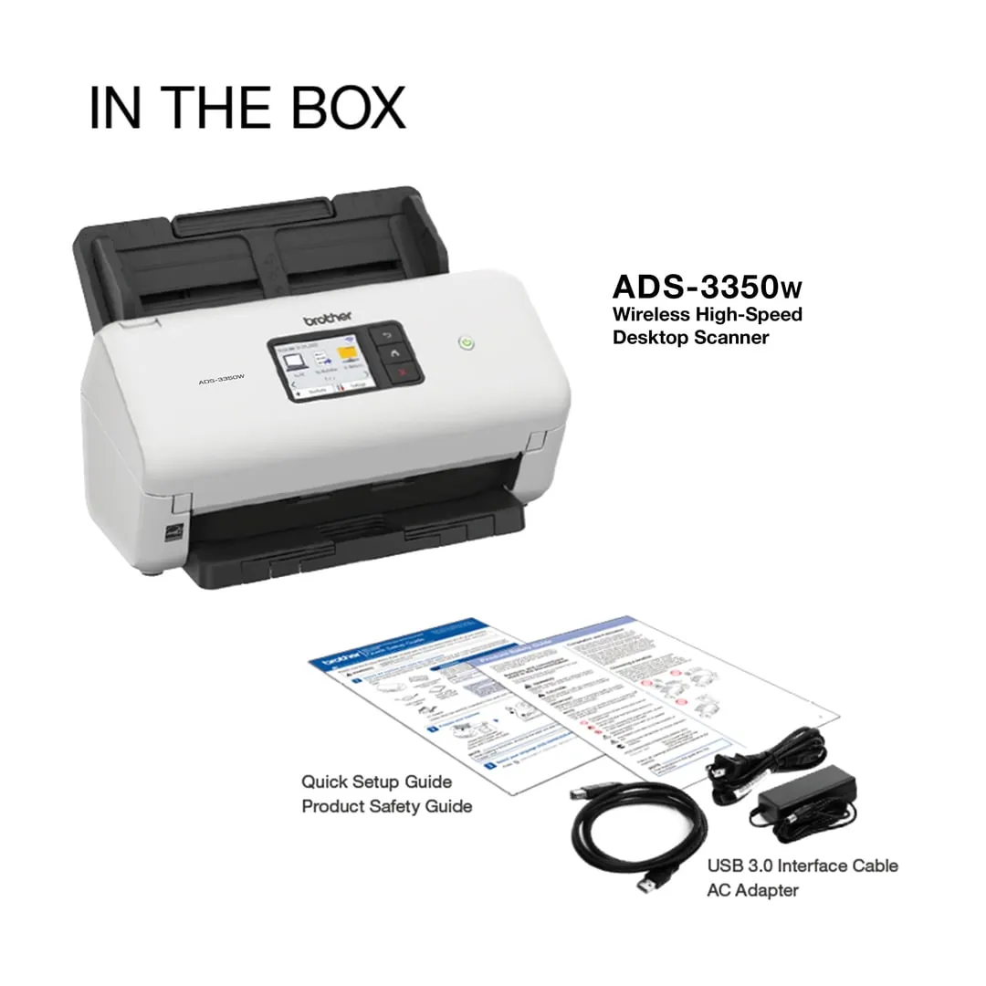 The ADS-3350W High-Speed Document Scanner is designed to meet your scanning needs efficiently. With its advanced duplex scanning capabilities, it can quickly digitize documents, photos, and more, making it perfect for both personal and professional use.