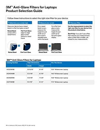 Anti-glare filter for your 15.6" wide-screen laptop helps protect your screen and improve your view in indoor bright or challenging lighting conditions. Enjoy a clear screen in brightly lit indoor areas, even near windows. Amazing optical technology from 3M diffuses mirrorlike reflections to help keep what's on your screen clear and visible while providing a layer of protection from dust and scratches. Matte surface cleans easily and hides fingerprints. Scratch-resistant filter attaches with optically clear adhesive strips or easily removable, slide-mount tabs. Lightweight, thin, frameless design features touch-compatibility and a 16:9 aspect. View area dimensions are 13-9/16" x 7-5/8" (345mm x 194mm).