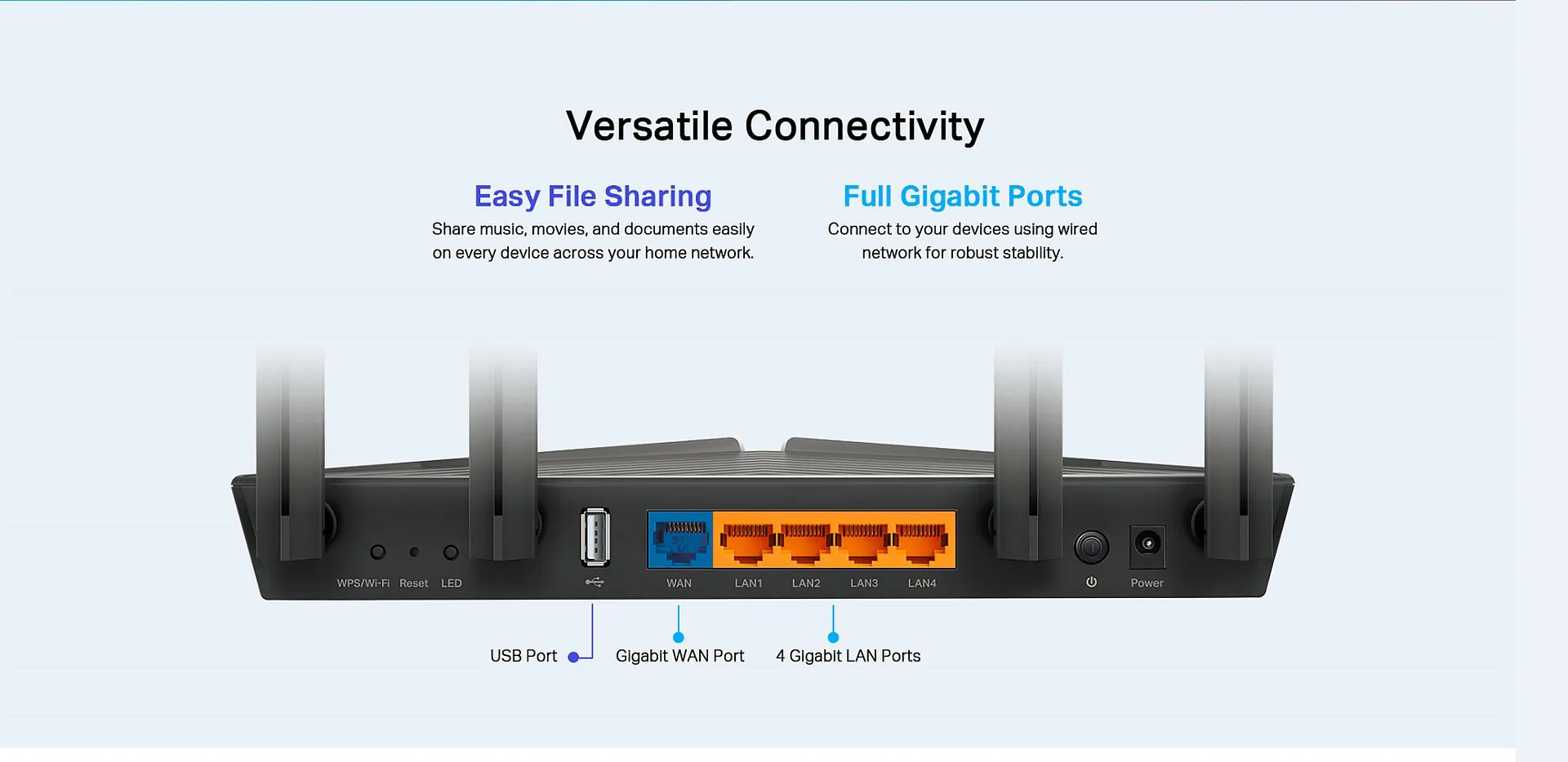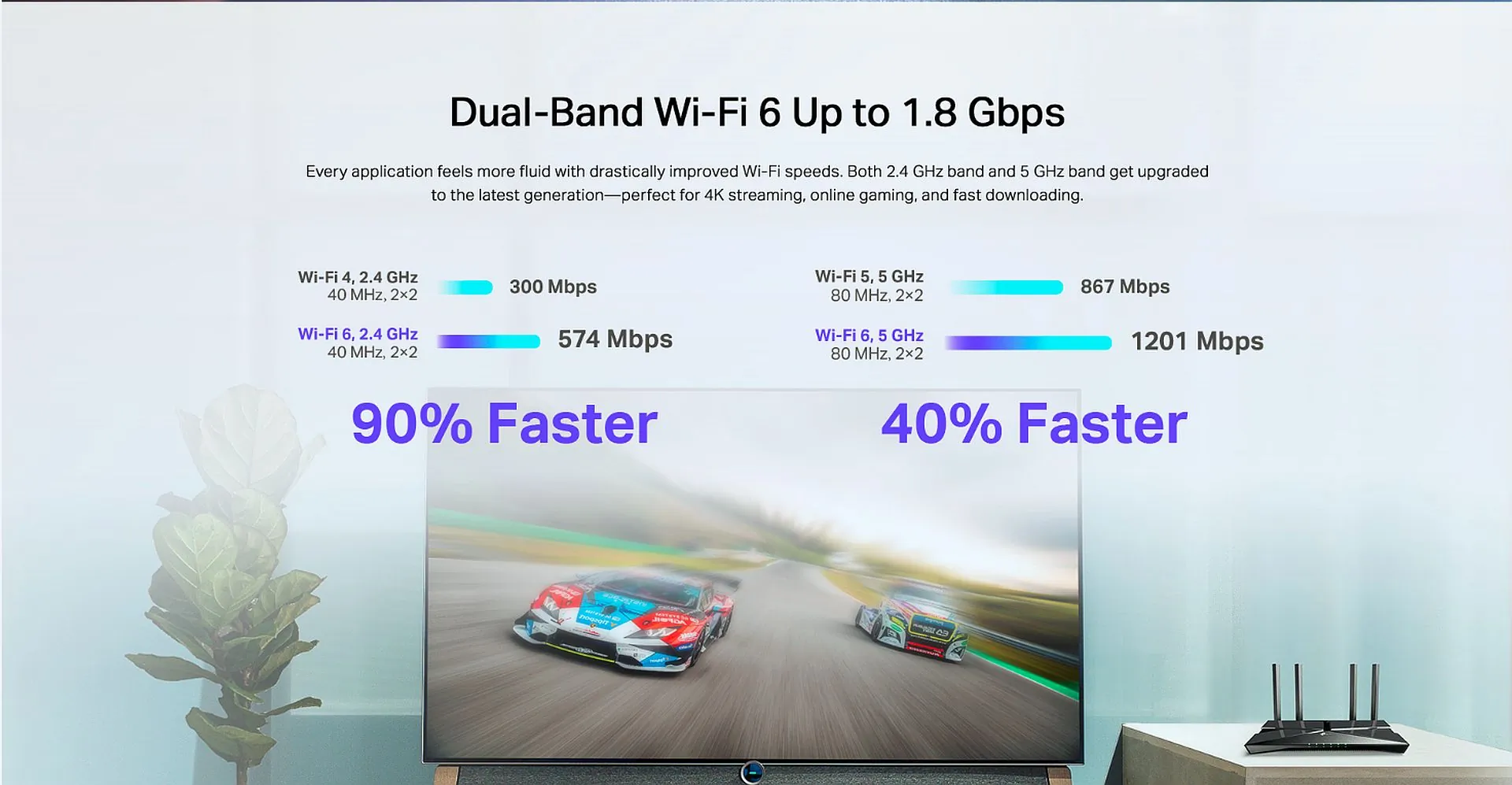 With dual-band technology, enjoy the benefits of both 2.4GHz and 5GHz frequencies, which helps reduce network congestion and enhances overall performance. The router is equipped with the latest Wi-Fi 6 technology, providing faster speeds and improved efficiency, making it perfect for smart homes.