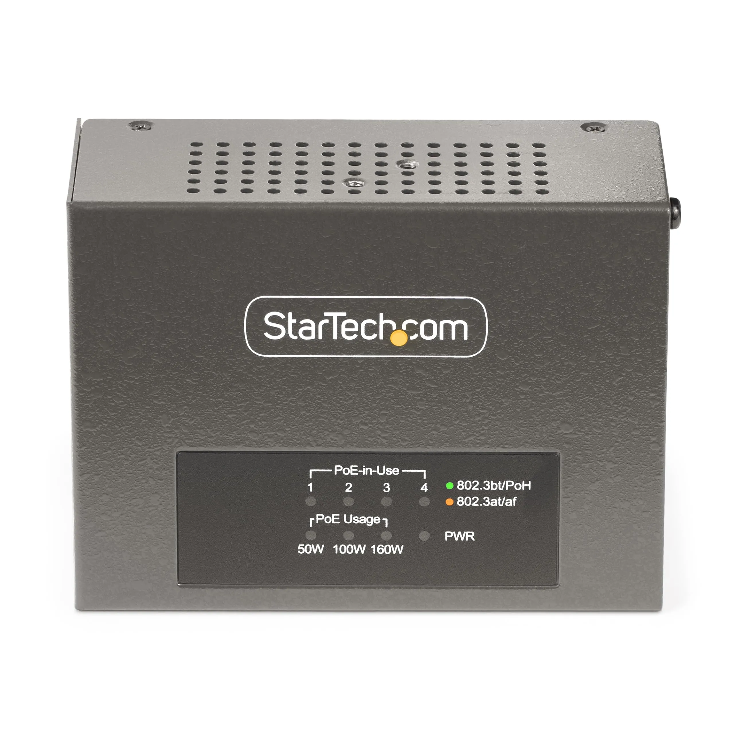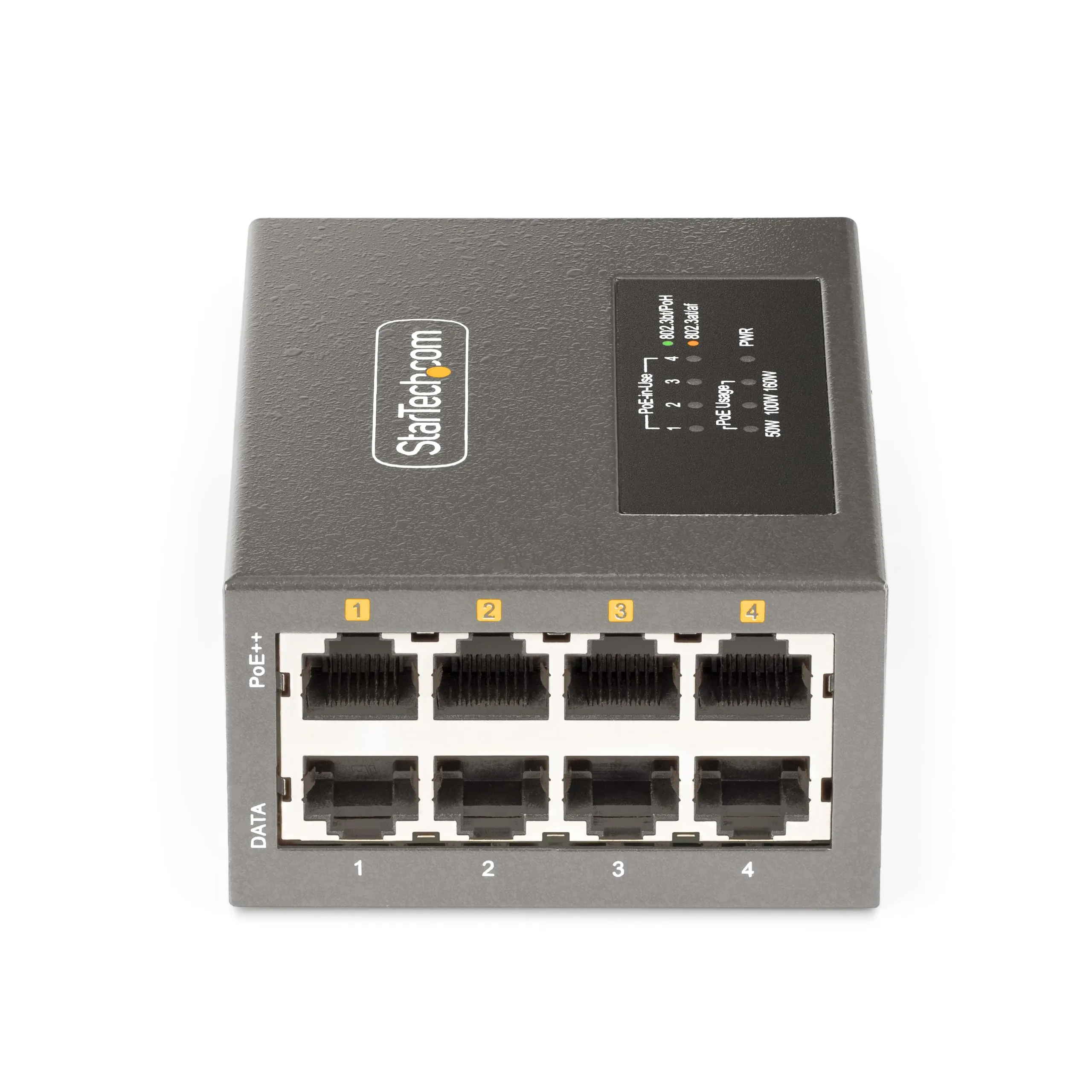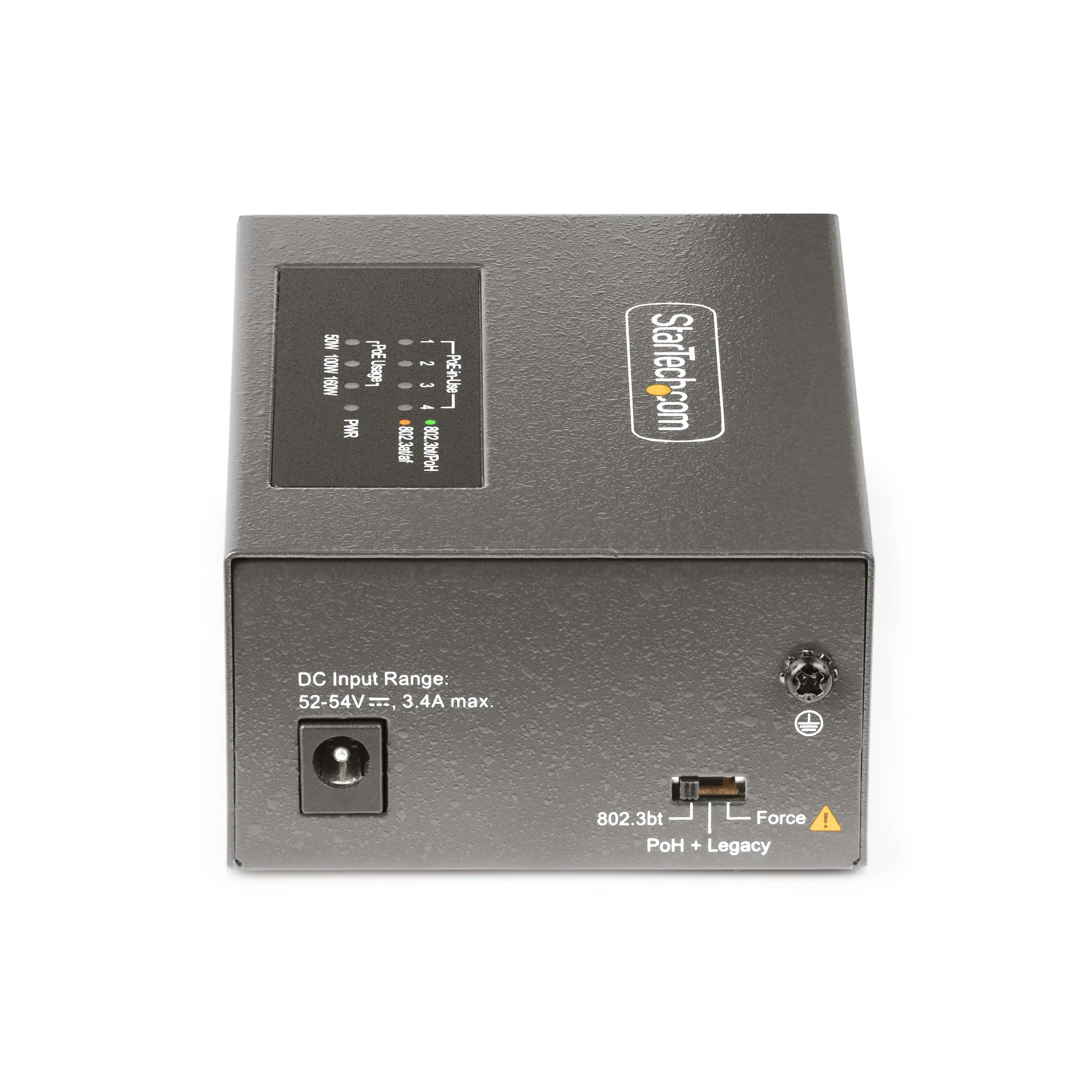 4-Port Multi-Gigabit PoE injector supports up to 5 Gbps (NBASE-T) Features PoE/PoE+/PoE++ (802.3af/802.3at/802.3bt) up to 95W; 160W Power budget Selectable power output for 90W/95W PoH/legacy 60W; PoE plus injector features multi-gigabit auto-negotiation between 5/2.5/1Gbps and 100/10Mbps Extend data/power up to 100m w/ Ethernet Cat 5e/6/6a cables Durable metal enclosure w/ DIN rail mounting bracket; Unmanaged injector equipped w/ top-facing color-coded LEDs for PoE mode/power budget