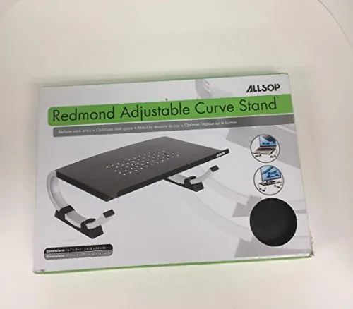 Adjustable curve stand adds ergonomic benefits to reduce neck strain. Stand optimizes your desk space and holds laptops that measure up to 17" and weigh up to 40 lb. The sliding black feet let you raise or lower your laptop screen to put it at the correct angle for your height. Plug in your own keyboard and mouse to create the perfect desktop working atmosphere. Perforated holes on the stand allow passive airflow to keep your computer cool. Chromelike base with a raised shelf keeps your laptop secure. The central grate helps dissipate heat away from your laptop.