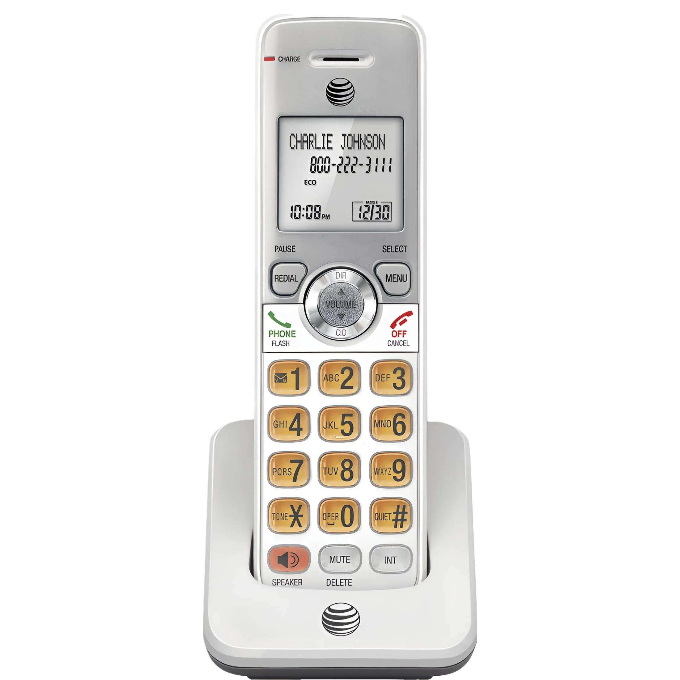 Accessory handset features an extra-large display with high-contrast black text to easily read your incoming Caller ID or call history records. Lighted handset keypad allows easy dialing in low-light conditions. Simulated full-duplex speakerphone increases participation by allowing both ends to speak and be heard for conversations that are more true to life. Eco-mode, power-conserving technology allows the system to use less energy to provide the best battery life. Call block directory allows you to save up to 20 names and numbers to stop unwanted calls from ringing through (Caller ID subscription required). Programmable design holds up to 50 names and associated phone numbers to quickly call and access your frequently dialed numbers. Handset also includes voicemail waiting indicator, last 10-number redial, mute, any key answer and more.