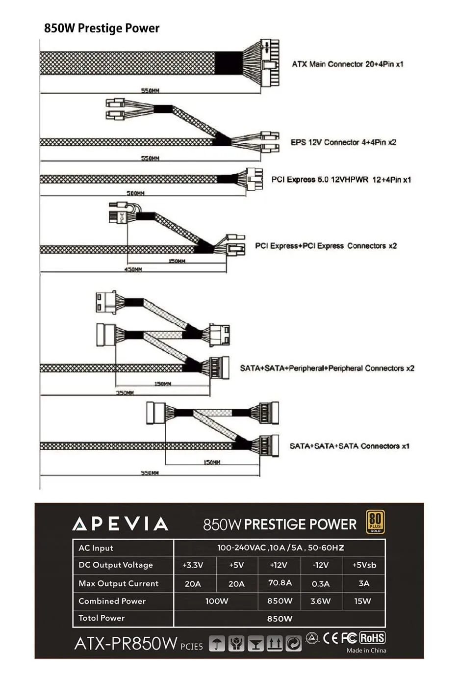 The Apevia Prestige 850W Power Supply is designed for high-performance gaming and workstation builds. With its robust power output and sleek design, it ensures optimal performance and reliability for your system.