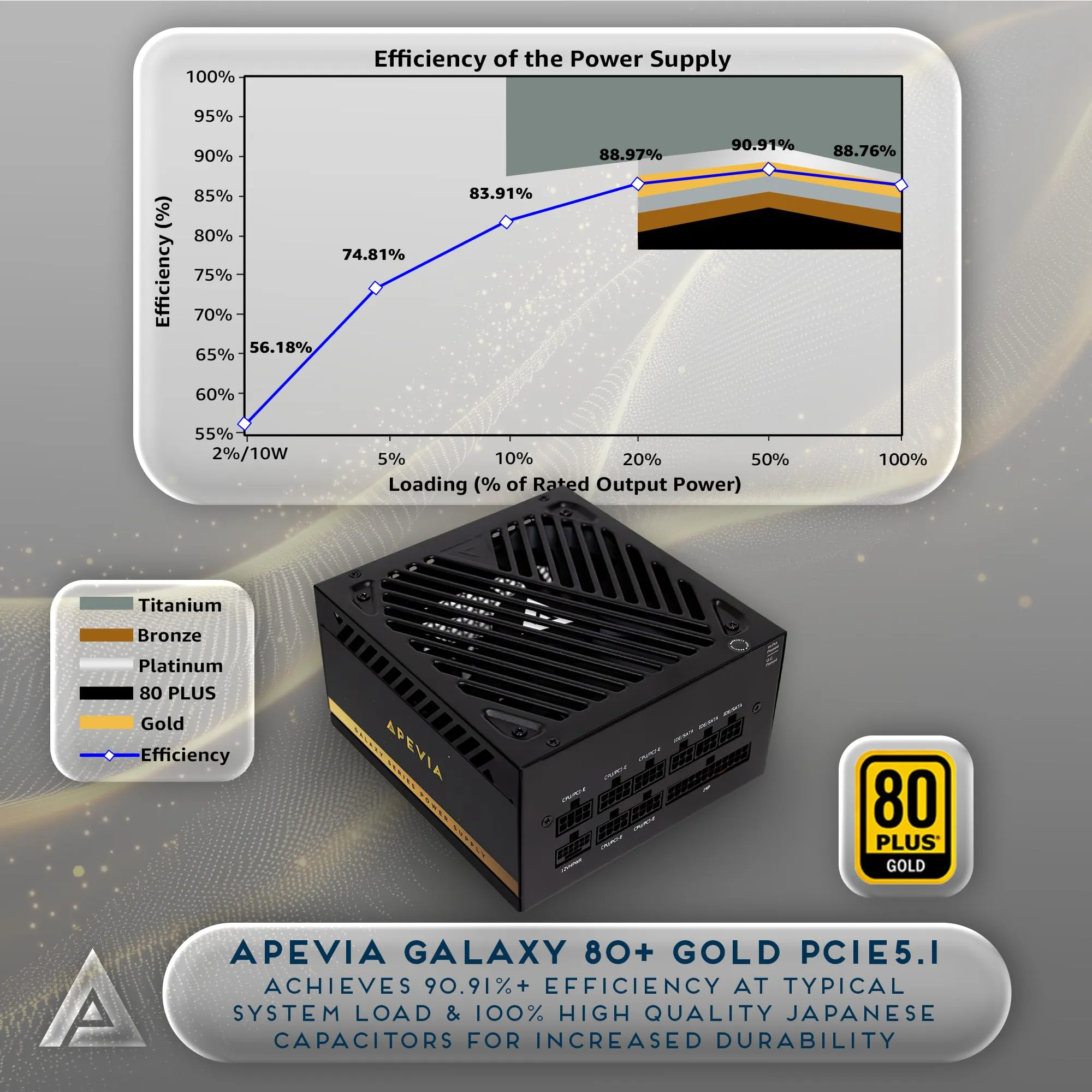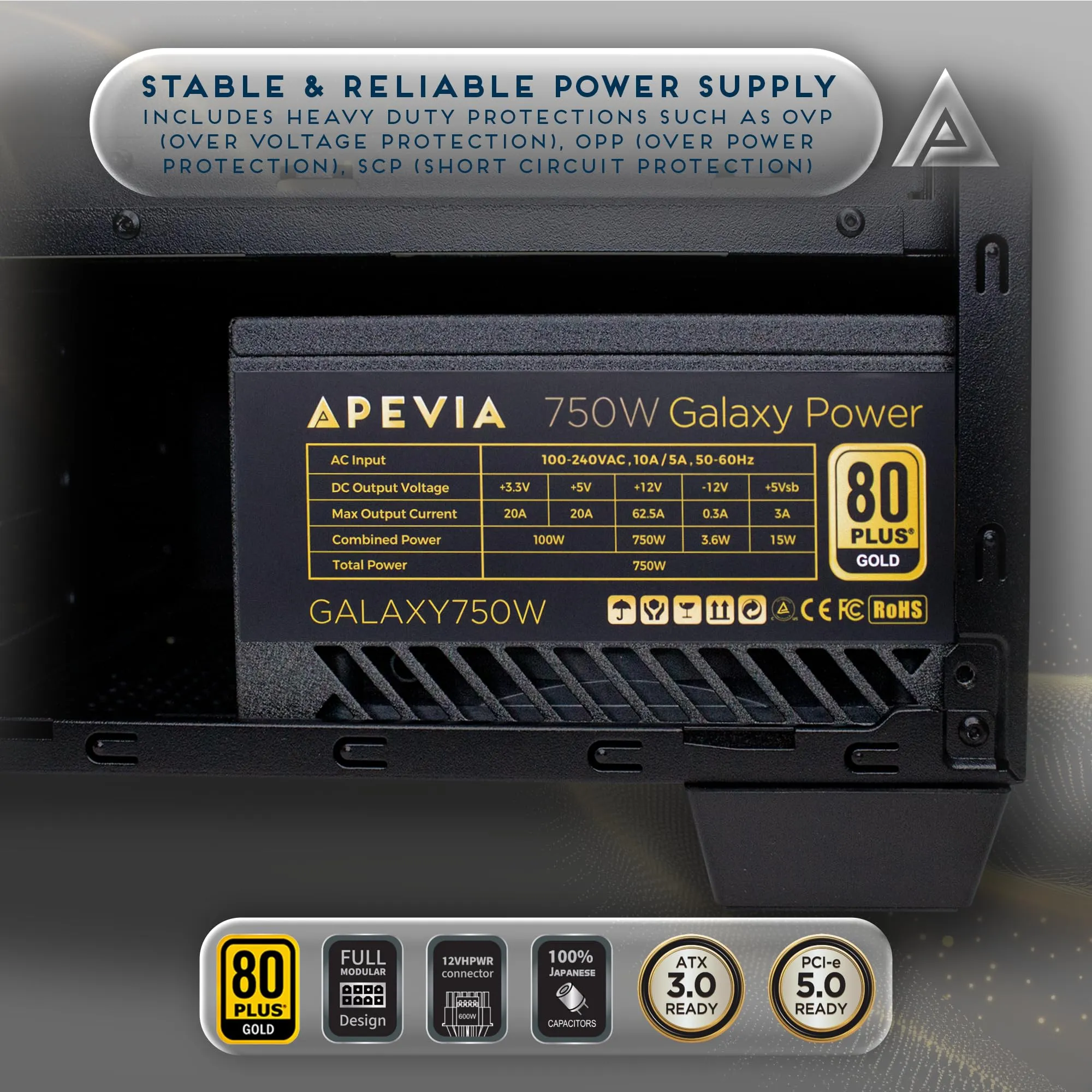 The Apevia Soul 750W Fully Modular Power Supply is designed for gamers seeking high-performance power solutions. With its DC to DC converter design and active PFC, it ensures stable power delivery and maximum efficiency.