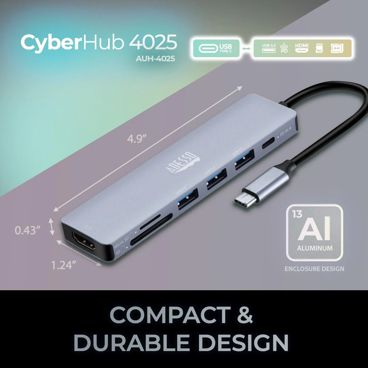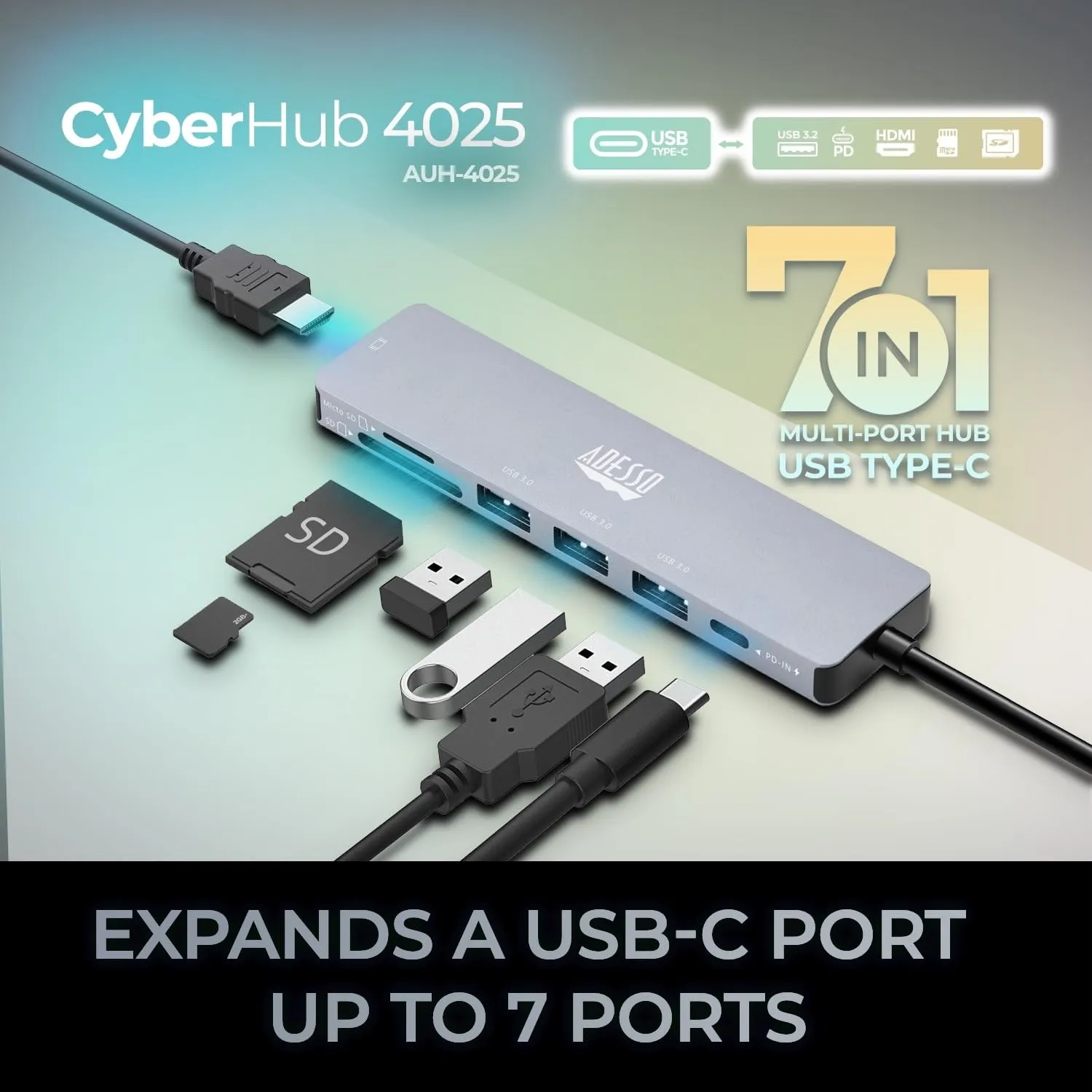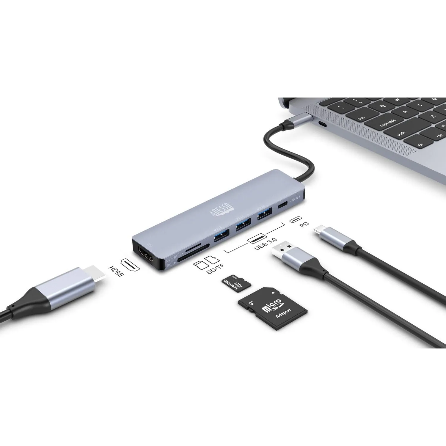 • Expand your laptop's connection port ;• 7 ports;• USB-C(R) 3.1 connection ;• Thunderbolt(TM) 3 compatible ;• 4K HDMI(R) output ;• SD(TM) Card and microSD(TM) Card ports;• Lightweight and portable ;• Plug and play;