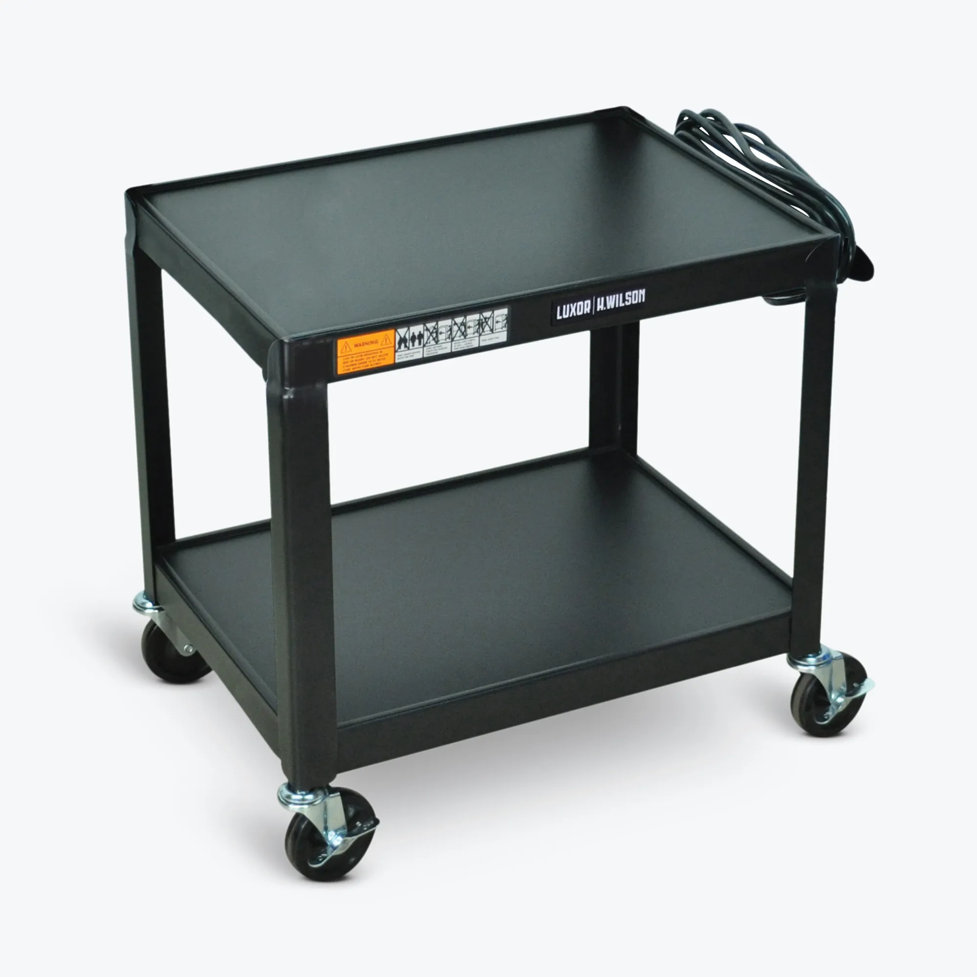 The Luxor Heavy-Duty Black Metal AV Cart is perfect for schools, offices, and conference rooms. Crafted from robust metal, this versatile cart is designed to safely hold and transport audiovisual equipment. With adjustable shelves, it allows for customized storage solutions while ensuring easy mobility with its lockable wheels.