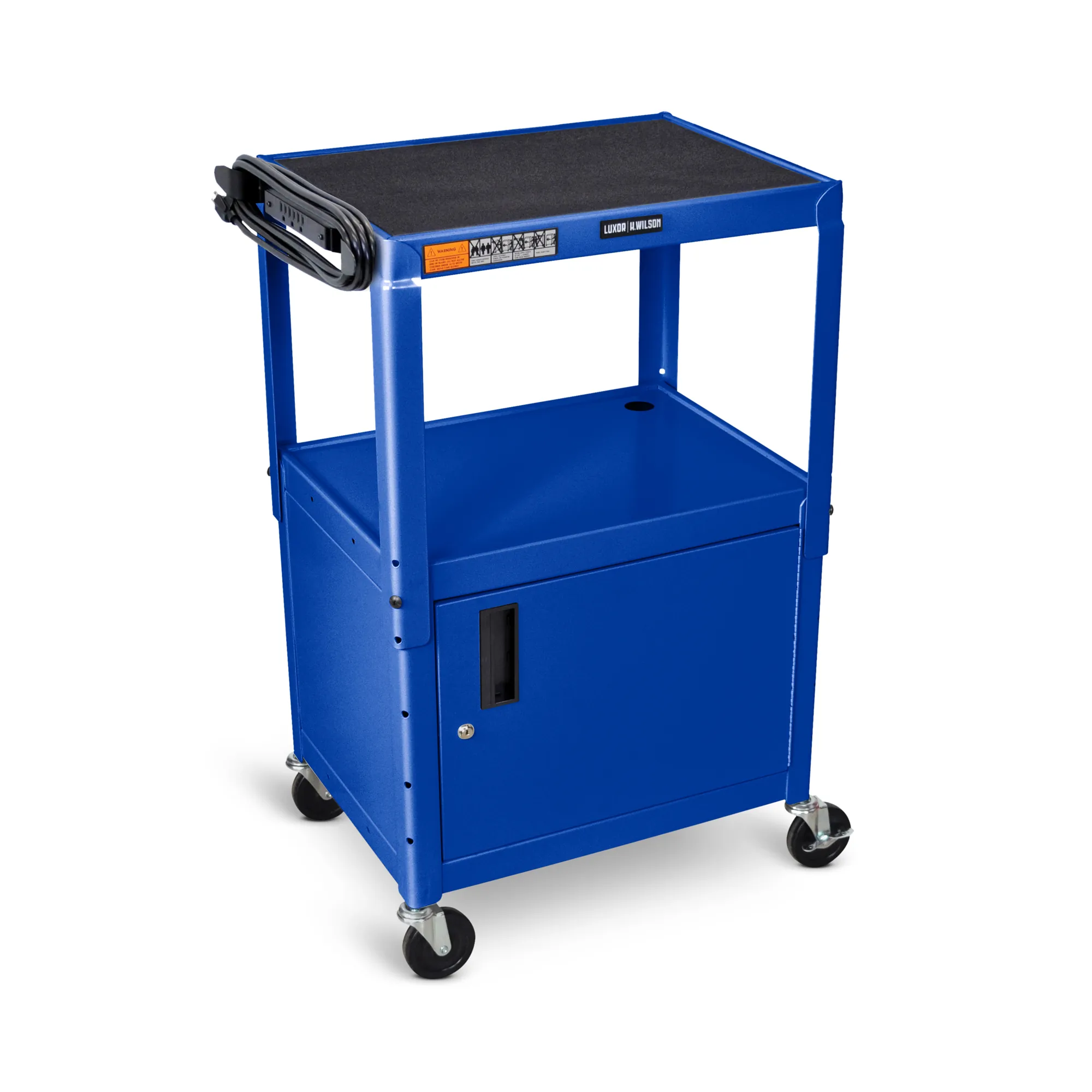 The adjustable top shelf height ranges from 24" to 42", accommodating various needs, and features a three-outlet electrical assembly for convenient power access. Its mobility is enhanced by four 4" full-swivel casters, two of which have locking brakes, allowing for easy maneuverability and stabilization.