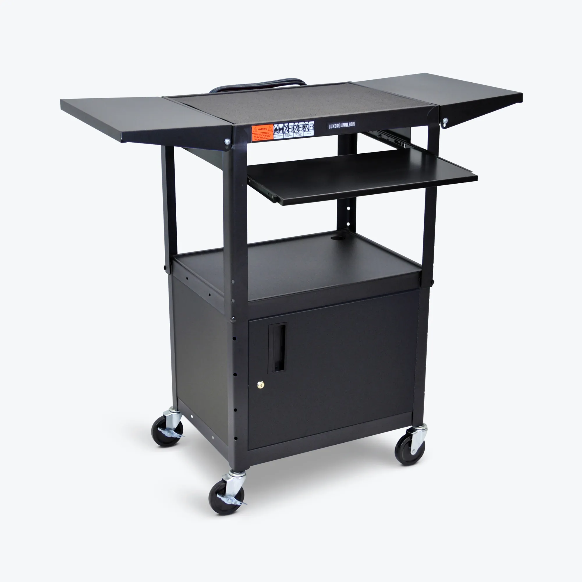 This innovative Luxor Adjustable A/V Cart is designed for versatility and convenience, making it perfect for a wide range of audio and video applications. Its sturdy drop-leaf shelves provide quick access to additional workspace, while the pullout keyboard tray enhances usability during presentations and computer tasks. The cart includes an integrated electrical assembly with cord wrap for easy power access, along with a secure locking cabinet to keep your supplies organized and safe when not in use.