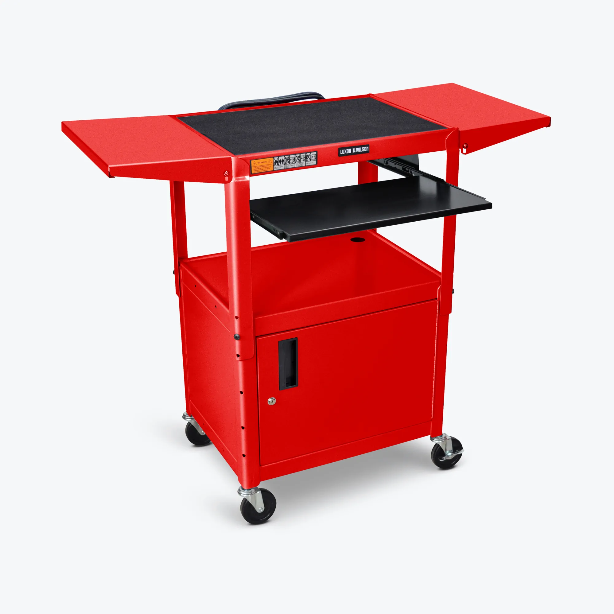 Meet your audio visual needs with the Luxor Adjustable Height Red Metal A/V Cart. This versatile cart is designed for optimal functionality and convenience. It features sturdy drop-leaf shelves for expanding surface area, a pullout keyboard tray for easy computer access, and an integrated electrical assembly that includes a cord wrap for multiple devices. The locking lower cabinet provides secure storage for supplies, while the adjustable top-shelf height and full-swivel casters make it mobile and adaptable. Enjoy the durability and utility that Luxor is known for.