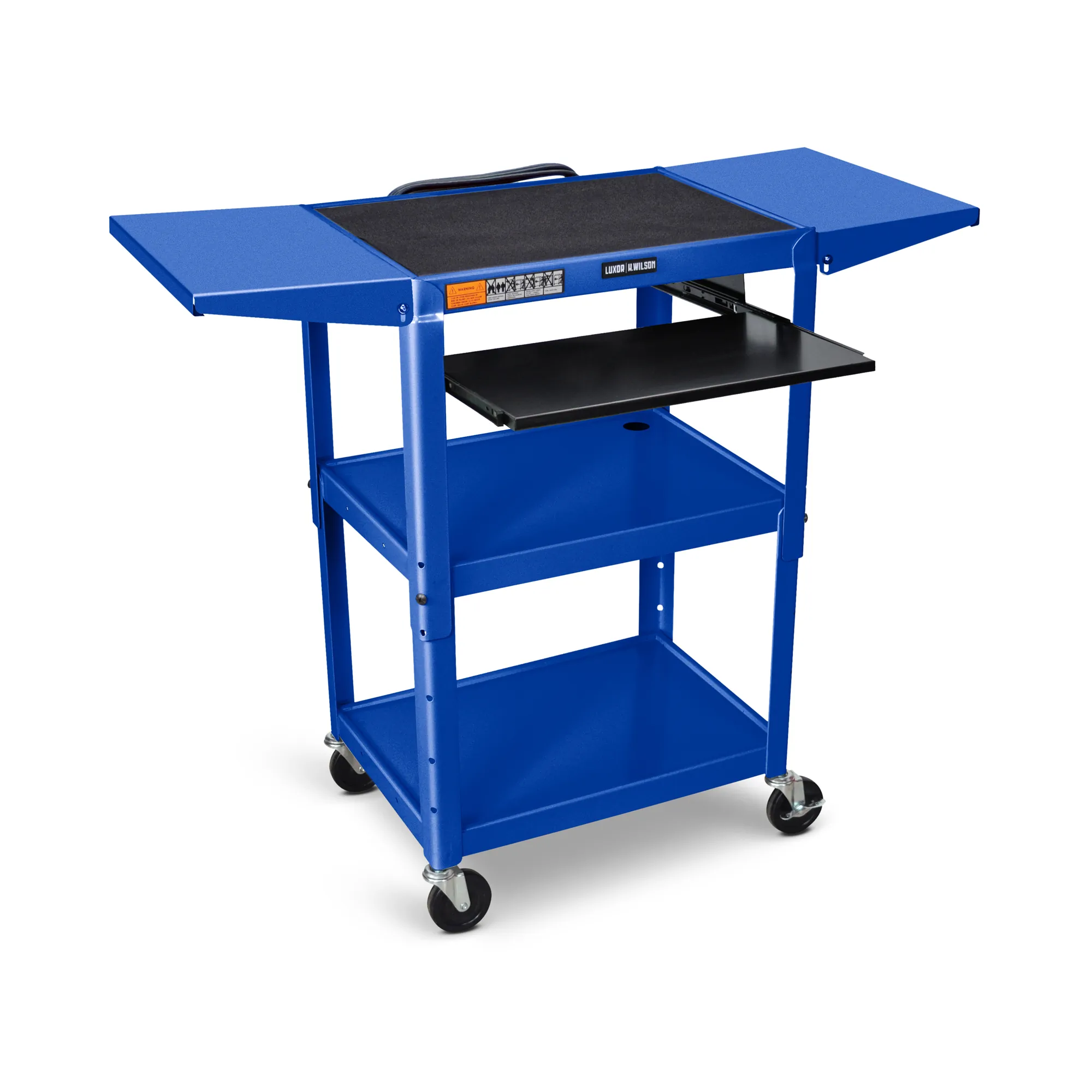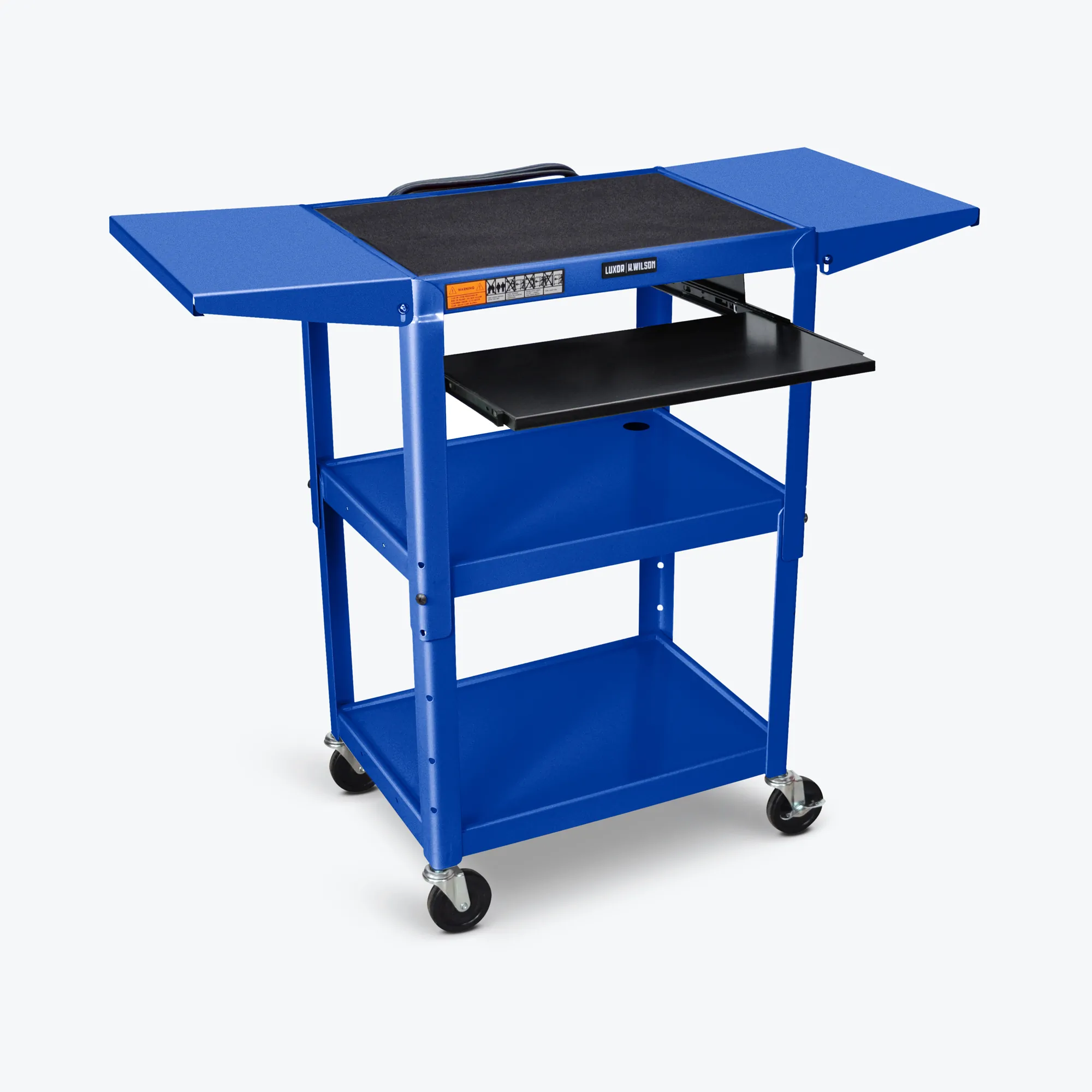 This durable A/V cart is designed to adapt to your presentation and storage needs. With an adjustable height ranging from 24" to 42", it accommodates various users and uses. It features a retractable keyboard tray, as well as two drop-leaf side shelves that easily expand the surface area. The top shelf is equipped with a rubberized grip mat, while the lower shelves offer ample space for equipment storage. Each shelf is bordered by a retaining lip to prevent items from sliding off, and the cart includes a three-outlet power strip alongside a mid-shelf cord cutout to keep cables nicely organized and out of sight.