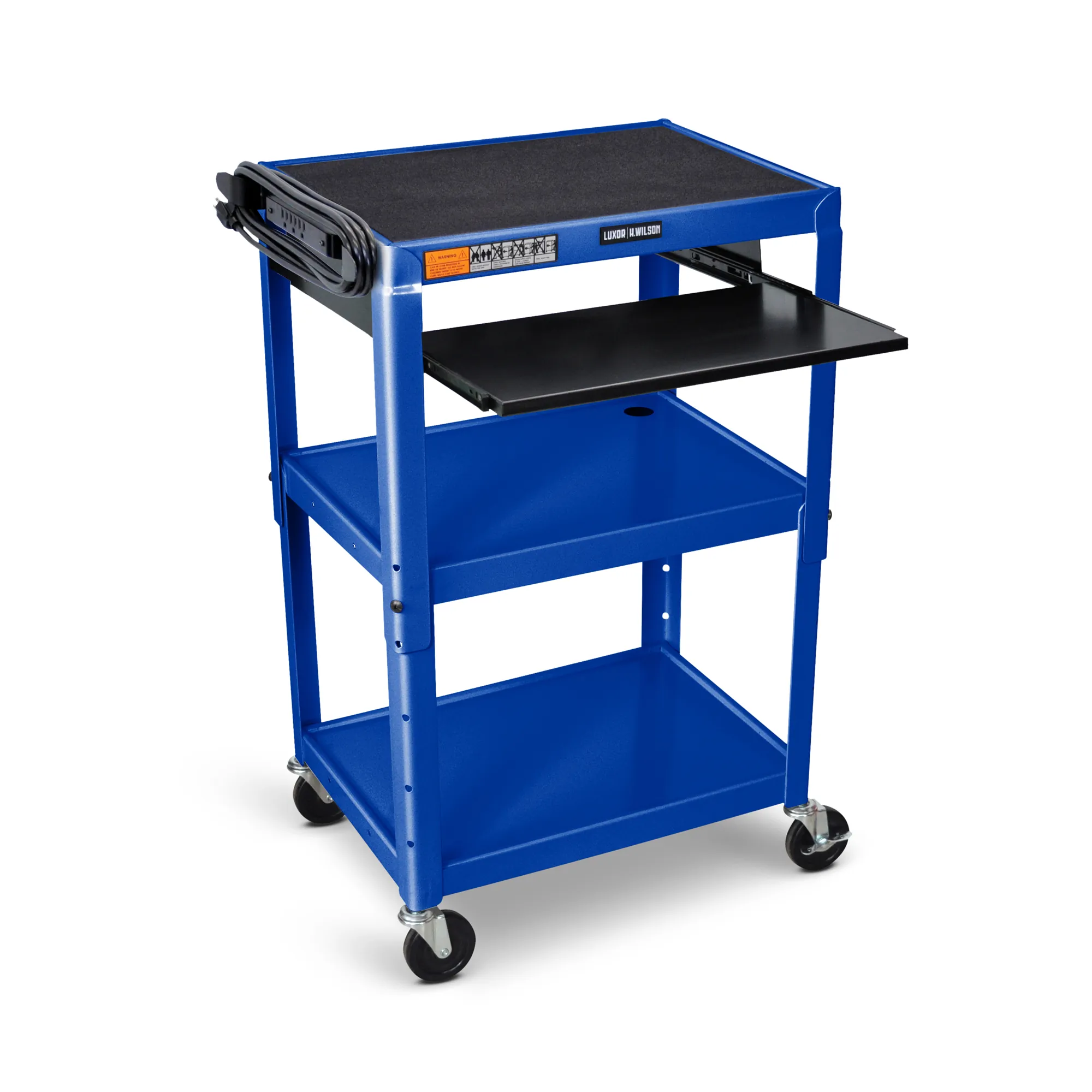 Discover the versatility of this height-adjustable metal A/V cart from Luxor, designed for seamless transport and operation of your essential equipment. Tailored for various users and applications, the cart features a pullout keyboard tray that neatly stores away when not in use. Enhanced safety features include a retaining lip on all three shelves and an anti-slip pad on the top shelf to secure laptops, projectors, and other presentation equipment during transit.