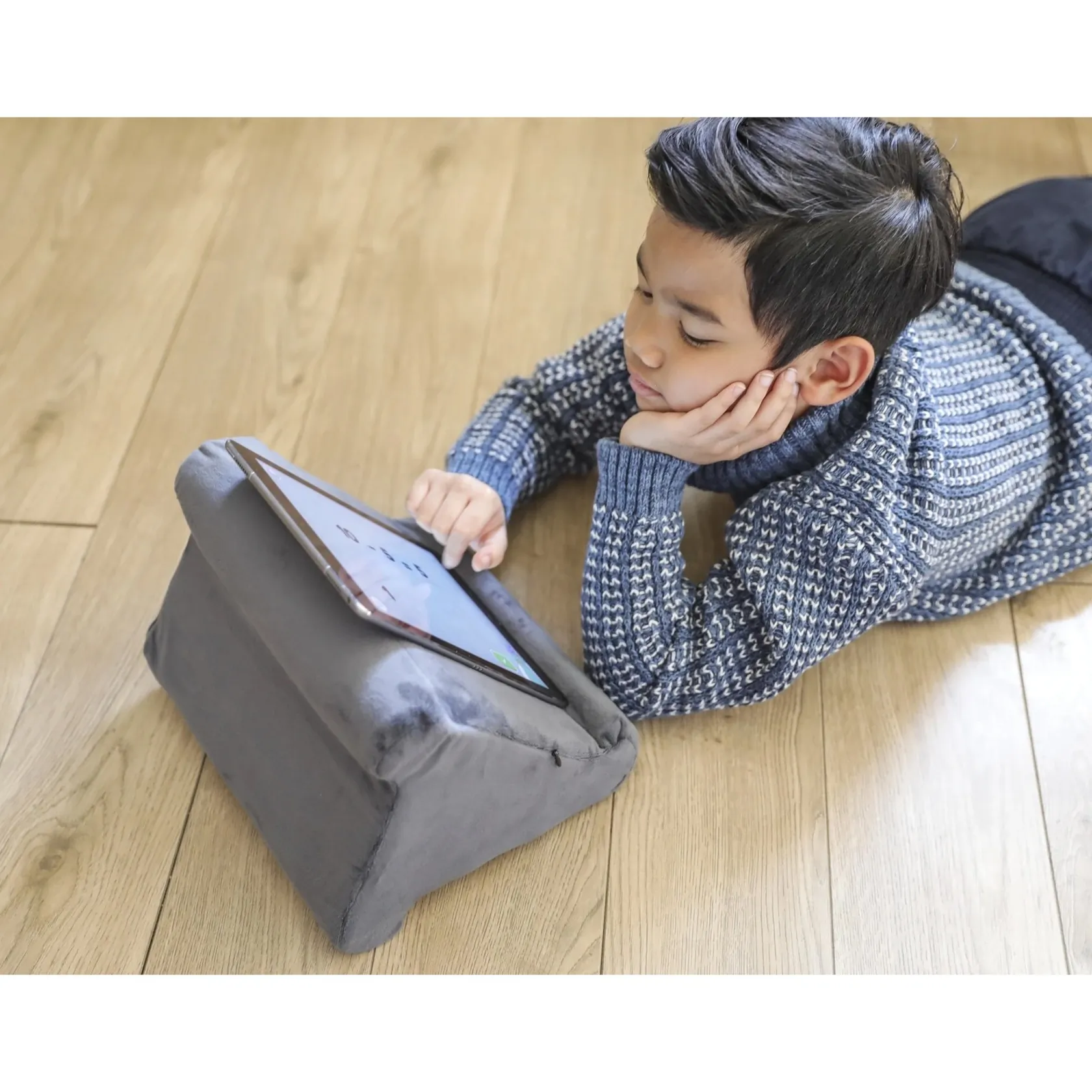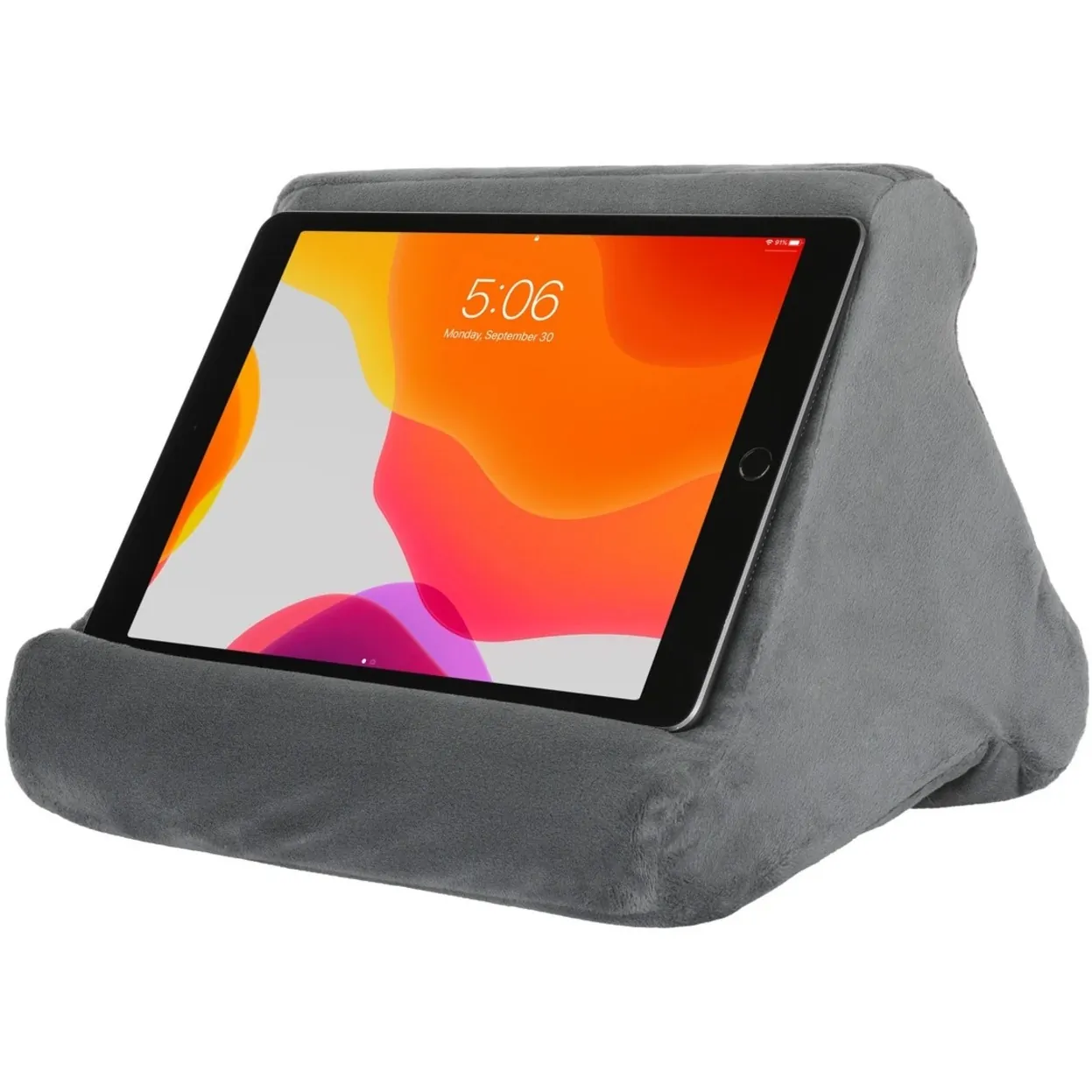 The Grey Adjustable Tablet Pillow Stand is designed for users who enjoy watching movies, reading, or browsing the web on their 12.9-inch tablets with comfort and convenience. Its soft and durable fabric provides a supportive cushion, allowing for hands-free use.