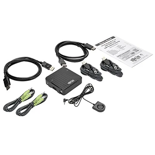 General InformationThe desktop B004-DP2UA2-K 2-Port DisplayPort 1.2 KVM Switch lets you access, control, boot and reboot two 4K DisplayPort computers using one DisplayPort monitor, keyboard and mouse. Switching between computers is quick and simple using a connected remote port selector, keyboard hotkeys or mouse scroll wheel. The B004-DP2UA2-K supports Multi-Stream Transport (MST), so you can use multiple monitors via one DisplayPort connector.By adding a powered USB 2.0 hub (sold separately) to the switch, you increase functionality by allowing USB peripherals-such as printers, hard drives, scanners, webcams and thumb drives-to be shared between computers. You can also plug microphones and speakers into the 3.5 mm mini-stereo jacks. Because audio and the B004-DP2UA2-K can be switched independently of each other, you can access one computer while listening to audio on the other.All necessary cables are included. The B004-DP2UA2-K supports Ultra High Definition (UHD) video resolutions up to 3840 x 2160 (4K x 2K) at 60 Hz, 2.1-channel surround sound, HD Audio, EDID and HDCP. All connected computers receive the console monitor's EDID information to ensure top video quality.The B004-DP2UA2-K is easy to set up with no software or drivers to install. It supports Windows, Mac, Linux and Sun. It also supports DisplayPort Dual Mode (DP++) for directly outputting single-link DVI or HDMI signals via adapter.Technical InformationNumber of Computers Supported: 2Number of Local Users Supported: 1VideoMaximum Video Resolution: 3840 x 2160Interfaces/PortsUSB: YesDisplayPort: YesNumber of USB Ports: 4Number of DisplayPorts: 3Physical CharacteristicsHeight: 1.1"Width: 3.7"Depth: 3.7"Weight (Approximate): 4.16 ozMiscellaneousPackage Contents: 2-Port DisplayPort 1.2 KVM Switch w/Audio, Cables and USB Peripheral Sharing 2 x DisplayPort Monitor Cables 2 x USB A/B Device Cables 2 x 3.5 mm stereo Audio Cables Remote Port Selector Owner's Manual Environmentally Friendly: YesEnvironmental Certification: RoHSWarrantyLimited Warranty: 3 Year