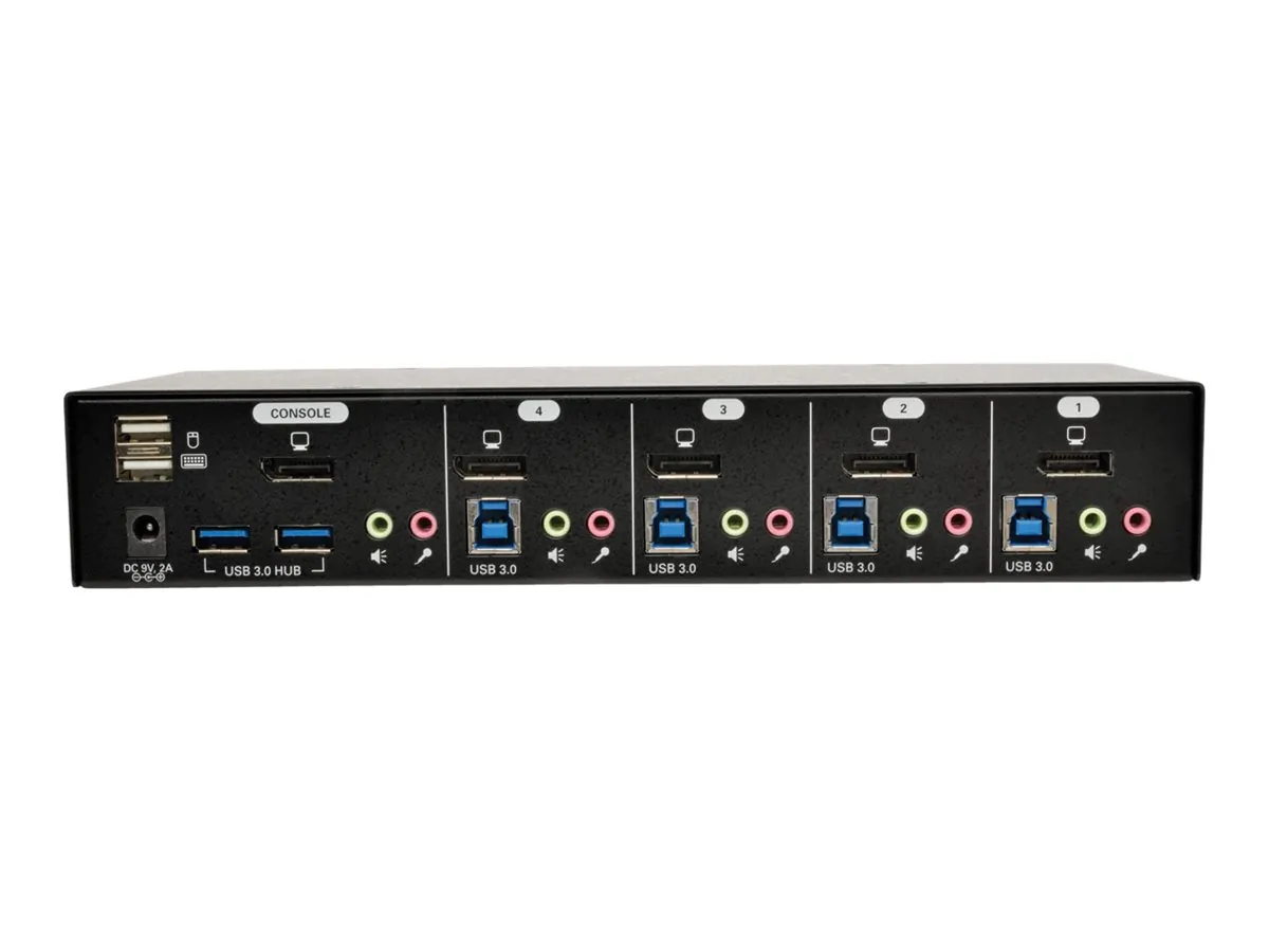 General InformationThe desktop B004-DPUA4-K 4-Port DisplayPort KVM Switch lets you access, control, boot and reboot four DisplayPort computers using one DisplayPort monitor, USB keyboard and USB mouse. Switching among DisplayPort computers is quick and simple using keyboard hotkeys or buttons on the unit. You can also plug microphones and speakers into the 3.5 mm mini-stereo jacks, and the two-port USB 3.0 SuperSpeed hub allows you to connect peripherals, such as a webcam, flash drive, printer or scanner, and share them among computers. Because the audio and USB 3.0 hub ports can be accessed independently, you can, for instance, use a printer connected to the hub to print data from one computer while also listening to music from another computer.All necessary cables are included. The B004-DPUA4-K supports digital video resolutions up to 2560 x 1600 (including 1080p), 2-channel stereo audio and data transfer rates up to 5 Gbps. The built-in DDC emulator sends the console monitor's EDID information to all connected computers to ensure top video quality and prevent any delay or change in video resolution when switching computers.The B004-DPUA4-K is easy to set up with no software to install and supports Windows, Mac, Linux and Sun. The USB 3.0 hub is backward-compatible with USB 2.0 and USB 1.1 devices.Technical InformationNumber of Computers Supported: 4Number of Local Users Supported: 1VideoMaximum Video Resolution: 2560 x 1600Interfaces/PortsUSB: YesDisplayPort: YesNumber of USB Ports: 8Number of DisplayPorts: 5MiscellaneousPackage Contents: 4-Port DisplayPort KVM Switch w/Audio, Cables and USB 3.0 SuperSpeed Hub 4 x DisplayPort Cables, 6 ft. 4 x USB 3.0 Type-A to Type-B cables, 6 ft. 4 x 3.5 mm mini-stereo cables, 6 ft. External Power Supply (Input: 100/240V, 50/60 Hz, 0.5A; Output: 9V, 2A) Universal Plug Adapters (NEMA 1-15P, CEE 7/16, BS1363, and AS3112) Owner's Manual Environmentally Friendly: YesEnvironmental Certification: RoHSWarrantyLimited Warranty: 3 Year