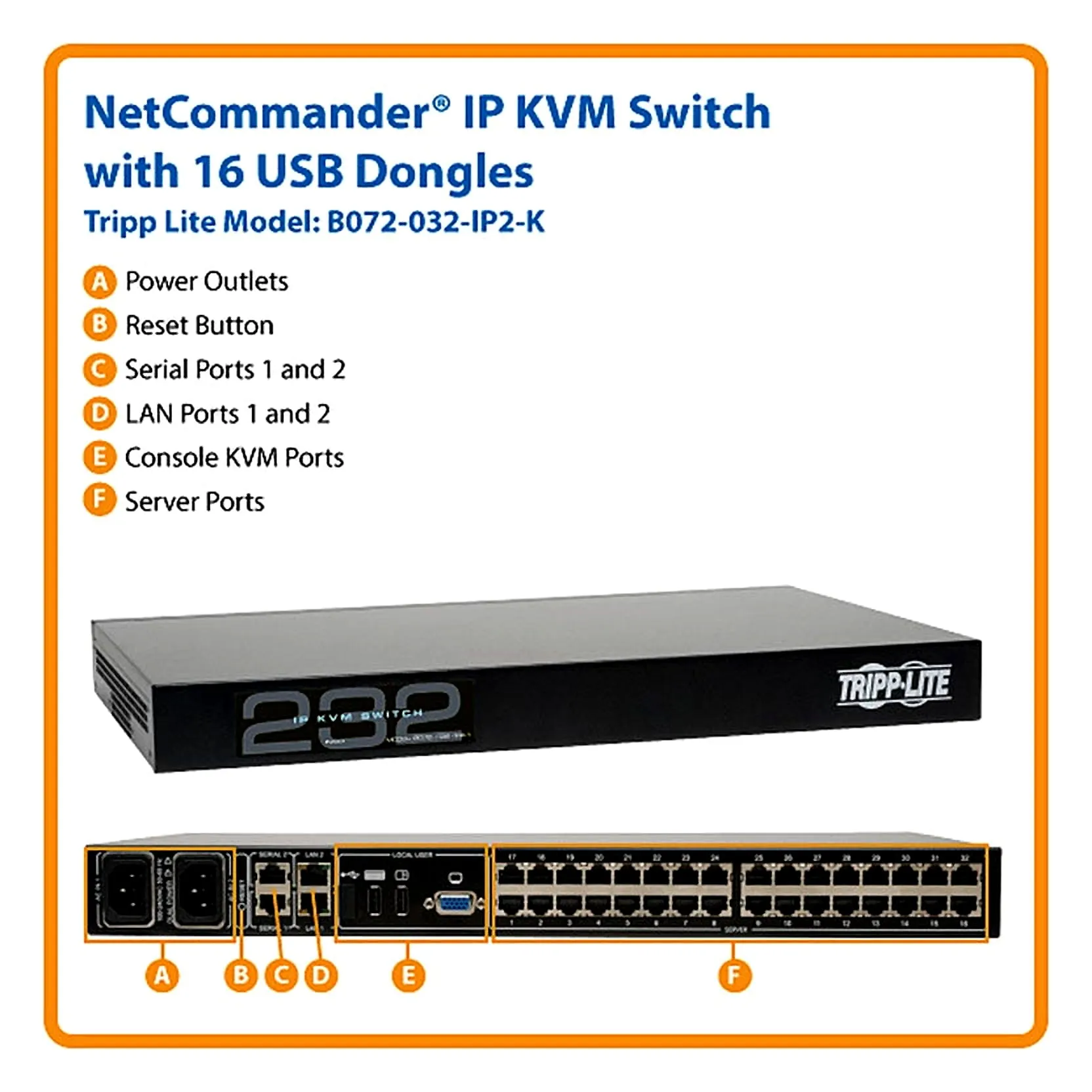 Technical InformationKVM Technology: DigitalNumber of Computers Supported: 32Number of Local Users Supported: 1Number of Remote Users Supported: 2Maximum Operating Distance: 100 ftVideoGraphic Mode: Full HDMaximum Video Resolution: 1920 x 1080Interfaces/PortsNetwork (RJ-45): YesUSB: YesVGA: YesNumber of Network (RJ-45) Ports: 36Number of USB Ports: 2Number of VGA Ports: 1Physical CharacteristicsColor: BlackForm Factor: Rack-mountableRack Height: 1UHeight: 1.7"Width: 17.3"Depth: 11"Weight (Approximate): 7.75 lbMiscellaneousPackage Contents: 32-Port, 2+1 User NetCommander Cat5 IP KVM Switch with Sixteen USB Dongles16 x USB Dongles ( B078-101-USB-1 )Rackmount Hardware2 x Power CordsCertifications & Standards: UL 60950-1 (USA)CSA (Canada)FCC Part 15 Class ACE IEC 60950-1Platform Supported: PC, LinuxEnvironmentally Friendly: YesEnvironmental Certification: RoHSWarrantyLimited Warranty: 3 Year