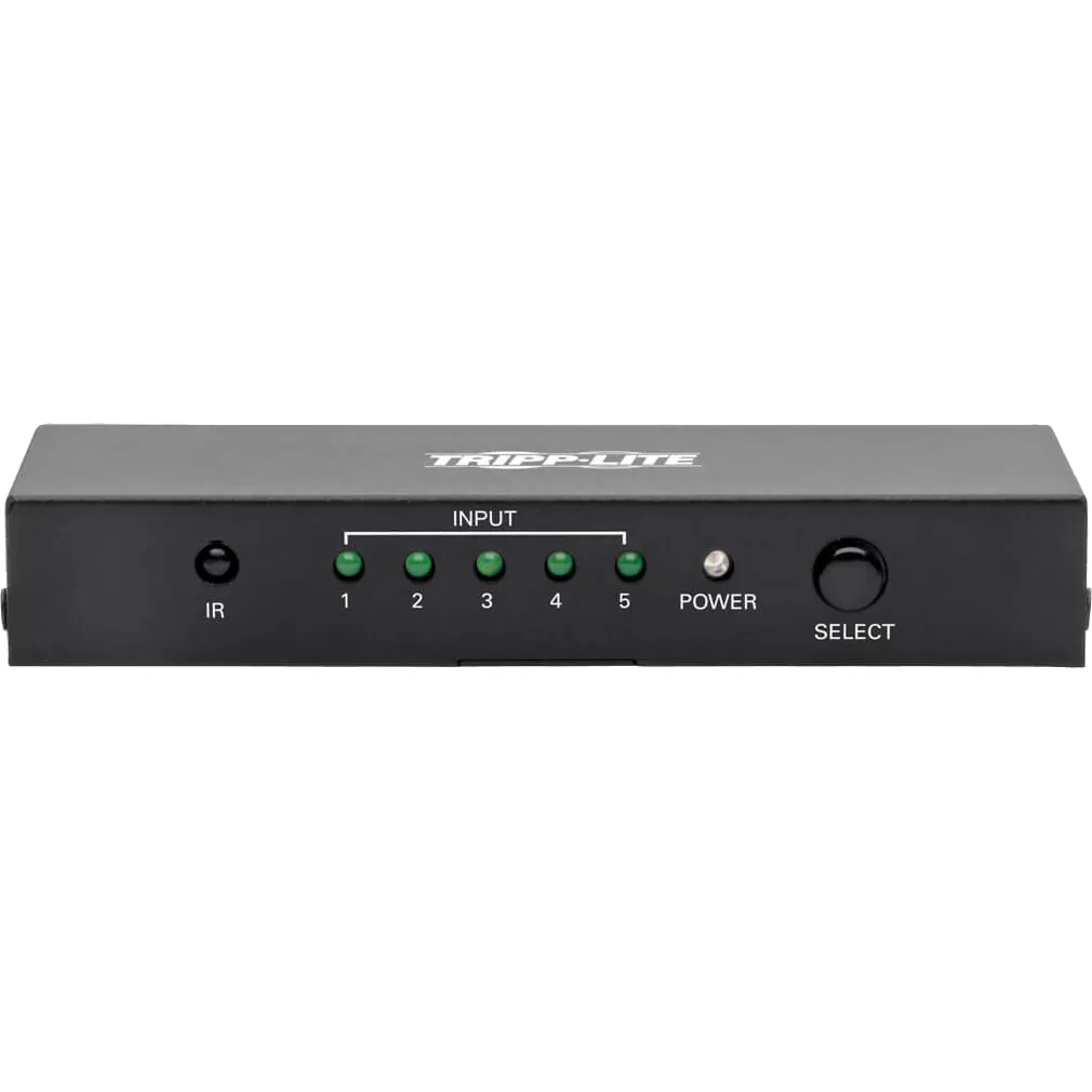 5-Port HDMI Switch with Remote Connects 5 Sources to One 4K HDMI Display An excellent addition to your home theater, the B119-005-UHD allows you to connect five separate HDMI audio/video sources to your 4K television, projector or monitor?s HDMI input and switch between them. For instance, connect a cable box, Blu-ray player, Xbox, Roku and audio receiver to your 4K HDTV, and use the included remote control to switch manually from one input to another.Transmits Crystal-Clear Video up to 4K x 2K for Ultra High Definition Presentations This 5-port HDMI switch with remote ensures UHD performance with video resolutions up to 3840 x 2160 (4K x 2K) @ 60 Hz and 48-bit True Color (16 bits per channel), as well as DTS-HD, Dolby TrueHD and 7.1-channel surround sound audio. It meets 3D, HDMI 2.0, HDCP 2.2 and EDID standards. Switch between source devices using the unit?s Select button or the remote control.Ready to Use Right from the Package, So You Can Plug and Play Immediately The compact metal switch requires no software or drivers to download and install. Connect your devices to the HDMI ports with user-supplied HDMI cables (such as Tripp Lite?s P569-Series), and plug the included external power supply into an AC power source. A red LED indicates the unit is receiving power, and green LEDs indicate connected HDMI inputs. When the currently used source is powered off, the unit automatically switches to the next powered-on source.Product Type Audio/Video SwitchboxConnectivity Technology CableNumber of Input Devices Supported 5Device Supported Display Home Theater System ProjectorNumber of Displays Supported 1Video Graphics Modes 4K Maximum Video Resolution 3840 × 216Interfaces/Ports HDMI In Yes HDMI Out Yes Number of HDMI Inputs 5 Number of HDMI Outputs 1Height 0.8"Width 4.8"Depth 2"Weight (Approximate) 0.15 kgPackage Contents B119-005-UHD 5-Port HDMI Switch with Remote - 4K x 2K UHD @ 60 Hz Remote Control External Power Supply (Input: 100?240V, 50/60 Hz, 0.3A; Output: 5V 1A) 4 x International Plug adapters (North America, Europe, United Kingdom, Australia) Owner?s ManualEnvironmentally Friendly YesEnvironmental Certification RoHS REACH