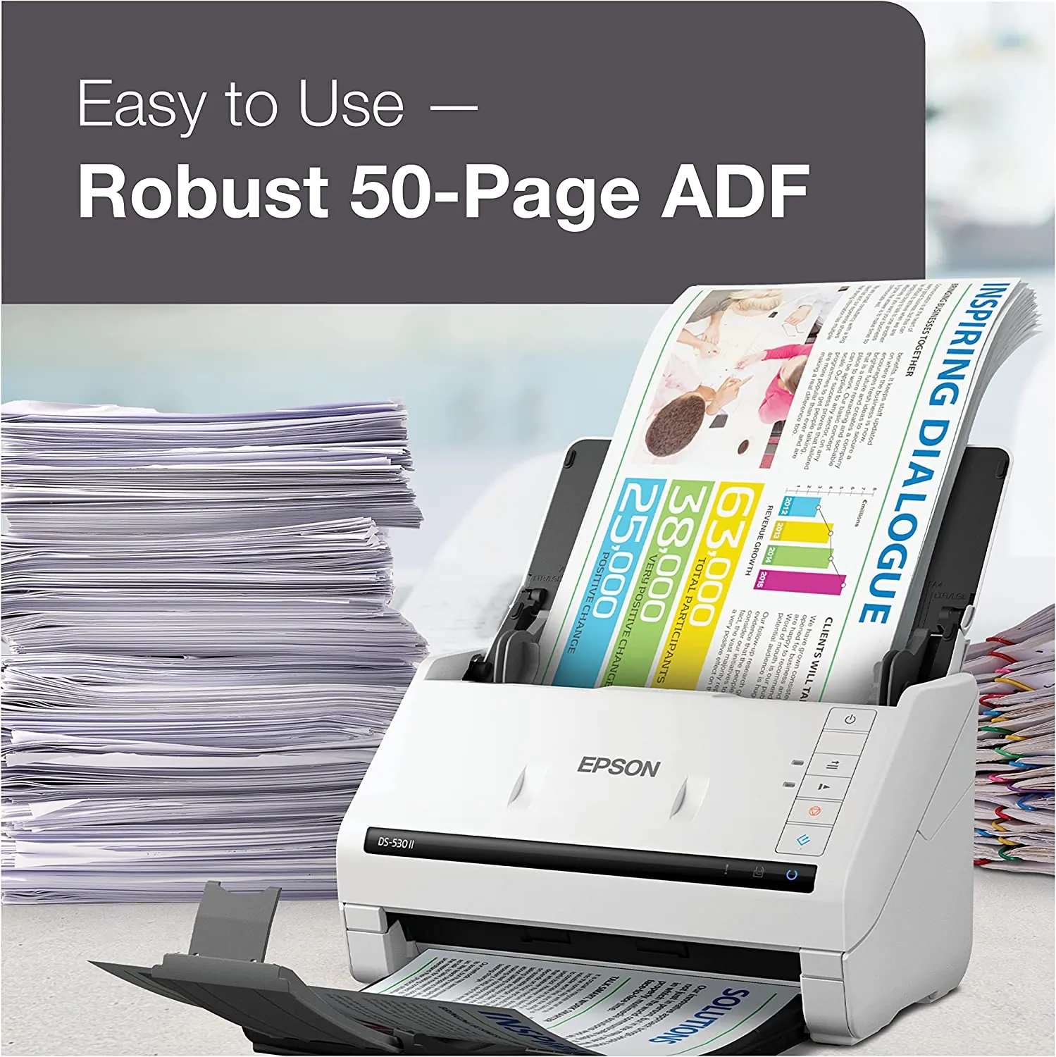 Easily scan stacks of documents - robust design with 50-page Auto Document Feeder (ADF)