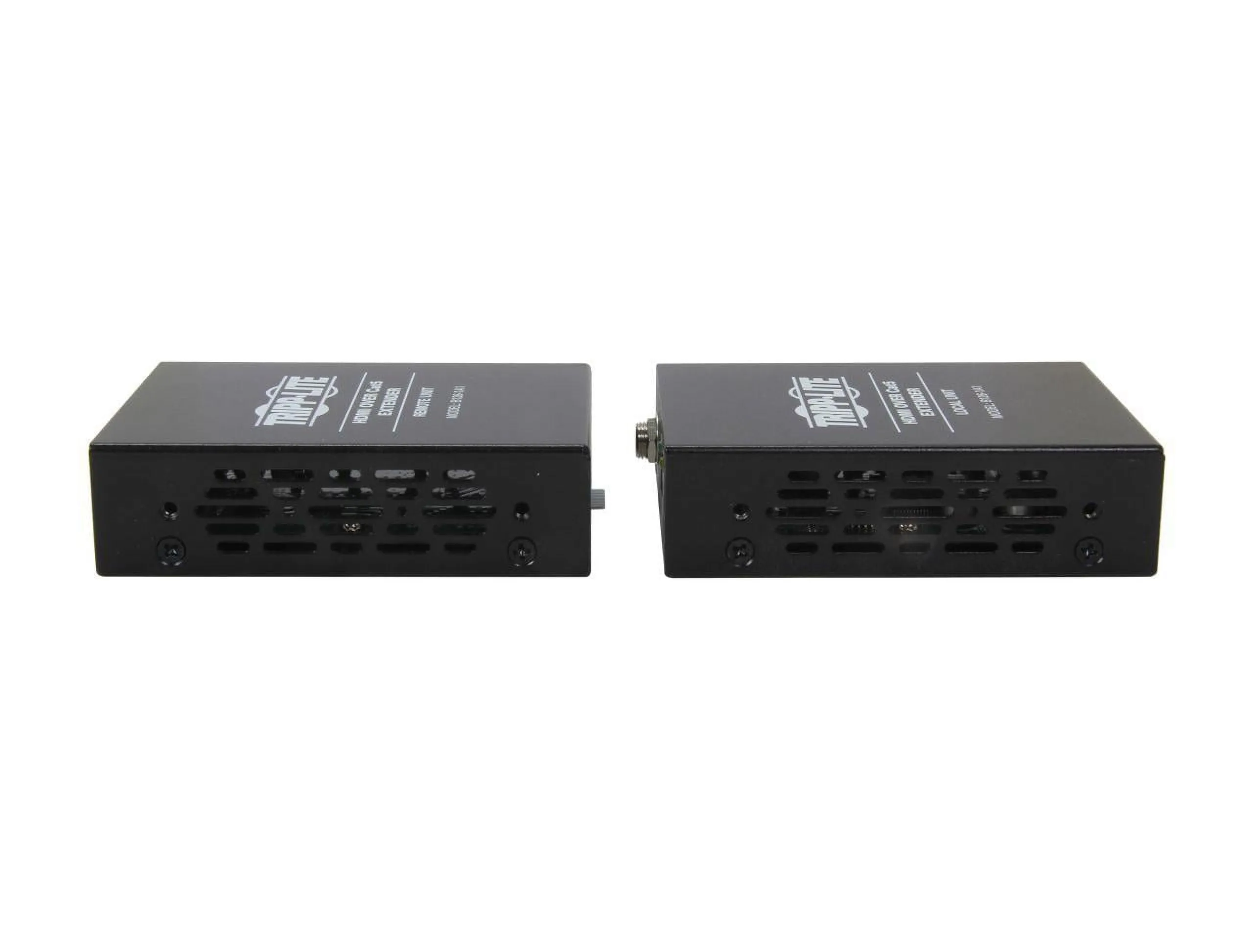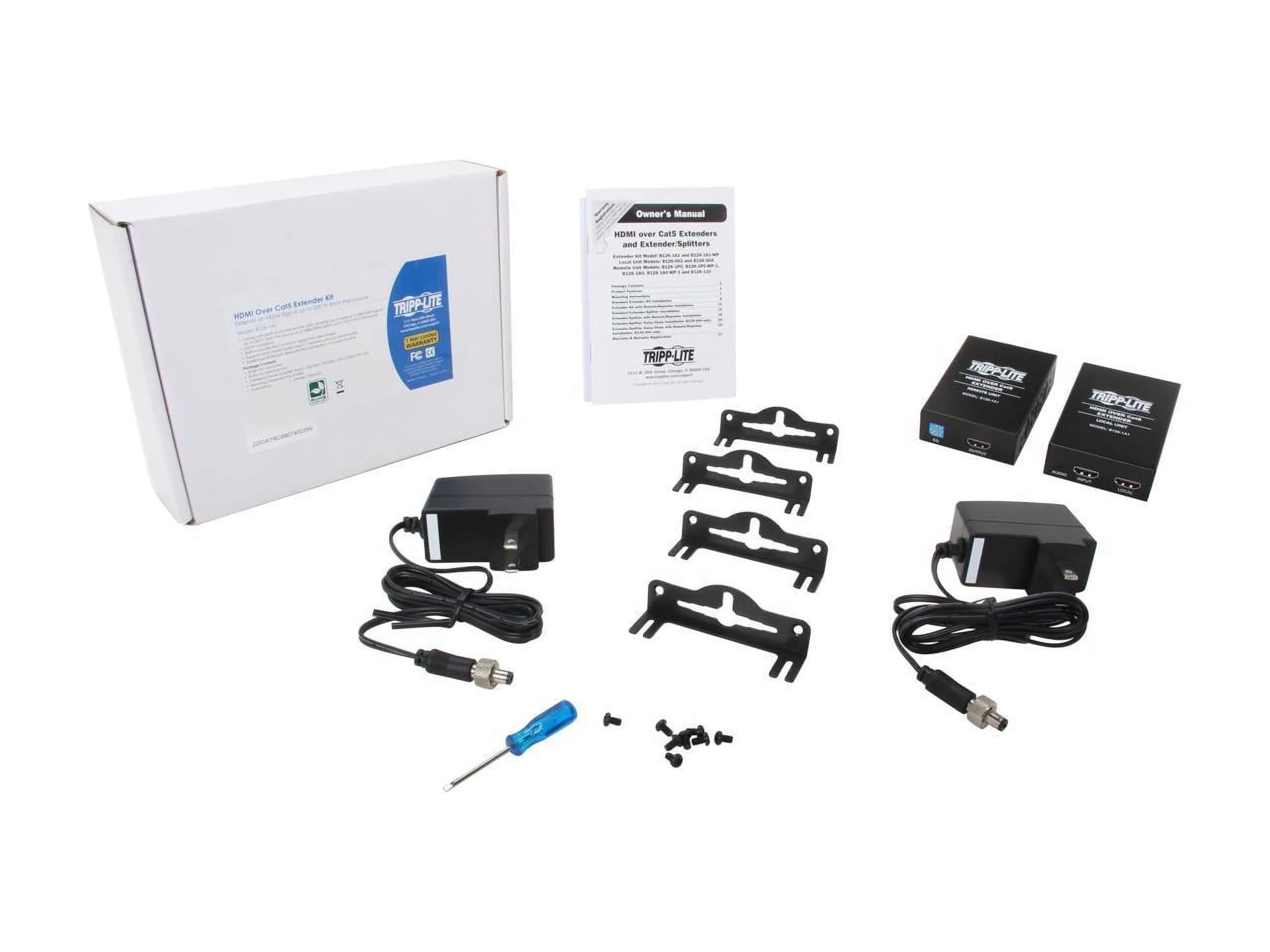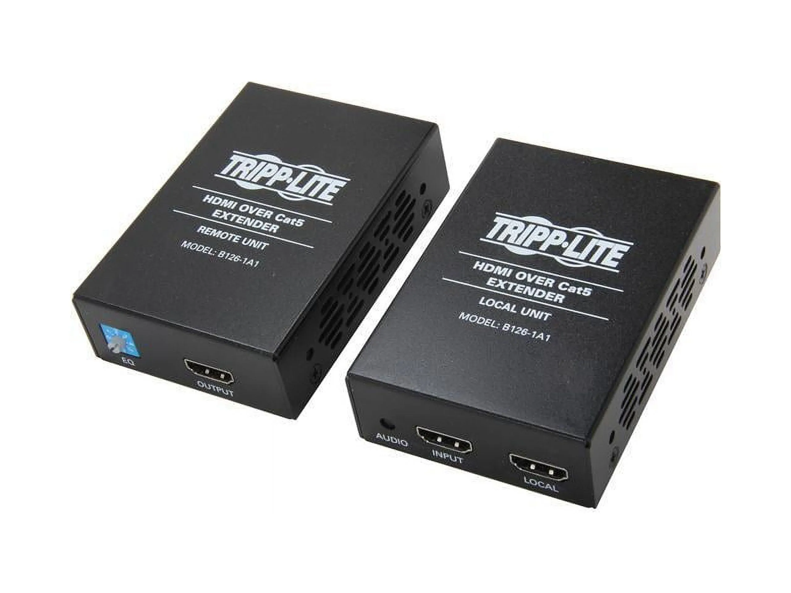 The Tripp Lite B126-1A1 active extender kit is the perfect solution for those who need to extend a HDMI signal over a long distance with a single Cat5e/6 patch cable. In addition to connecting a remote display, the local unit also provides a HDMI output for connecting to a local monitor. When using 24Awg, Solid Wire Cat5e/6 cable (Tripp Lite N202-Series), the B126-1A1 can extend a 1080i (60Hz) signal up to 200 ft.; or, a 1080p (60Hz) signal up to 150 ft.. The remote unit comes with a built-in Equalization setting, which allows for adjustment of the video image. No need to make separate purchases; the B126-1A1 kit comes with both local and remote units. Both stereo audio and 7.1 channel surround sound are supported, as well as HDCP protected content. Mounting hardware is included for both the local and remote units, allowing them to be rackmounted, wallmounted or pole mounted. Compliant with the Federal Trade Agreements Act (TAA) for GSA Schedule purchases. 1 year limited warranty. Key Features Two piece kit includes both local and remote units Extends a 1080i (60Hz) signal up to 200 ft.; or, a 1080p (60Hz) signal up to 150 ft. when using 24Awg, Solid Wire Cat5e/6 cable (Tripp Lite N202-Series) Remote unit features a built-in Equalization setting, allowing for adjustment of the video image HDCP compatible Compatible with both stereo audio and 7.1 channel surround sound audio Mounting hardware included for both the local and remote units, allowing them to be rackmounted, wallmounted or pole mounted Local unit includes a HDMI output for connecting a local monitor No software or drivers required Compatible with all operating systems Compliant with the Federal Trade Agreements Act (TAA) for GSA Schedule purchases 1 year limited warranty Package Includes B126-1A1 local unit B126-1A1 remote unit Screwdriver for adjustment of Equalization (x2) Mounting hardware (x2) External power supply (Input: 100-240V, 50/60Hz, 0.5A Output: 5V, 2A) Owner's manual