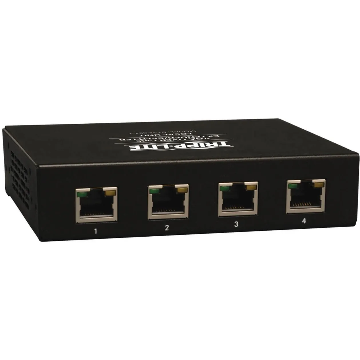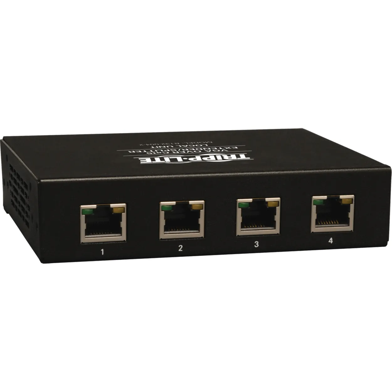 General InformationTripp Lite's B132-004-2 allows you to split a single VGA signal into 5 (1 local, 4 remote). Increase the number of displays to up to 25 (1 local, 24 remote) by daisy-chaining up to six B132-004-2 units together. Along with a B132-100-1 or B132-100-WP-1 remote receiver unit, you can extend a 1920 x 1440 (60Hz) signal up to 500 ft., or a 1024 x 768 (60Hz) signal up to 1,000 ft., when using 24Awg, Solid Wire Cat5e/6 cable, such as Tripp Lite's N022-01K-GY (Cat5) and N222-01K-GY (Cat6). The range and number of monitors can be further expanded by adding B132-110A (Video Only) repeater units. Connect up to 4 remote units in a repeater chain (3 repeaters and 1 receiver), with a monitor at each location. A 1920 x 1440 (60Hz) signal can be extended up to 500 ft. from the first repeater in the chain to the last receiver. A 1024 x 768 (60Hz) signal can be extended up to 1,000 ft. from the first repeater in the chain to the last receiver. For optimal video image quality between 500 and 1,000 ft., use Zero-Skew cable, such as Tripp Lite P524-01K. The transmitter unit features functionality that allows for the EDID information from a connected display to be copied and sent to the connected computer, providing optimal compatibility. Includes mounting hardware that allows unit to be wallmounted, rackmounted or pole mounted. Up to three B132-004-2 units can be mounted in 1U of rack space using a Tripp Lite B132-004-RB Extender/Splitter 19 in. rackmount bracket. Ideal for digital signage situations, such as retail, schools, churches, etc. Compliant with the Federal Trade Agreements Act (TAA) for GSA Schedule purchases. Features Splits a single VGA signal into 5 (1 local, 4 remote) Increase the number of displays to up to 25 (1 local, 24 remote) by daisychaining up to six B132-004-2 units together A B132-100-1 or B132-100-WP-1 remote receiver unit is required for each connected monitor Extends a 1920 x 1440 (60Hz) signal up to 500 ft., or a 1024 x 768 (60Hz) signal up to 1,000 ft., when using 24Awg, Solid Wire Cat5e/6 cable, such as Tripp Lite's N022-01K-GY (Cat5) and N222-01K-GY (Cat6) Can further expand the range and number of monitors by adding B132-110A (Video Only) repeaters EDID copy feature ensures optimal display compatibility Connect up to 4 remote units in a repeater chain (3 repeaters and 1 receiver), with a monitor at each location A 1920 x 1440 (60Hz) signal can be extended up to 500 ft. from the first repeater in the chain to the last receiver. A 1024 x 768 (60Hz) signal can be extended up to 1,000 ft. from the first repeater in the chain to the last receiver. For optimal image quality between 500 and 1,000 ft., use Zero-Skew cable, such as Tripp Lite P524-01K Includes mounting hardwarethat allows unit to be wallmounted, rackmounted or pole mounted. Up to three B132-004-2 units can be mounted in 1U of rack space using a Tripp Lite B132-004-RB Extender/Splitter 19 in. rackmount bracket Ideal for digital signage situations, such as retail, schools, churches, etc. Compliant with the Federal Trade Agreements Act (TAA) for GSA Schedule purchases Technical InformationConnectivity Technology: WiredNumber of Input Devices Supported: 1Number of Output Devices Supported: 5Maximum Operating Distance: 1000 ftVideoMaximum Video Resolution: 1920 x 1440Interfaces/PortsNetwork (RJ-45): YesVGA In: YesVGA Out: YesNumber of Network (RJ-45) Ports: 4Number of VGA Inputs: 1Number of VGA Outputs: 1