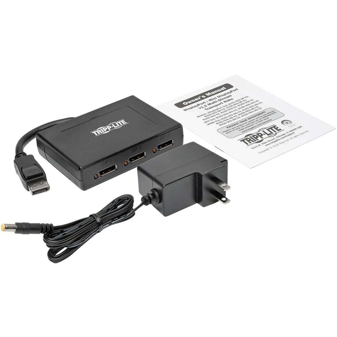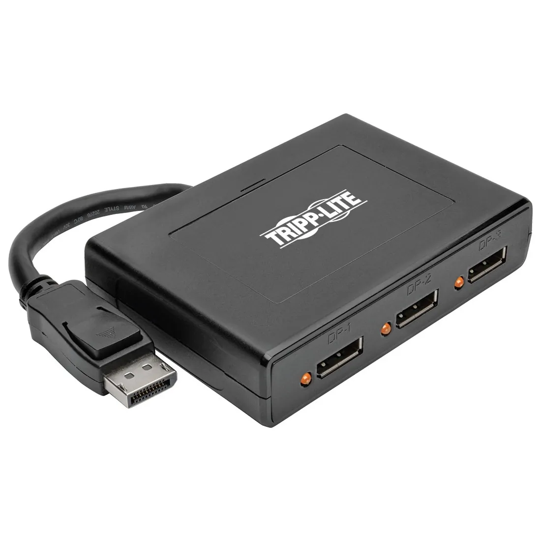 General InformationThe B156-003-V2 3-Port DisplayPort 1.2 MST Hub connects up to three DisplayPort monitors to the DisplayPort output on your computer. Ideal for digital signage in schools, churches, conference rooms, trade shows, hotels and retail outlets, this hub allows you to display the same image on all three monitors, extend the desktop across them, or combine all three into one large monitor in video wall mode.The B156-003-V2 is compliant with DisplayPort 1.2 and backward compatible with versions 1.1 and 1.1a with the feature set being limited to that of your equipment. It supports Ultra High Definition (UHD) video resolutions up to 3840 x 2160 (4K x 2K) at 24/30 Hz with the number of 4K monitors limited according to your graphics card's specifications. In video wall mode, this hub supports expanded resolutions, such as 5760 x 1080 in a horizontal 1 x 3 monitor configuration or 1920 x 3240 in a vertical 3 x 1 configuration.This MST hub also supports HDCP, EDID, DDC and 48-bit Deep Color (16 bits per channel), as well as DTS-HD, Dolby TrueHD and 7.1-channel surround sound audio. It works with all operating systems. Plug-and-play convenience means no software or drivers are needed. A built-in six-inch cable connects directly to a DisplayPort source. LEDs indicate when the monitors are receiving a signal. The B156-003-V2 complies with the Federal Trade Agreements Act (TAA) for GSA Schedule purchases. Computer with DisplayPort 1.2-compatible graphics card (e.g. AMD Radeon with AMD Eyefinity) required for video wall mode. Backward compatible with most DisplayPort 1.1a equipment running current graphics drivers with feature set limited to that of your equipment. Compatibility with older graphics cards not guaranteed. MST-compliant graphics cards are limited to a bandwidth of 21.6 Gbps amongst all monitors with higher resolution monitors using up more bandwidth. 1080p monitors will use up approximately 22% of bandwidth, whereas 4K monitors will use 40% or more. As each monitor will be different, it is necessary to verify the percentage of bandwidth being used by each monitor in the display settings interface of your graphics card. If the total percentage of bandwidth taken up by all the connected monitors exceeds 100%, an image will not display on one or more of them. Computer with DisplayPort 1.2-compatible graphics card (e.g. AMD Radeon with AMD Eyefinity) required for video wall mode Backward compatible with most DisplayPort 1.1a equipment running current graphics drivers with feature set limited to that of your equipment. Compatibility with older graphics cards not guaranteed. Mac OS X does not support MST for NVIDIA and Intel Graphics Processor Units, limiting video display on connected monitors to mirror mode. MST-compliant graphics cards are limited to a bandwidth of 21.6 Gbps amongst all monitors with higher resolution monitors using up more bandwidth. 1080p monitors will use up approximately 22% of bandwidth, whereas 4K monitors will use 40% or more. As each monitor will be different, it is necessary to verify the percentage of bandwidth being used by each monitor in the display settings interface of your graphics card. If the total percentage of bandwidth taken up by all the connected monitors exceeds 100%, an image will not display on one or more of them. Monitor(s) with DisplayPort input VideoMaximum Video Resolution: 3840 2160Interfaces/PortsDisplayPort: YesNumber of DisplayPort Inputs: 1Number of DisplayPort Outputs: 3Power DescriptionInput Voltage: 5 V DCPhysical CharacteristicsHeight: 0.9"Width: 4.3"Depth: 3"Weight (Approximate): 4 oz