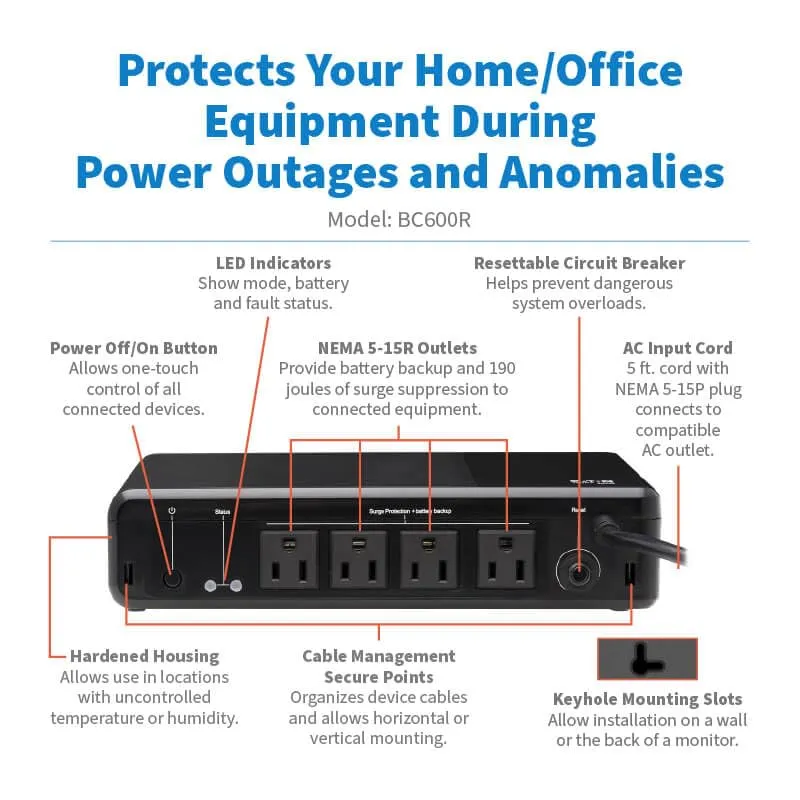 Tripp Lite series 600VA 300W 120V Standby UPS - 4 NEMA 5-15R Outlets (Surge + Battery Backup), 5-15P Plug, Desktop