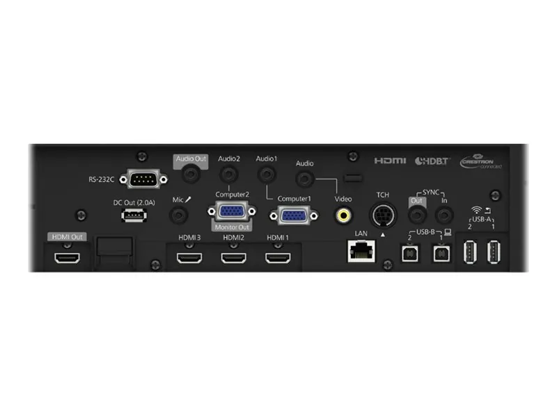• Inputs: {'HDMI': '3 (HDMI Type-A)', 'VGA': '2 (DE-15/DB-15, 1 input, 1 input/output)', 'Composite Video': '1 (RCA)', 'USB': '2 x USB-A 2.0 (for memory/document camera), 2 x USB-B 2.0 (for display, audio, control)', 'Audio In': '3 x 3.5mm Mini-Stereo', 'Microphone In': '1 x 3.5mm Mini-Stereo', 'Ethernet': '1 (RJ45)', 'Serial': '1 (RS-232C)', 'Sync In/Out': 'Yes'}