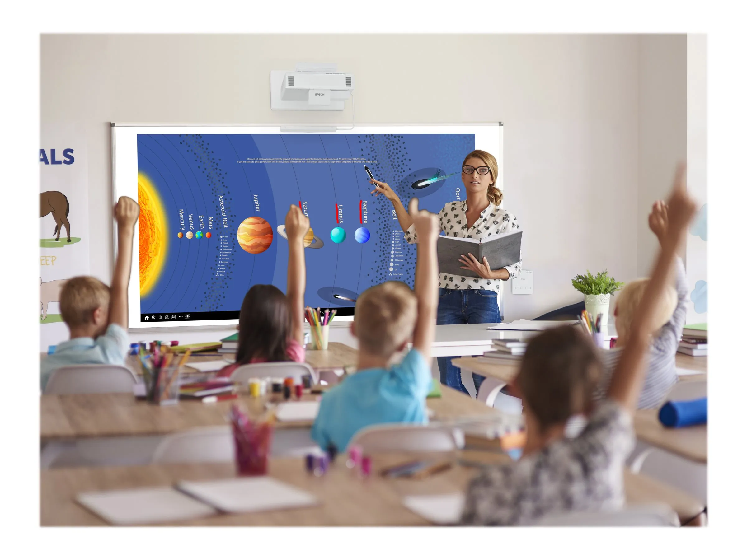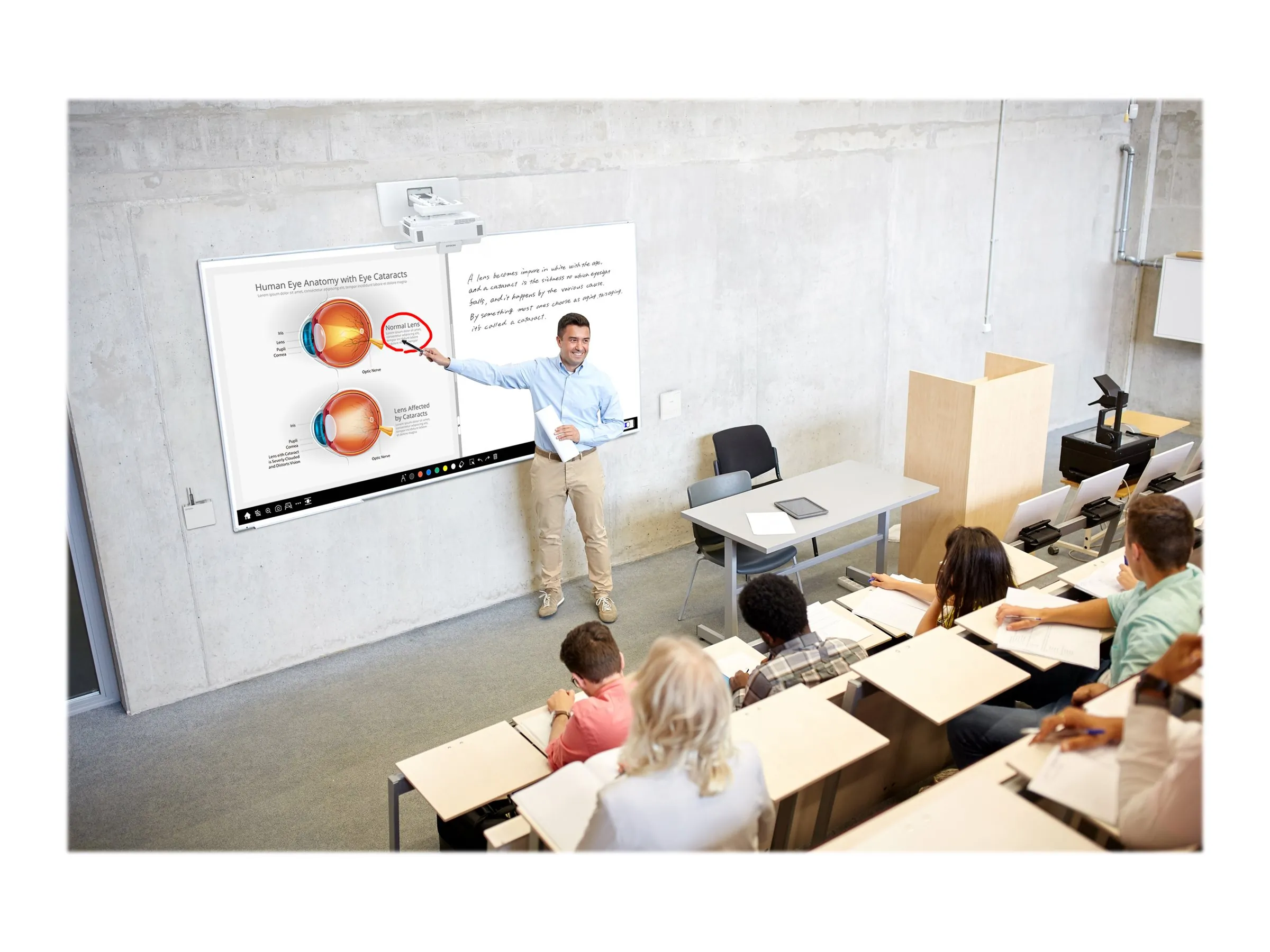 The Epson BrightLink 1480Fi is a 1080p Full HD interactive laser projector designed to transform classrooms and meeting spaces into dynamic collaborative environments. With 5,000 lumens of both color and white brightness and a 2,500,000:1 dynamic contrast ratio, it delivers clear, vibrant images even in well-lit rooms. Its ultra-short throw ratio minimizes shadows and glare. The projector features a virtually maintenance-free laser light source with a life of up to 20,000 hours, eliminating the need for lamps. It offers out-of-the-box pen-based interactivity for two users and can be upgraded with an optional touch module for multi-touch capabilities. The 1480Fi supports PC-free digital whiteboard functions, allowing users to draw, save, print, and email content directly. Built-in wireless connectivity enables seamless sharing from up to 50 compatible devices, and it includes a trial subscription to SMART Learning Suite.