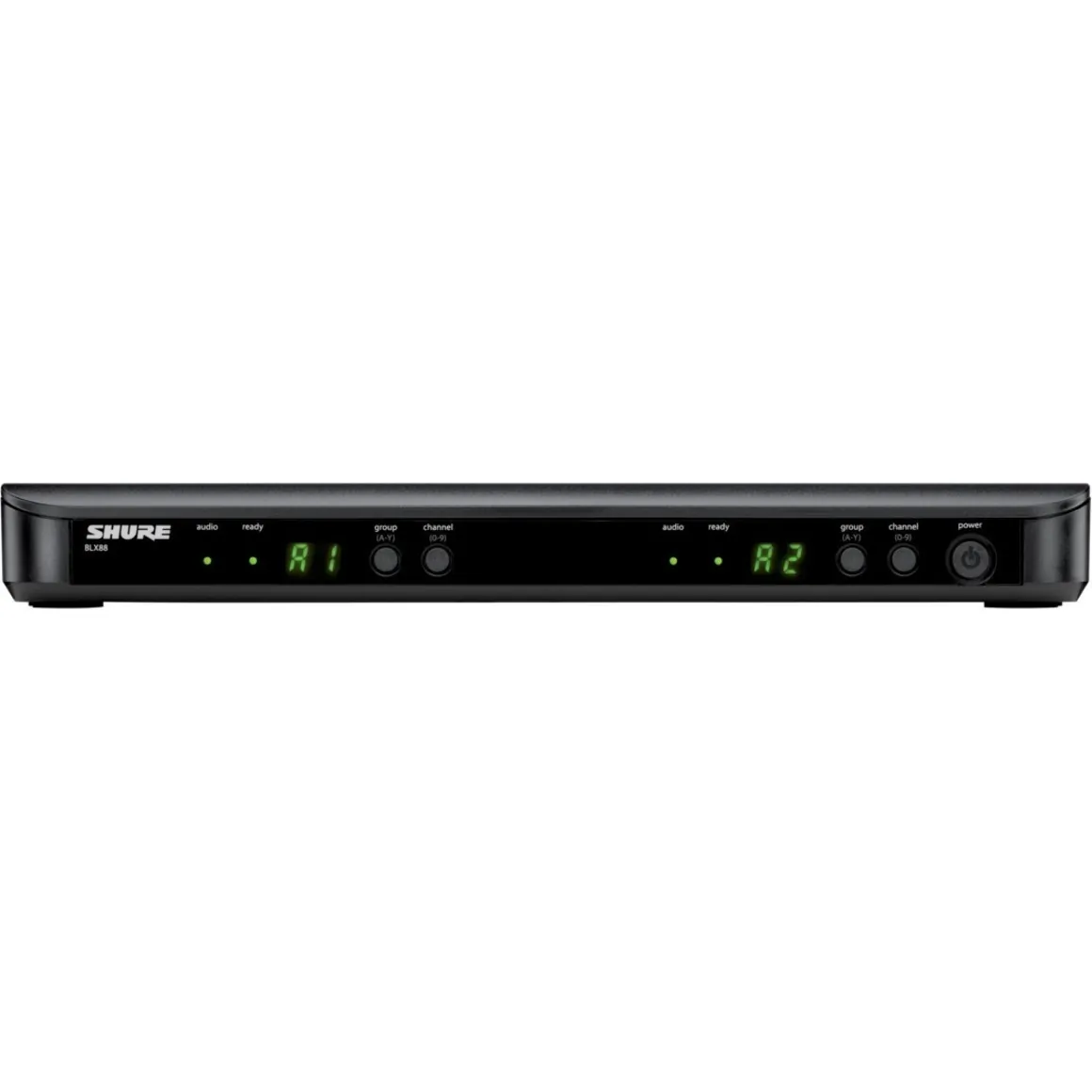 The Shure BLX288 Dual Wireless Vocal System provides reliable performance with two handheld microphones featuring the Beta58A dynamic capsule. Designed for ease of use, this wireless system is ideal for professional vocal applications. With quick setup and a range of up to 300 feet, it delivers high-quality sound in a variety of performance environments.