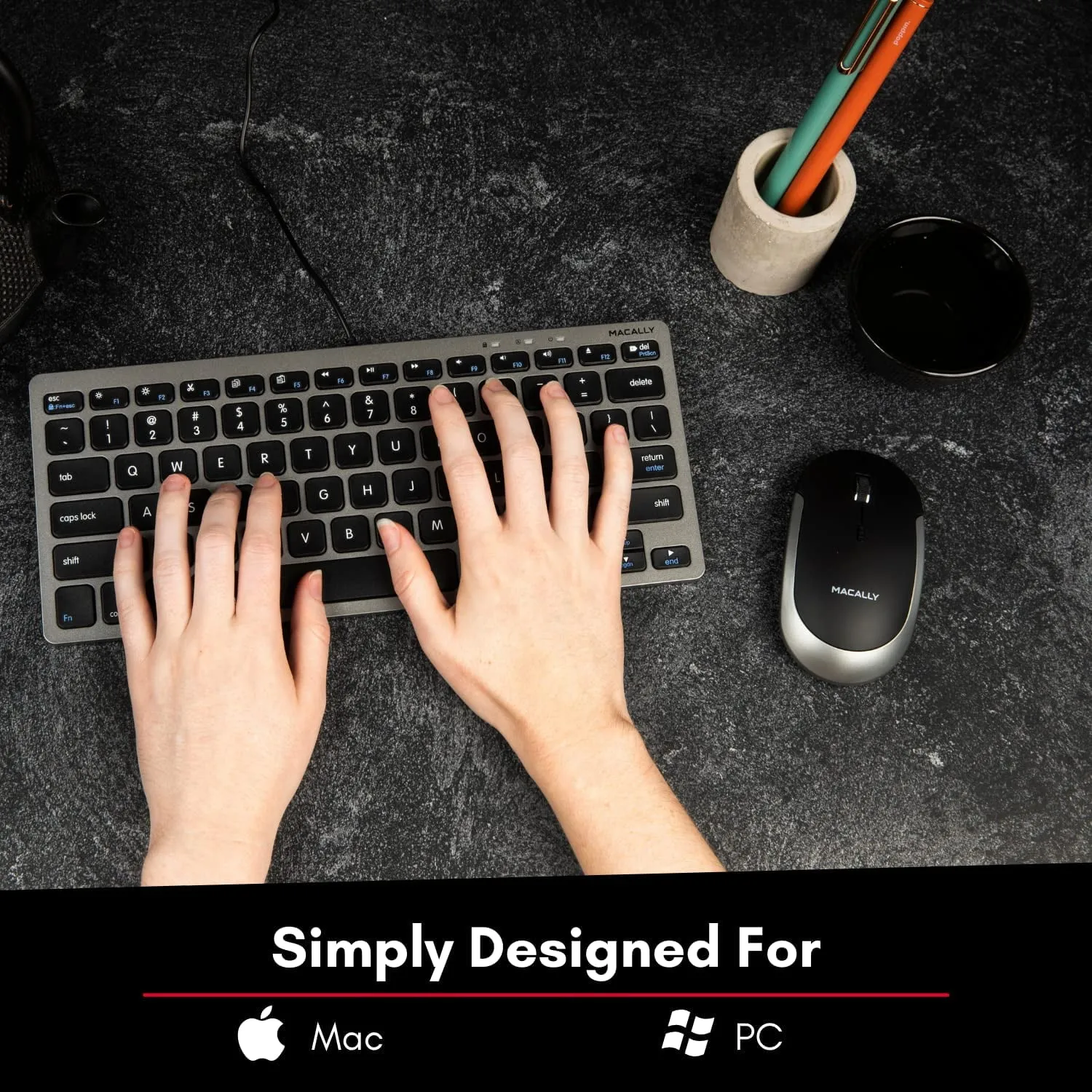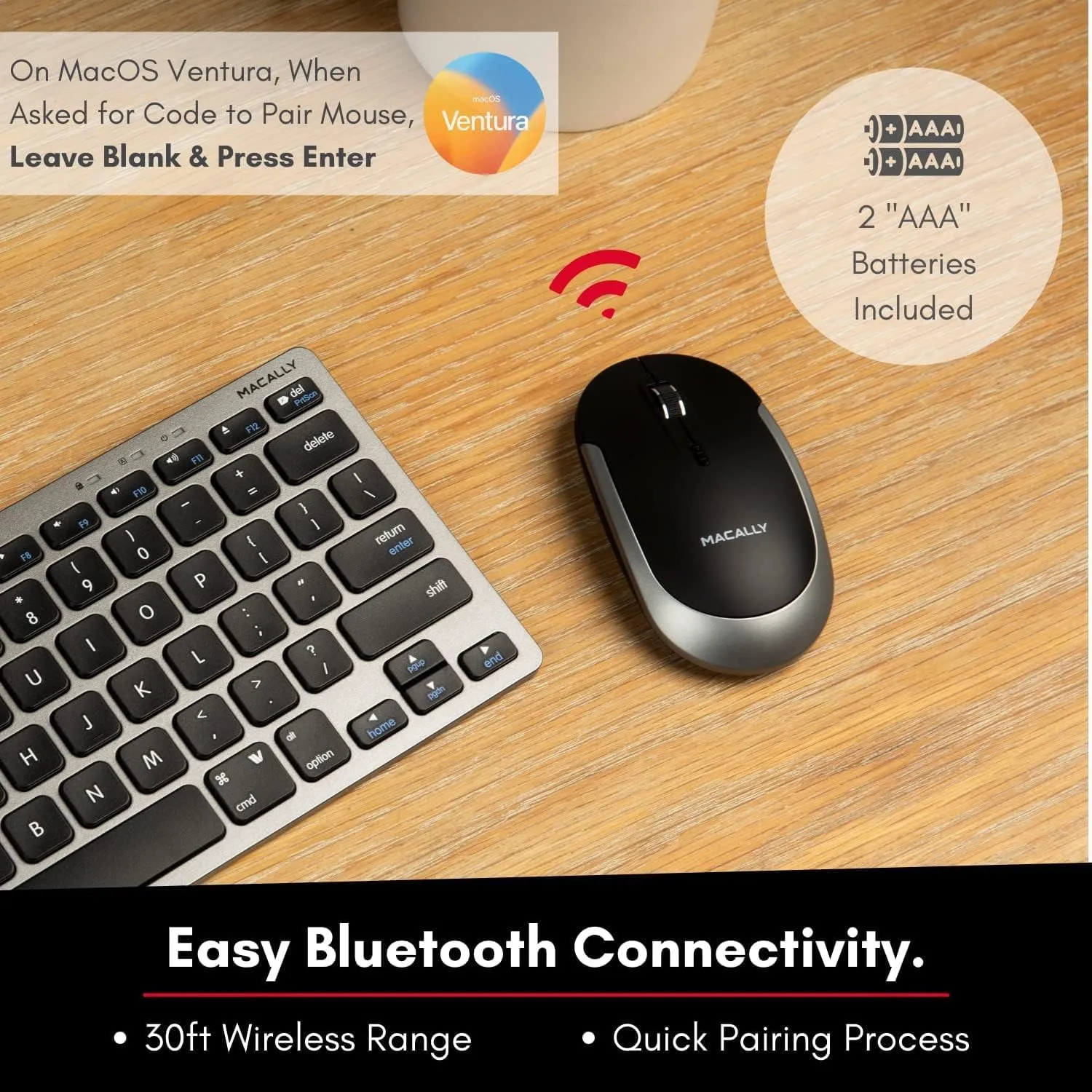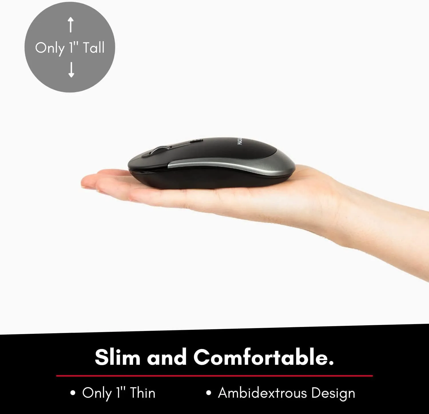 The Bluetooth Quiet Click Mouse is designed to provide a seamless and silent experience for both Mac and PC users. Featuring a sleek black and space gray design, it combines elegance with functionality. Perfect for office settings or home use, this mouse offers precise tracking and comfortable ergonomics.