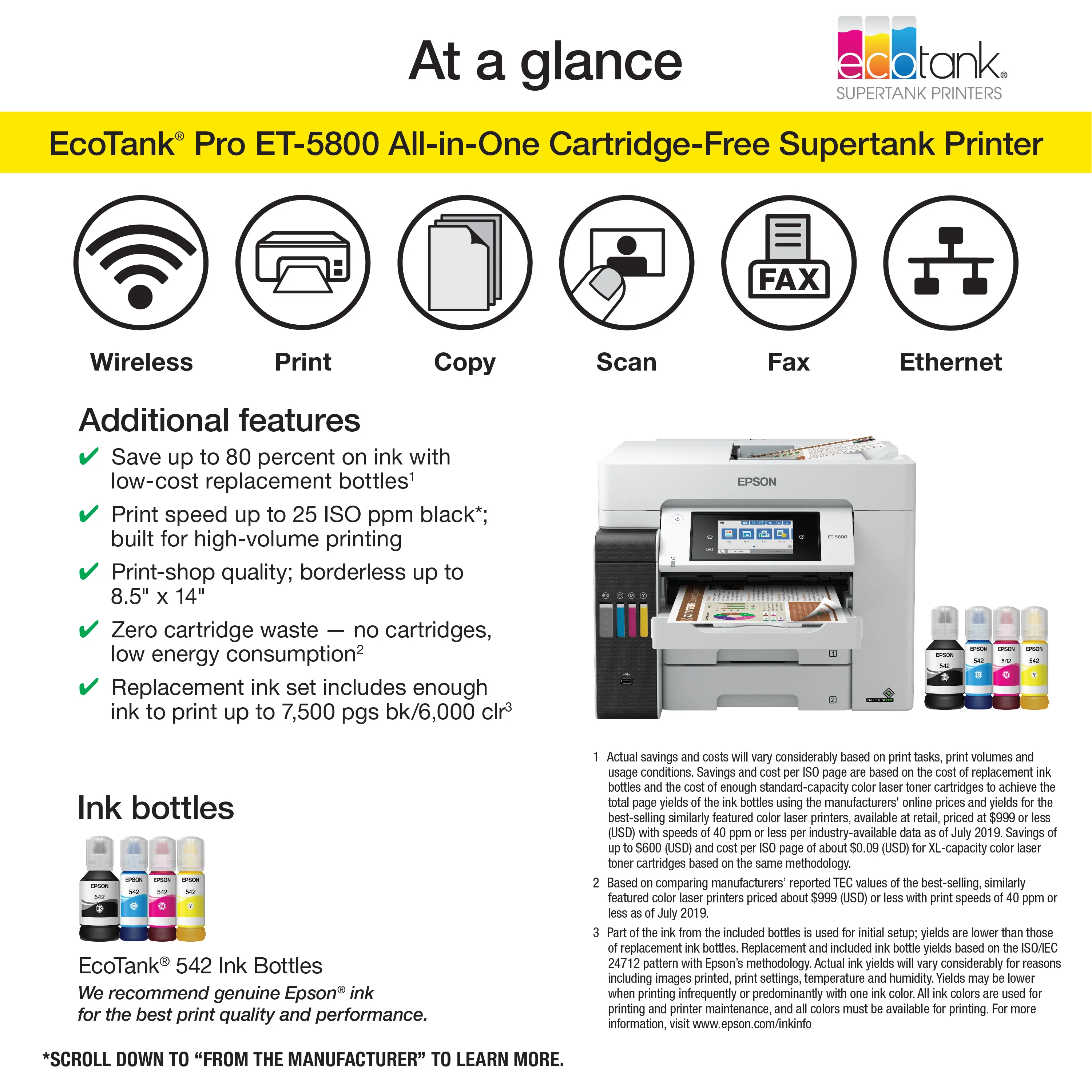 Featuring a 250-sheet paper capacity, a 50-sheet automatic document feeder (ADF), and a user-friendly touchscreen interface, the ET-5800 enhances productivity while being Energy Star certified for efficiency.