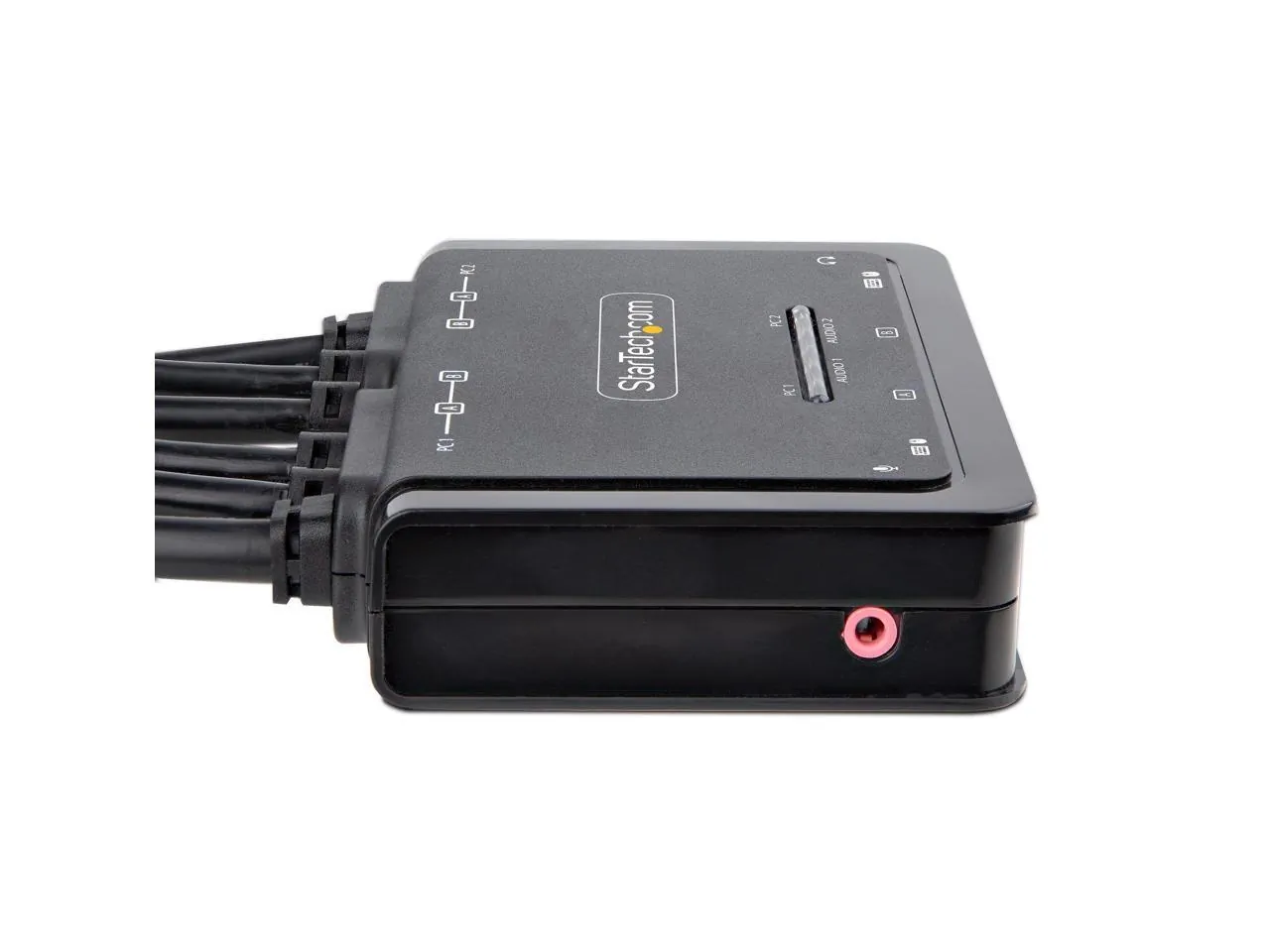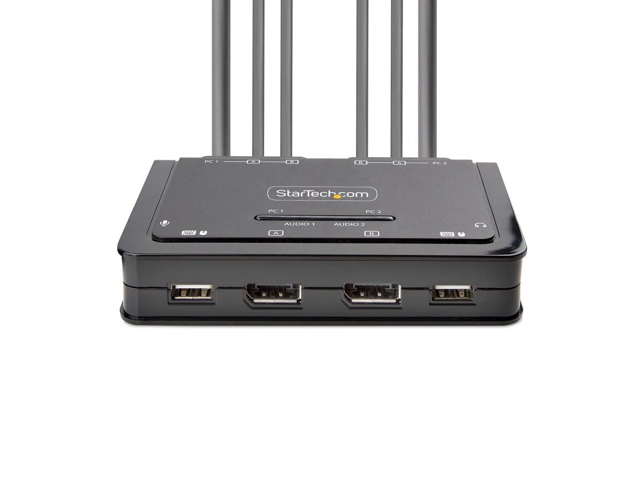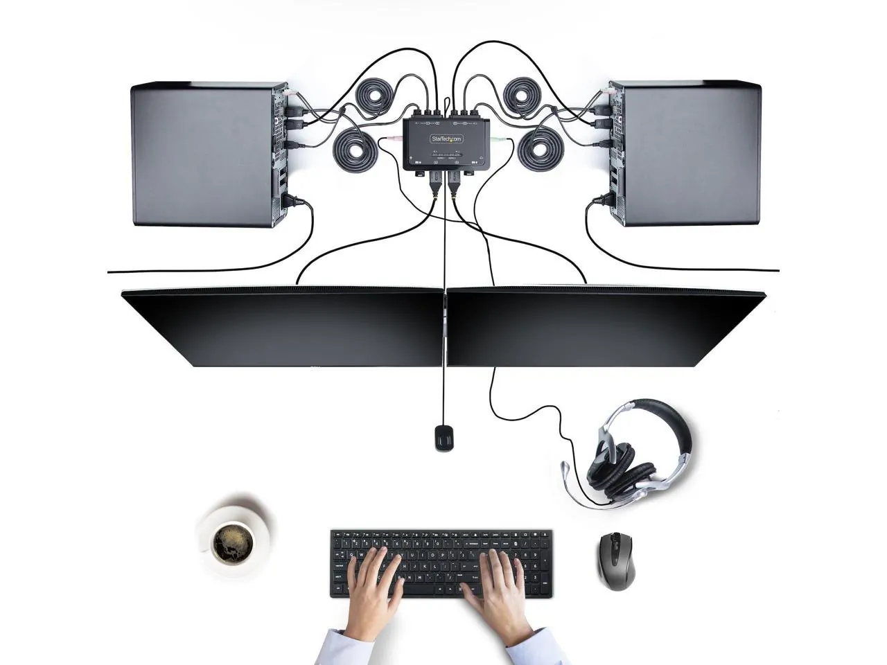 The StarTech 2-Port Dual-Monitor DisplayPort KVM Switch allows you to control two computers using a single keyboard, mouse, and dual-monitor setup. This product supports high-resolution displays up to 4K and offers seamless switching between the connected systems. Ideal for multitaskers and professionals needing efficient control over multiple machines, this KVM switch simplifies your workspace while maintaining optimal performance.