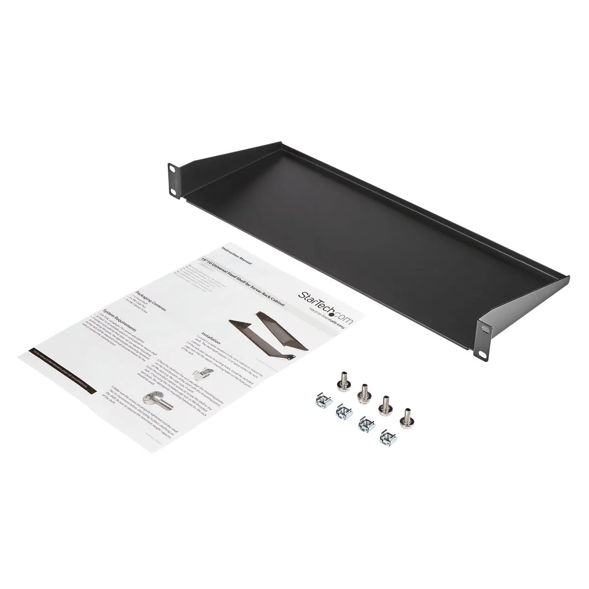 The CABSHELF1U 1U (Black) Universal Fixed Server Rack Cabinet Shelf lets you add a compact fixed storage shelf to any standard 19-inch server rack or cabinet with front mount options.This TAA compliant product adheres to the requirements of the US Federal Trade Agreements Act (TAA), allowing government GSA Schedule purchases.