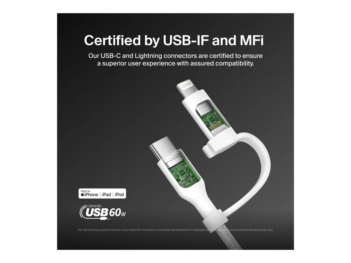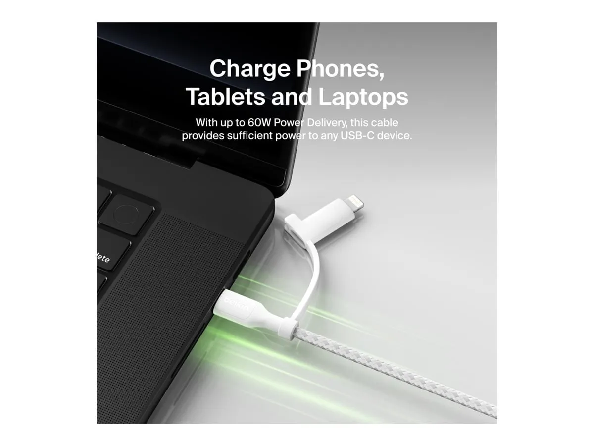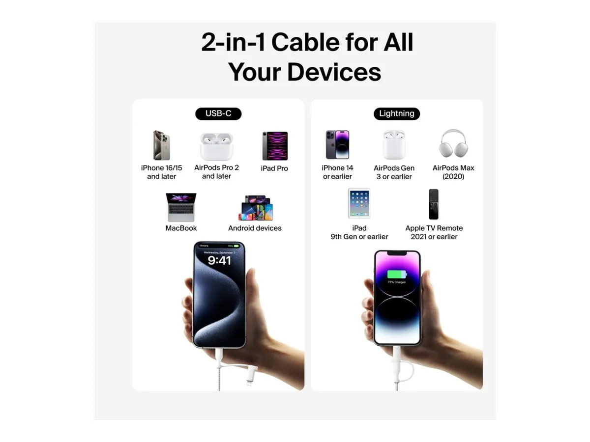 The 60W Braided 2in1 USBC to LTG Charging Cable is designed for style and efficiency. Measuring 1.5 meters in length, this cable delivers fast charging capabilities while being durable and tangle-free. The sleek white finish complements any device, making it a perfect addition to your tech accessories.