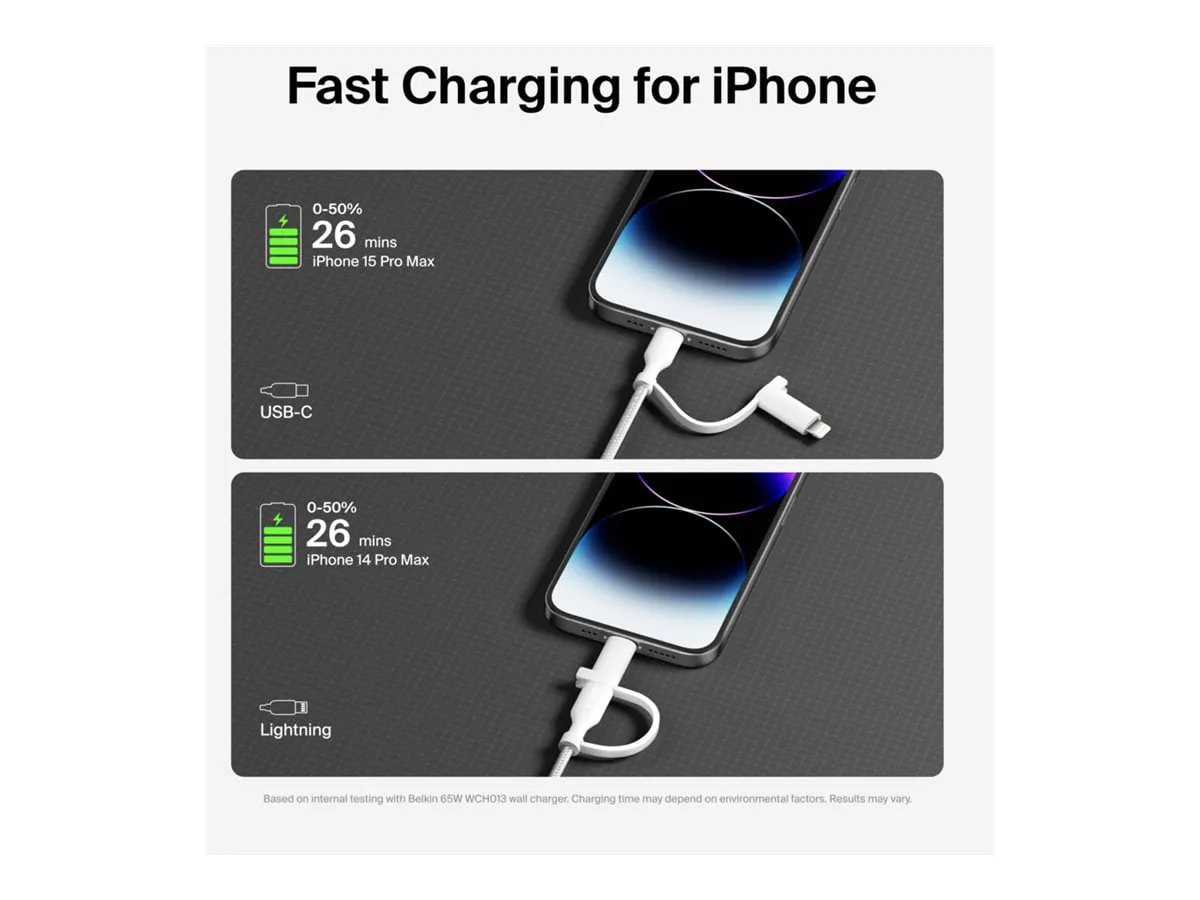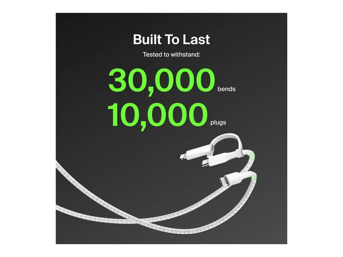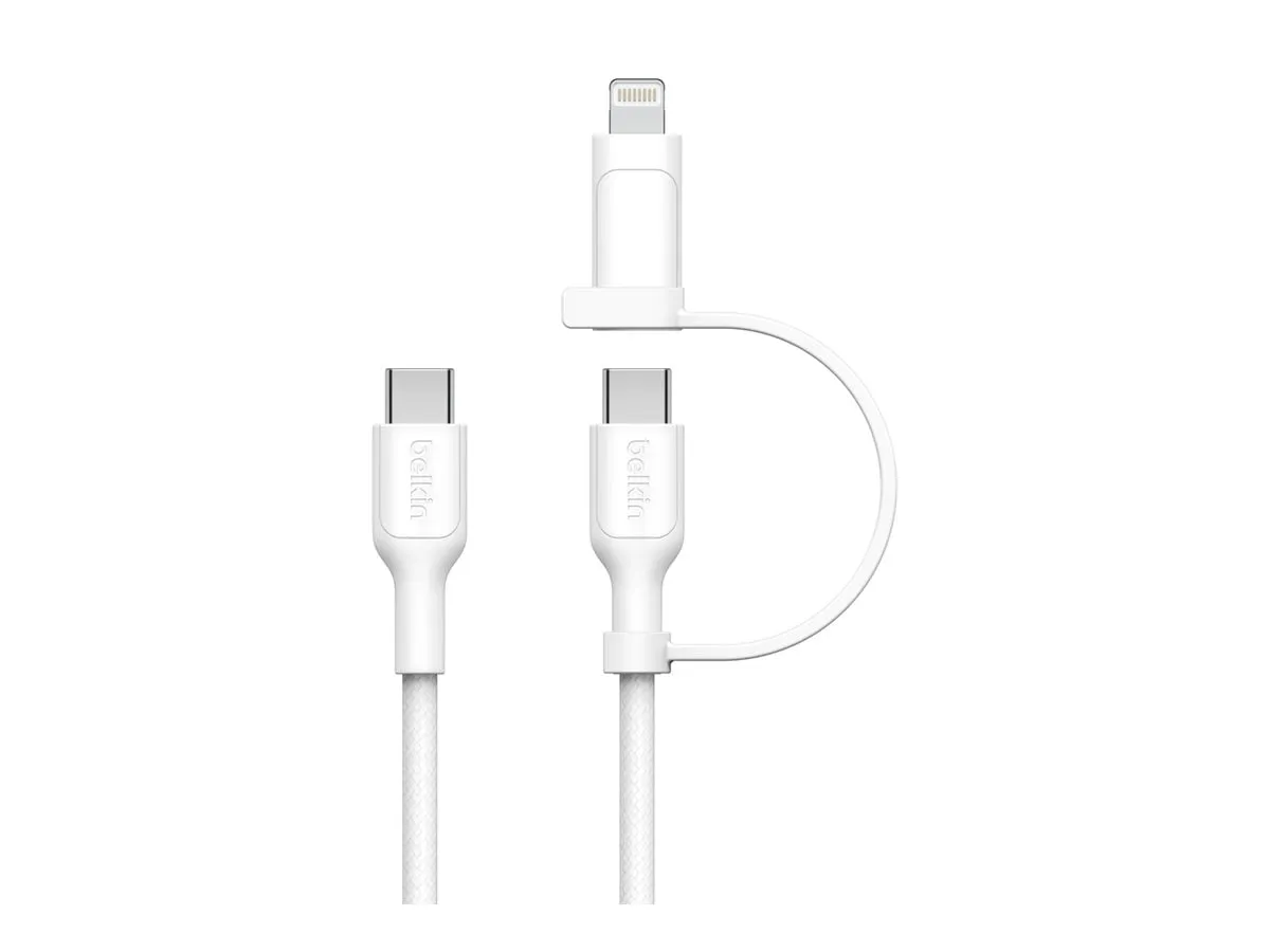 The 60W Braided 2in1 USBC to LTG Charging Cable is designed for style and efficiency. Measuring 1.5 meters in length, this cable delivers fast charging capabilities while being durable and tangle-free. The sleek white finish complements any device, making it a perfect addition to your tech accessories.