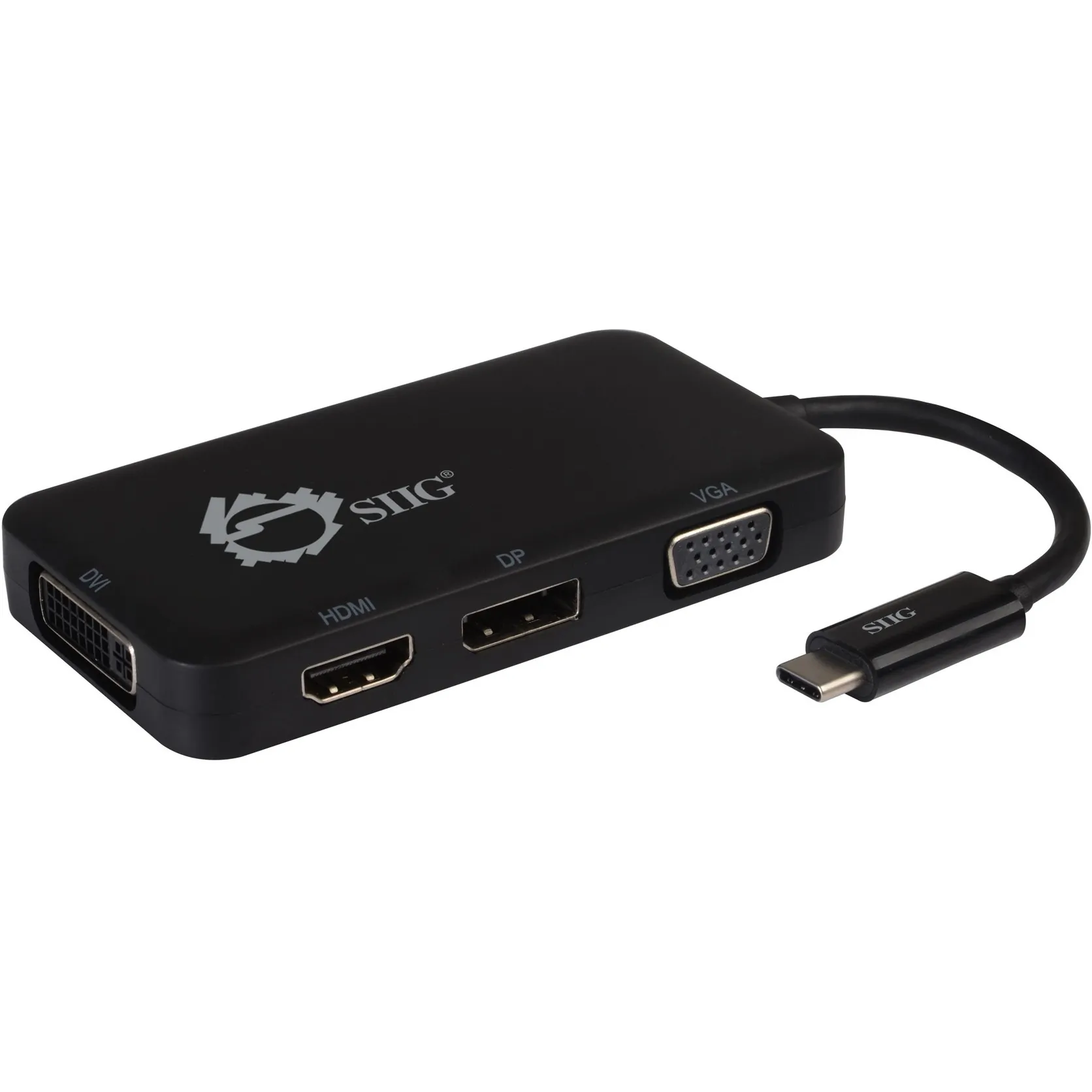 General InformationEasily add a DisplayPort, HDMI, DVI, or VGA display to a Thunderbolt 3 or DisplayPort Alternate mode capable USB-C port Easily adds a 4K display to your Thunderbolt 3 and USB-C DisplayPort Alt enabled Ultrabook, laptop or desktop. Note: The USB-C source connection must support DisplayPort Alternate Mode transmission in order for the adapter's video connectors to pass video and audio Supports UHD 4K@60Hz (DisplayPort) & 4K@30Hz (HDMI) and HD 1080p@60Hz (DVI & VGA) resolutions. Note: Supports video output to one connected display at a time Supports high quality 7.1ch audio through DisplayPort or HDMI connection Supports Thunderbolt 3 technology and USB-C with DisplayPort Alternate mode (DisplayPort Alt) Compact and lightweight designed to quickly add an additional display convenient to use at home, office or travel makes this the perfect add-on to your workstation Bus-powered for extra portability, no need to take an external power adapter while on the go Convenient plug and play operation, no driver installation required Technical InformationConnectivity Technology: WiredDevice Supported: Notebook/Desktop PCCable Length: 9.65"Features: LightweightInterfaces/PortsHost Interface: USB Type CVGA: YesDisplayPort: YesHDMI: YesDVI: YesThunderbolt: YesPhysical CharacteristicsColor: BlackHeight: 2"Length: 9.7"Weight (Approximate): 1.92 ozMiscellaneousPackage Contents: USB-C to 4-in-1 Multiport Video Adapter - DVI/VGA/DP/HDMI User Reference Guide Environmentally Friendly: YesEnvironmental Certification: RoHSCountry of Origin: ChinaWarrantyLimited Warranty: 1 Year