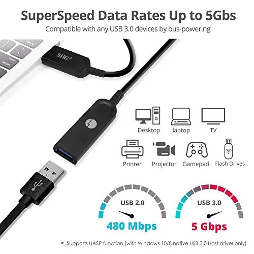 • Active USB 3.0 cable supports data transfer speeds up to 5 Gbps
