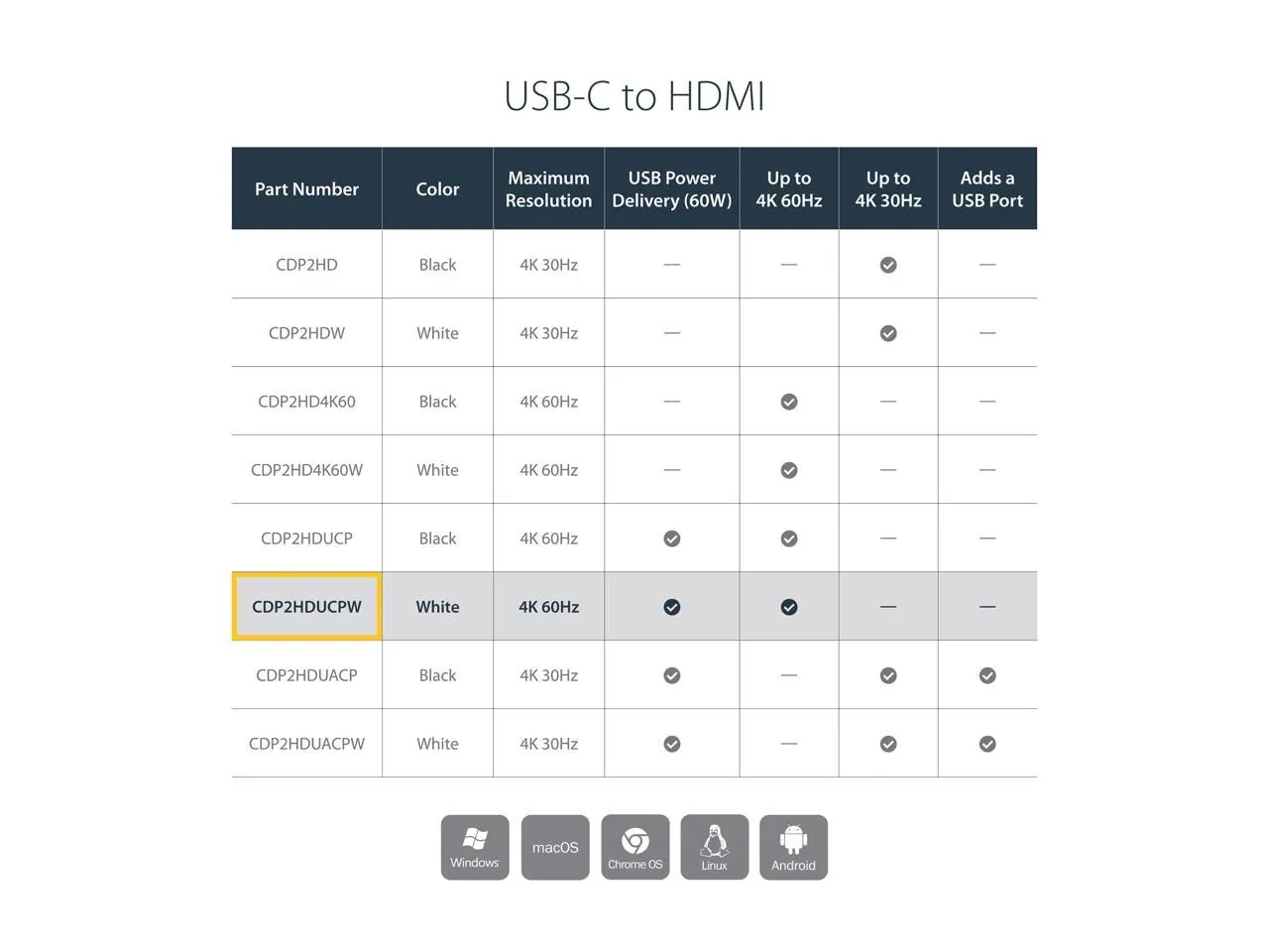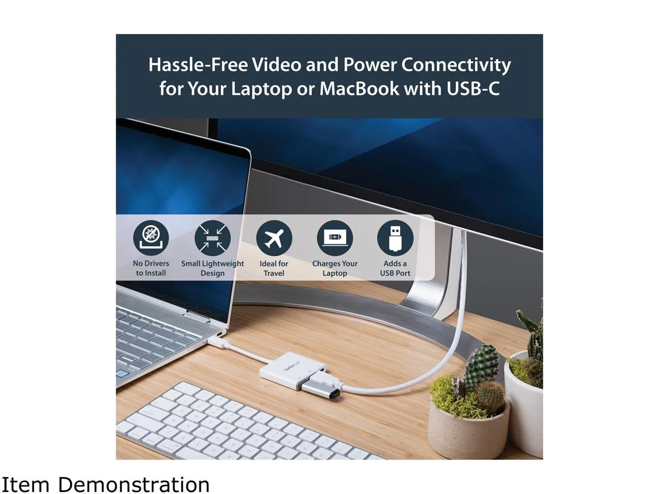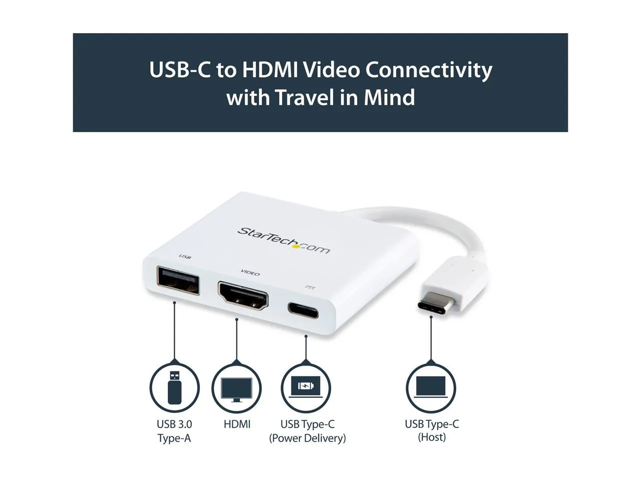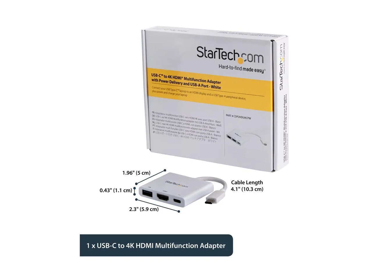 This USB-C multiport adapter with HDMI lets you add vital connections to your MacBook or Windows laptop, through a single USB-C port. For maximum productivity, connect your USB-C or Thunderbolt 3 laptop to a 4K 30Hz monitor, using this USB-C to 4K HDMI adapter. You can also connect to an HDMI projector or TV in a boardroom or other meeting space, to deliver presentations on a shared screen. The USB-C adapter lets you power and charge your USB-C laptop during a presentation or while you're working, with a USB-C Power Delivery port. Even if your laptop has only a single USB-C port available, you can keep your laptop powered. This USB-C multiport adapter offers a USB 3.0 port that's backward compatible with older USB devices - ideal for data transfers, syncing, or charging your mobile devices. The compact all-in-one adapter is a vital accessory for your USB-C laptop. With its small-footprint design, you can take it with you anywhere you would use your laptop. Note: To ensure full adapter functionality, your laptop's USB-C port must support USB Power Delivery and DP Alt Mode. Power your laptop with 60W Power Delivery using this multiport adapter and a USB Type-C power adapter Connect a USB 3.0 Type-A device, like a flash drive or a mouse, to your Windows or MacBook Pro laptop Carry the portable USB-C all-in-one adapter with you wherever you go Deliver your presentation on a UHD 4K HDMI monitor with this USB-C video adapter