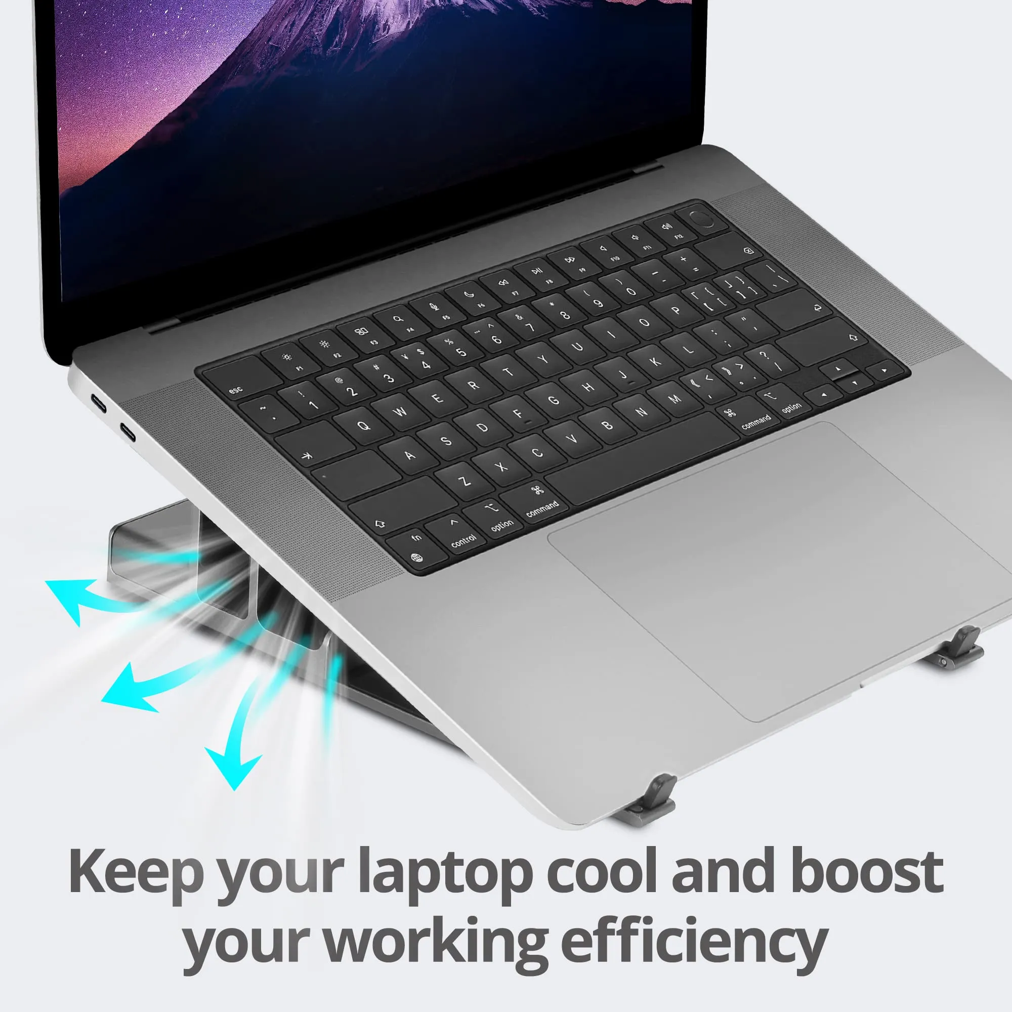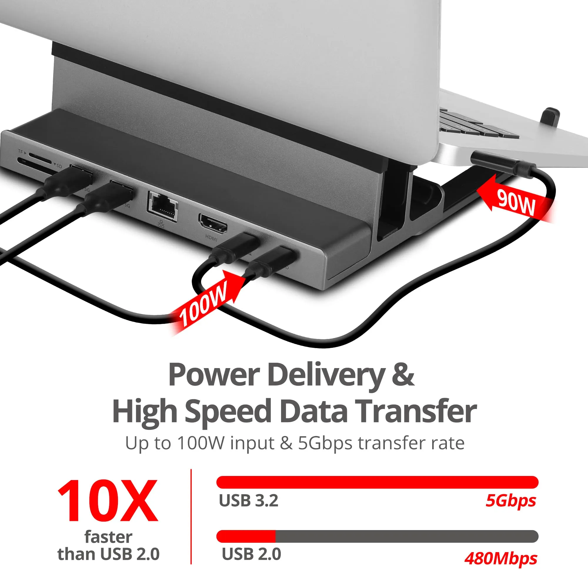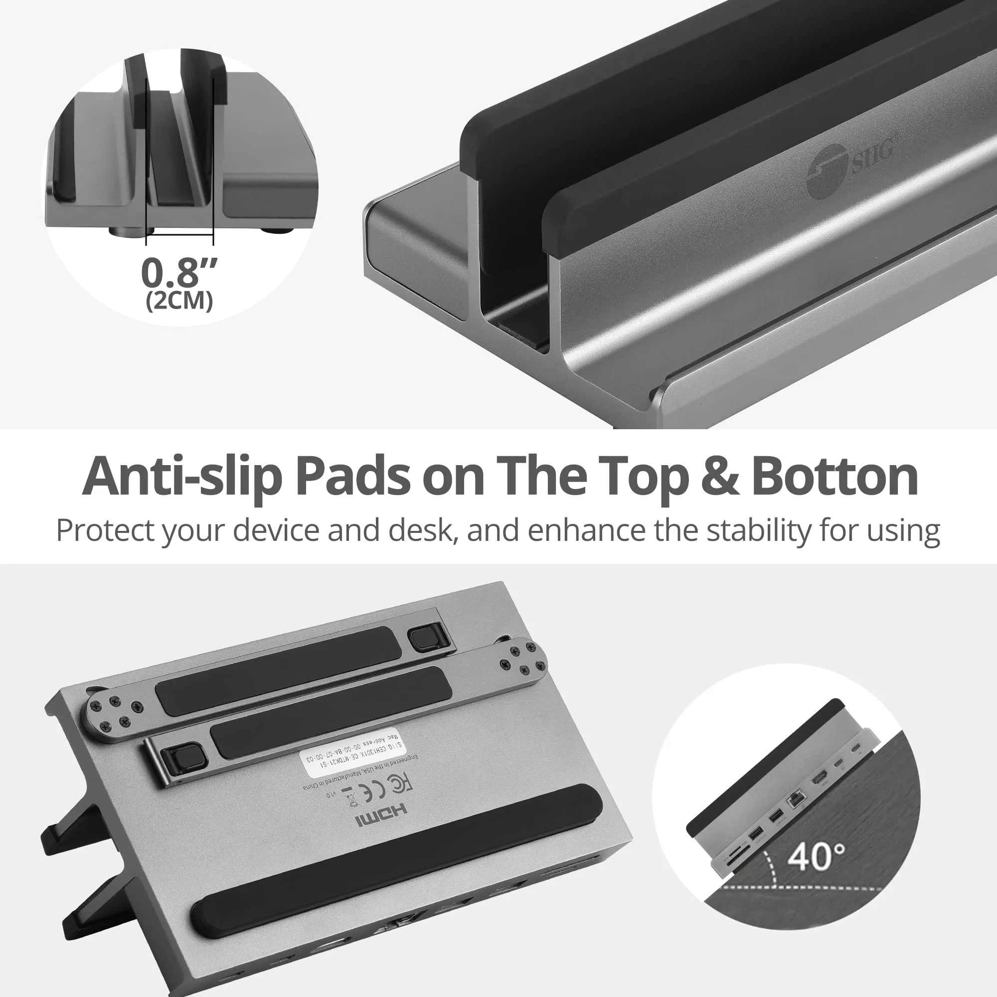 The sleek aluminum housing adds durability, and anti-slip pads on the top and bottom ensure stability on any surface. Perfect for laptops and tablets under 14 inches, this docking station enhances your productivity while keeping your workspace organized.