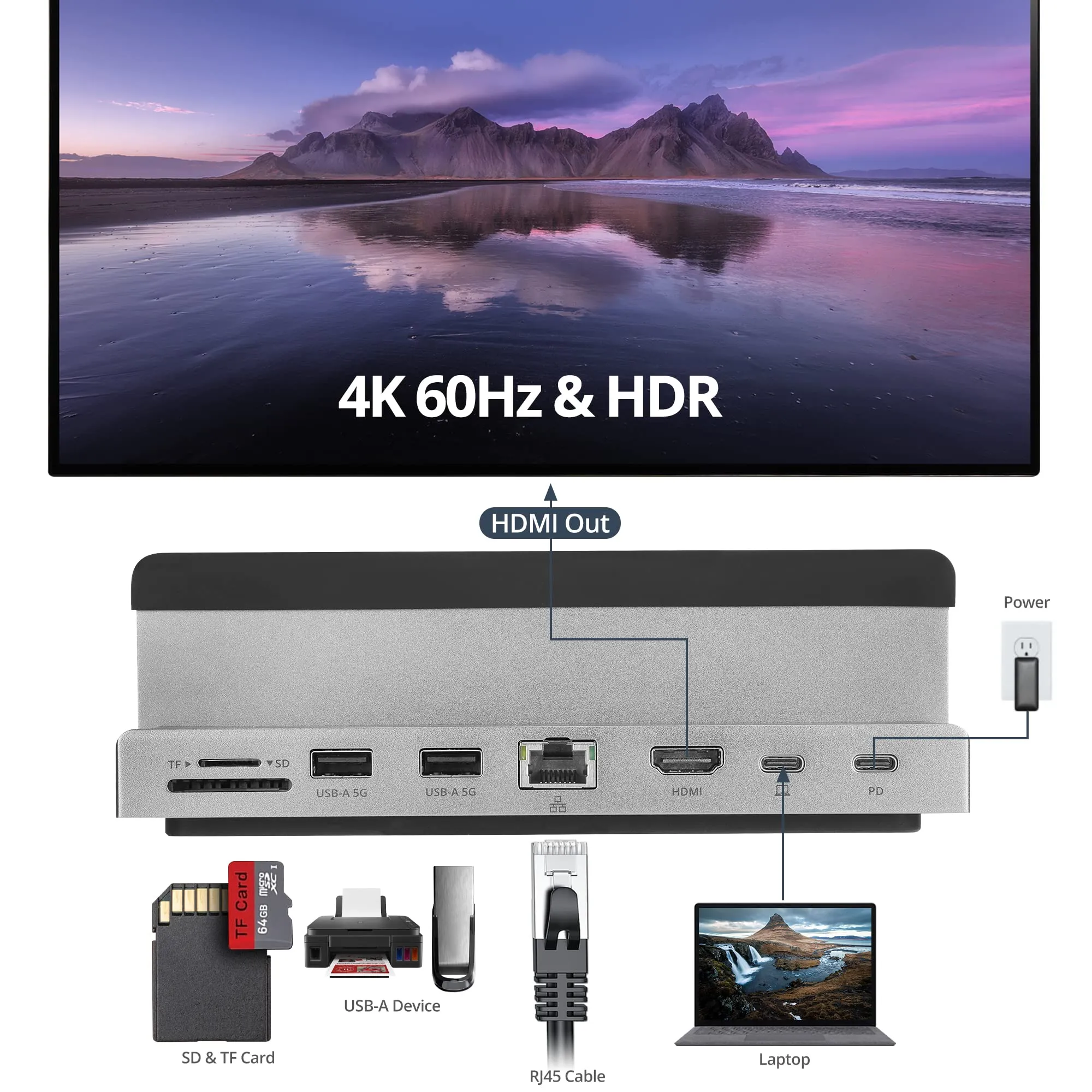 Enjoy stunning visuals with HDMI 4K@60Hz display support, along with two USB-A 5Gbps ports for high-speed data transfer. Connect to wired networks effortlessly with gigabit Ethernet and easily access files from SD/Micro SD (TF) cards. The USB-C port supports Power Delivery, allowing you to charge devices up to 100W, making it compatible with Windows and MacBook Pro computers.
