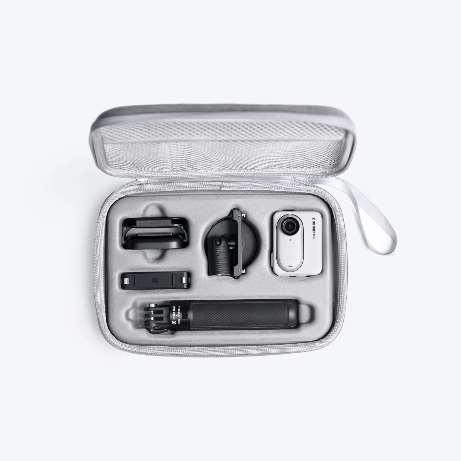 This kit includes a rugged carry case designed specifically for the Insta360 GO 3 camera. The carry case features a custom fit to keep your device safe while on the go. Additionally, the included Insta360 Pivot Stand allows you to easily set up and capture your adventures hands-free. Both items are essential for maximizing your experience with the Insta360 GO 3.