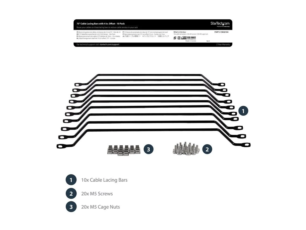 StarTech.com Cable Lacing Bar - 10 Pack - Steel - Horizontal Cable Management Bar - Rack Cable Organizer - Cable Lacing Tool