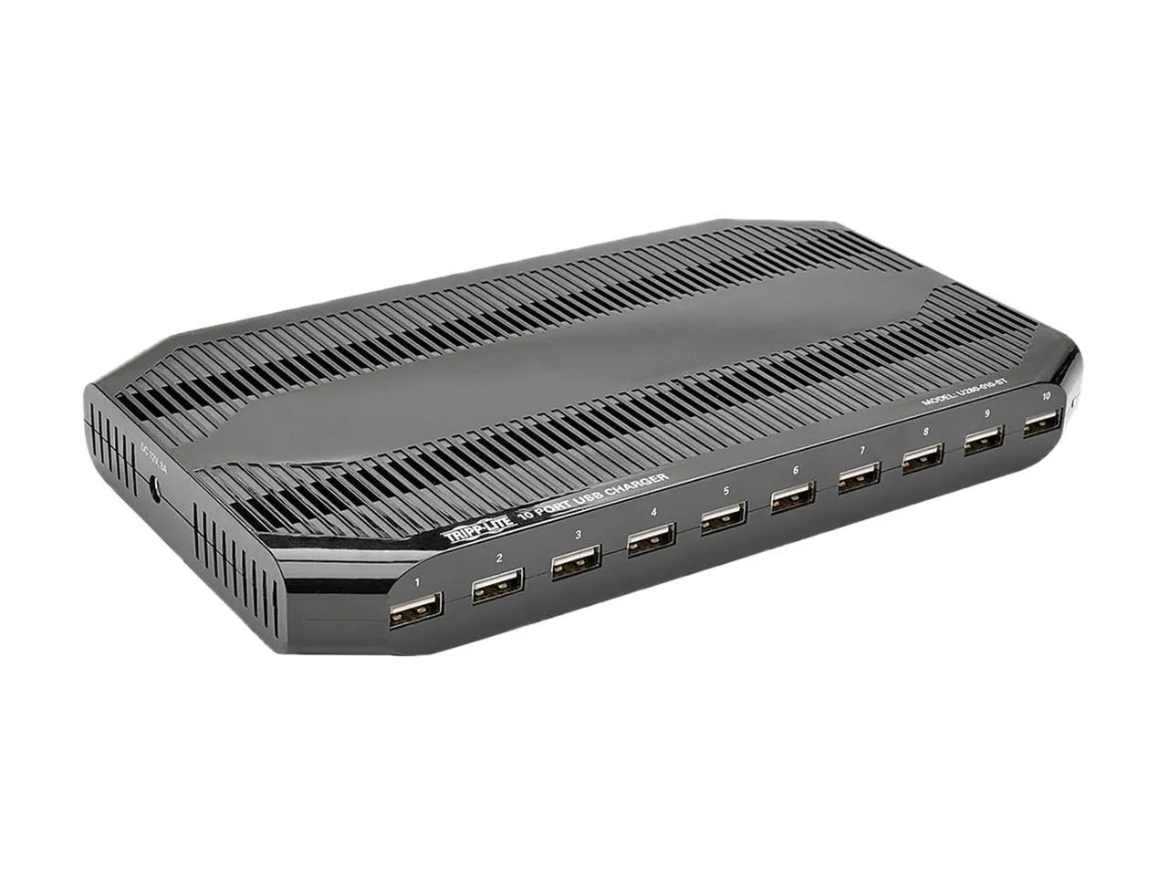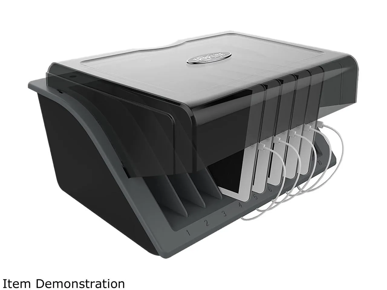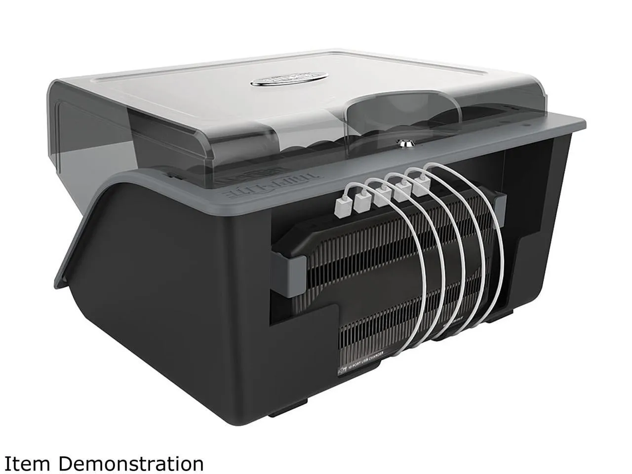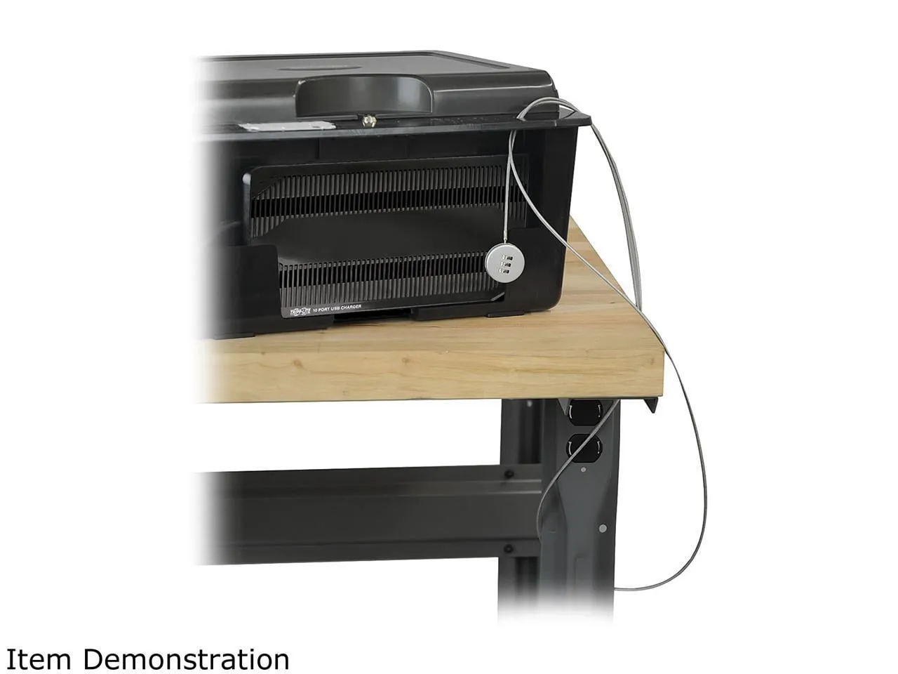 The CSD1006USB 10-Device Desktop USB Charging Station provides USB charging, secure storage and cord management for up to 10 tablets, laptops and e-readers up to 10.5 inches. It's recommended for schools, offices, warehouses, retail outlets, worksites, healthcare facilities and anywhere else multiple mobile devices are used. Your devices plug into the 10 USB ports as needed for proficient charging. The CSD1006USB delivers up to 5V 2.4A per port, which is plenty of power for charging battery-intensive devices. To protect your devices, the CSD1006USB prevents them from drawing more power than it is capable of supporting and stops charging a device when the device's battery is at 100%. The CSD1006USB locks with the included keys to help prevent theft, damage or tampering. A cable with combination lock is also included to secure the charging station to a desk, table, cart or other flat surface. The six-foot AC input cord with NEMA 5-15P plug helps you place the charging station in a convenient location. Storage shelf dividers are easily removed to accommodate thicker devices. Cabling is secured beneath the shelf tray to alleviate clutter