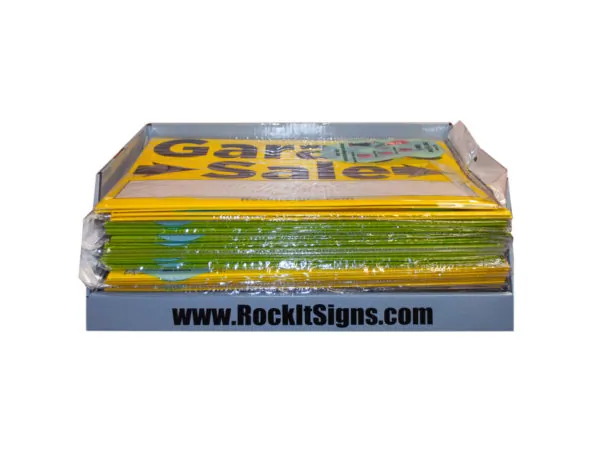 The RockItSigns Yard Sale Sign Assortment is the perfect way to attract customers to your garage or yard sale. Say goodbye to makeshift signs and welcome a professional look with these easy-to-assemble signs. With a clean design, they can be placed anywhere by using rocks or heavy objects for stability.