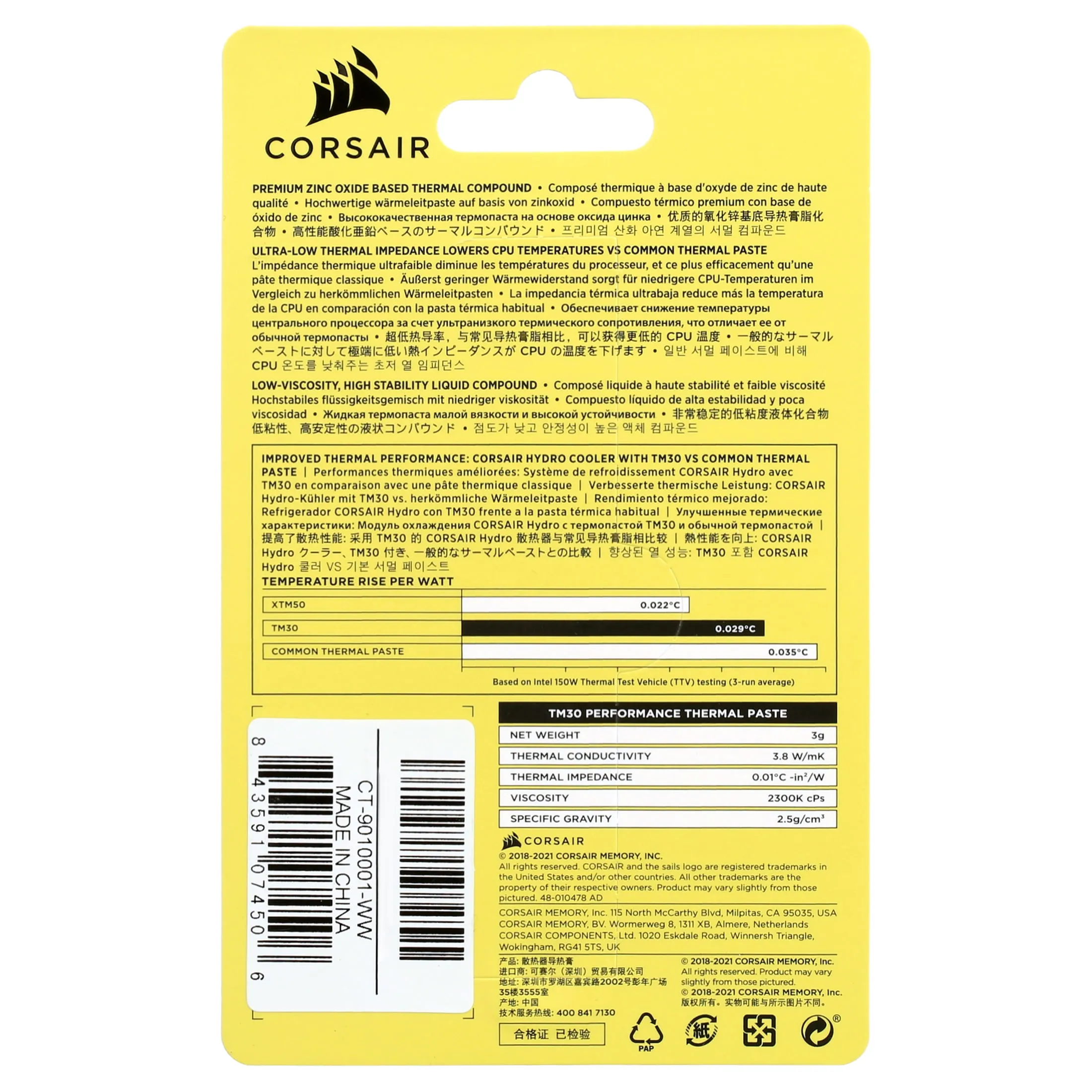 CORSAIR TM30 thermal paste helps you push your PC to its limit, with a low-viscosity premium zinc oxide thermal material that s easy to apply. TM30 s ultra-low thermal impedance ensures high-efficiency heat transfer between your hardware and cooler, lowering temperatures and allowing for higher clock speeds.