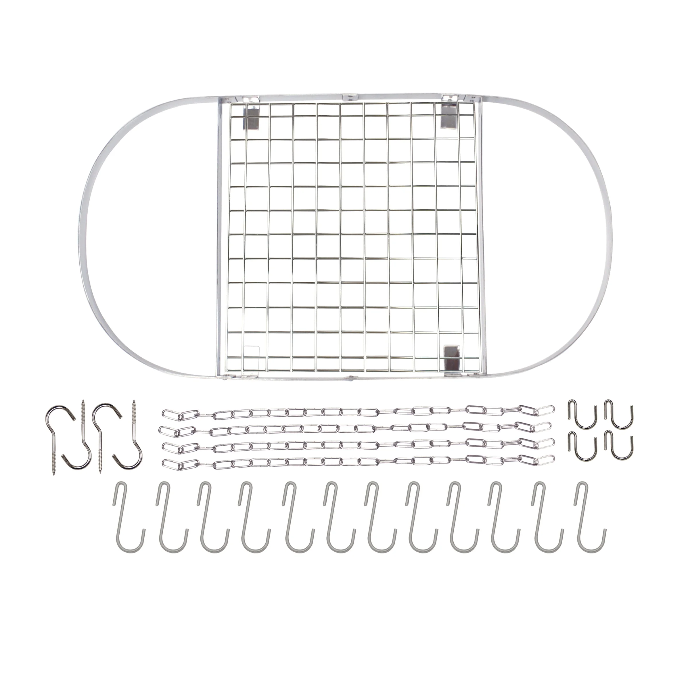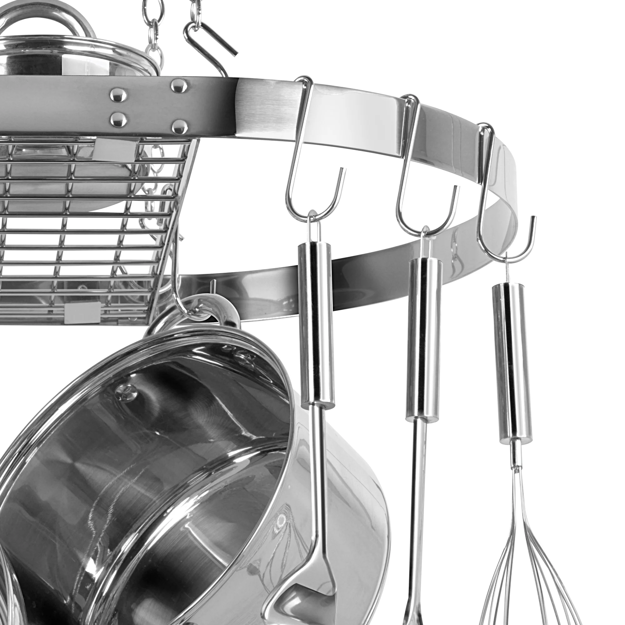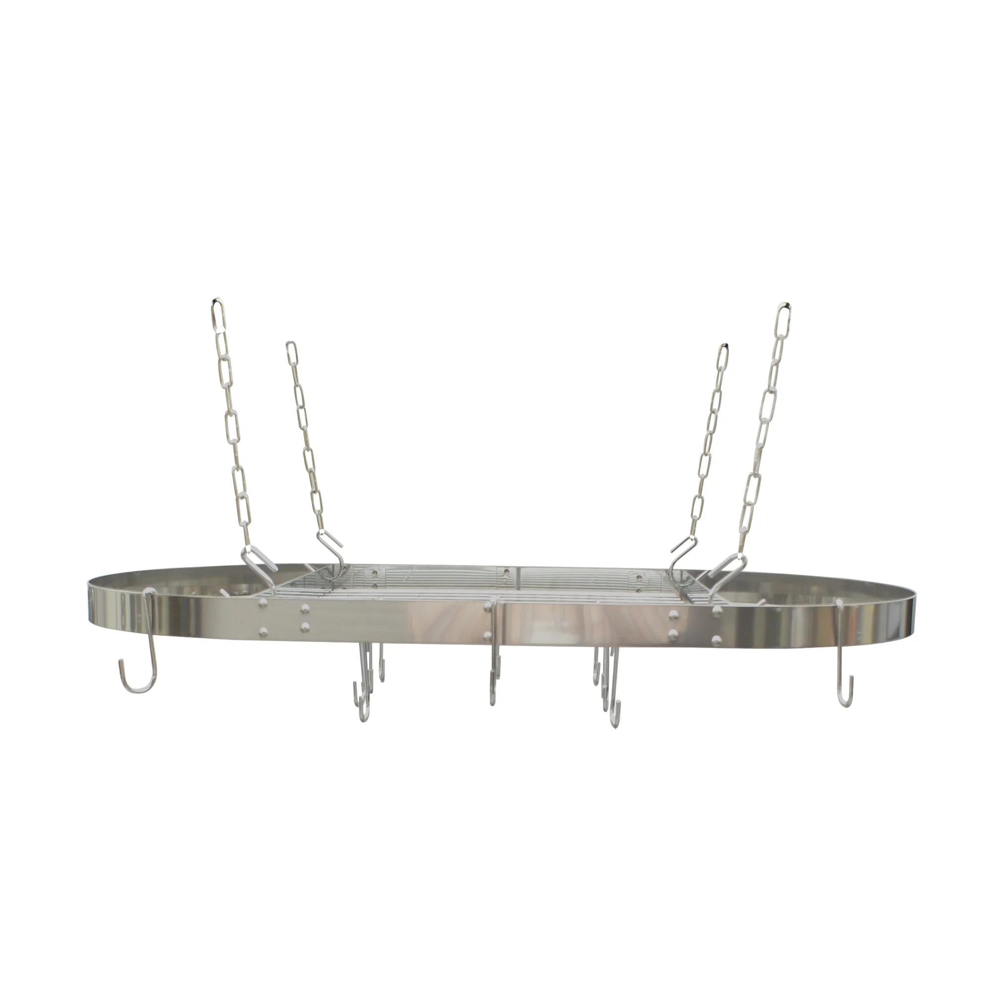 • Oval shape; upper shelf allows additional storage;• Prevents stacking damage;• Saves cabinet space;• Repositionable hooks;• Holds up to 40 lbs.;• Easy installation with included hardware;• Dimensions: 1.88 in. H x 34 in. W x 18.75 in. D;• Includes oval rack frame, grid shelf, 4 lengths of chain, 4 ceiling hooks, 4 rack hooks, and 12 pot hooks;• 5-year limited warranty;• Stainless Steel;