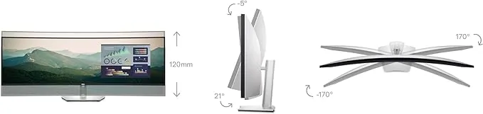 Experience no gaps in productivity One screen or two:Obtain seamless, multi-screen productivity with two 27" QHD partition capabilities complemented with exceptional color and contrast. Vibrant hues, sharp contrast IPS Black panel technology: Enjoy deeper blacks with the world's first 49-inch WQHD+ monitor with IPS Black panel technology that delivers exceptional contrast (2000:1) across a wide viewing angle. Equipped with 100% sRGB, 100% REC.709, 98% DCI-P3 and 98% Display P3 color coverage.Curved screen: Work comfortably with a curved screen that improves field of view andreduces reflection and eye fatigue.Enhanced eye comfort: ComfortView Plus is an always-on, built-in, low blue light screen that reduces potentially harmful blue light emissions without compromising color. Power your productivity Streamline your workflow: A single cable USB-C transmits data and video signals while delivering up to 90W of power.Fast and stable connection: Get up to 2.5GbE provided by RJ45 with PXE boot, Mac Address pass-thru and Wake on LAN features. RJ45 lock feature gives you the flexibility to lock the wired Ethernet to a chosen PC while continuing to work from dual PC inputs.Connect: A wide variety of devices are connectable with USB-A and USB-C Gen2 downstream quick-access ports that deliver speeds up to 10Gbps and DP1.4, HDMI and USB-C upstream ports. Starting is easy Quick connect: Conveniently located USB-C (up to 15W power) and USB-A ports make it easy to plug in external devices, and built-in dual 9W speakers saves you the hassle altogether.Dive right into your project: The built-in power sync feature wakes up and powers on your laptop. Power of two Internal Multi-Stream Transport (iMST): View your display across the full screen or split it into 2 x 27-inch QHD partitions with iMST. No external software or DisplayPort splitter needed.Multitask better: Connect to two PC sources and Auto KVM (keyboard, video, mouse) will seamlessly switch controls over to the second connected PC. Use KVM feature to control both PCs with a single keyboard and mouse. The KVM wizard makes setup a breeze. Set for comfort Work comfortably all day long by tilting, swiveling and adjusting your monitor height to however best fits you.
