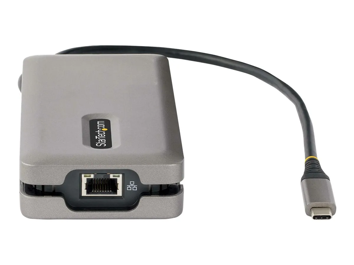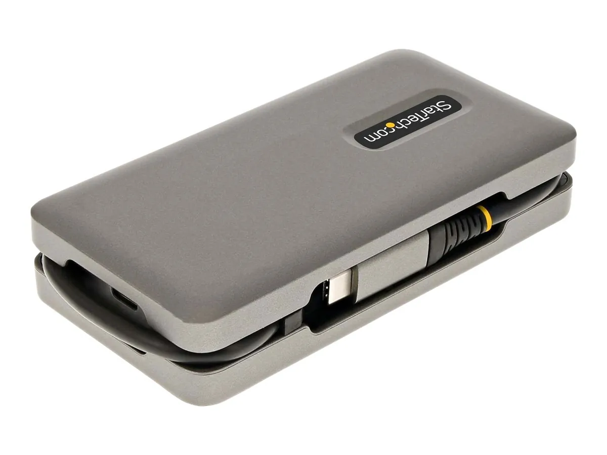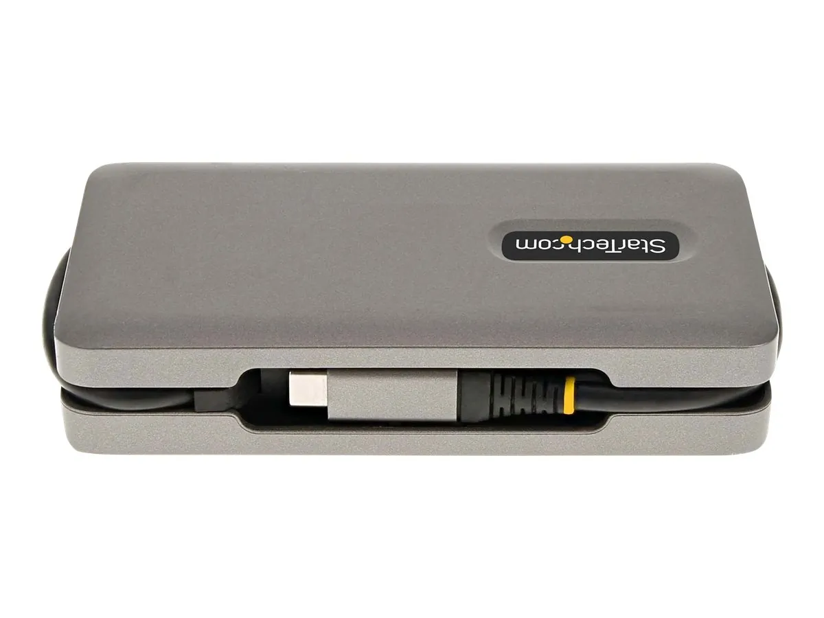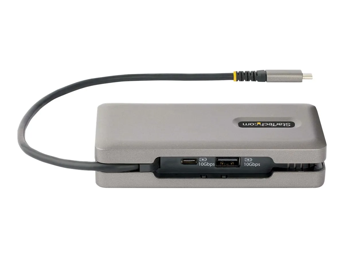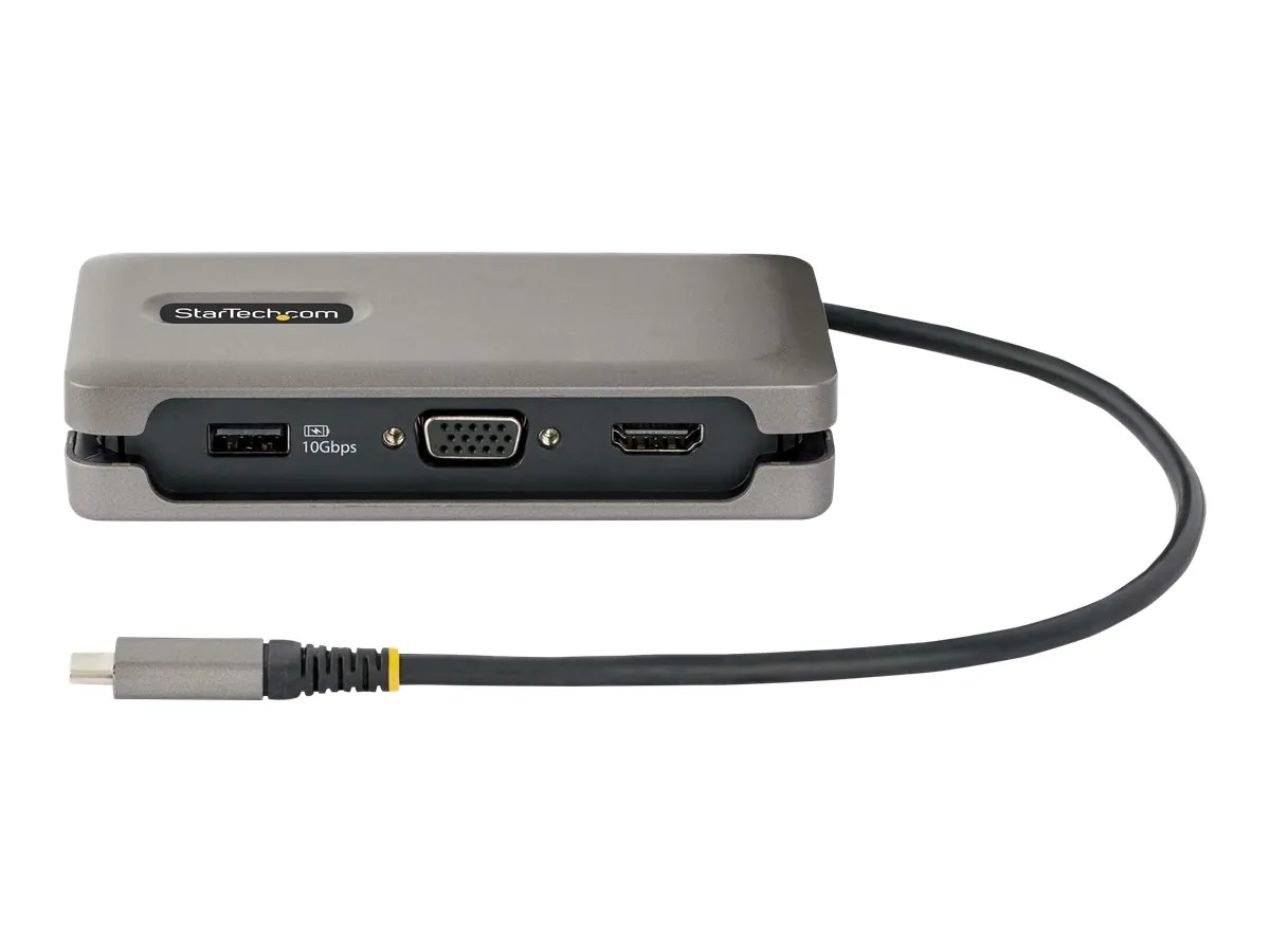 USB-C to HDMI/VGA multiport adapter supports single monitor video with 4K 60Hz HDMI 2.0b HDR10 or 1080p VGA - Thoughtful hideaway tethered design prevents cable clutter Attached 1ft/32cm USB-C host cable - 3-Port USB 3.2 10Gbps hub GbE (PXE Boot/WoL) - Portable travel docking station is bus powered or 100W Power Delivery pass-through (84W laptop charging) w/Type-C laptop power adapter - Mini Dock Works w/USB-C/Thunderbolt 3/4/USB4 host devices - Windows/Mac/iPad/Chrome/Android